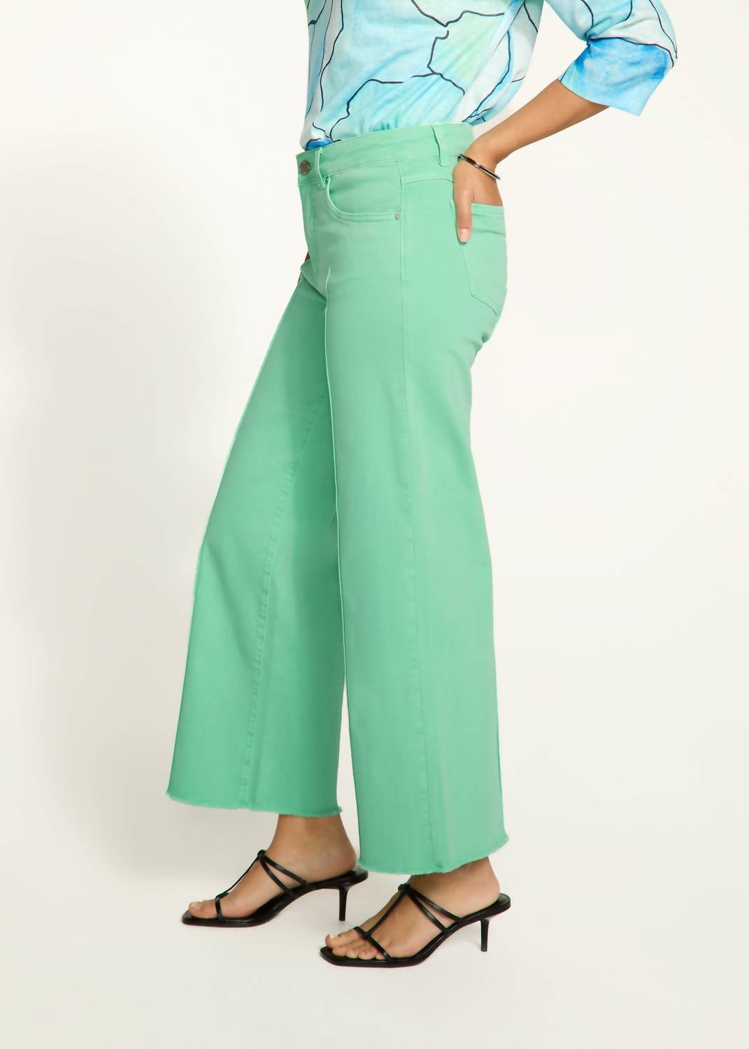 Pair these wide leg jeans with mules, slides or your favorite strappy sandals. Discover the Olivia Wide Leg Jeans by FDJ in a stylish Patina hue, perfect for capturing retro vibes this spring and summer. These mid-rise, relaxed-fit jeans boast a wide-leg style and a 28" inseam for a modern silhouette. Crafted from a durable cotton blend with 89% cotton, 10% polyester, and 1% elastane, these jeans ensure both comfort and flexibility. Featuring a zip closure and pockets, they are easy to maintain with machine wash and tumble dry care instructions.
