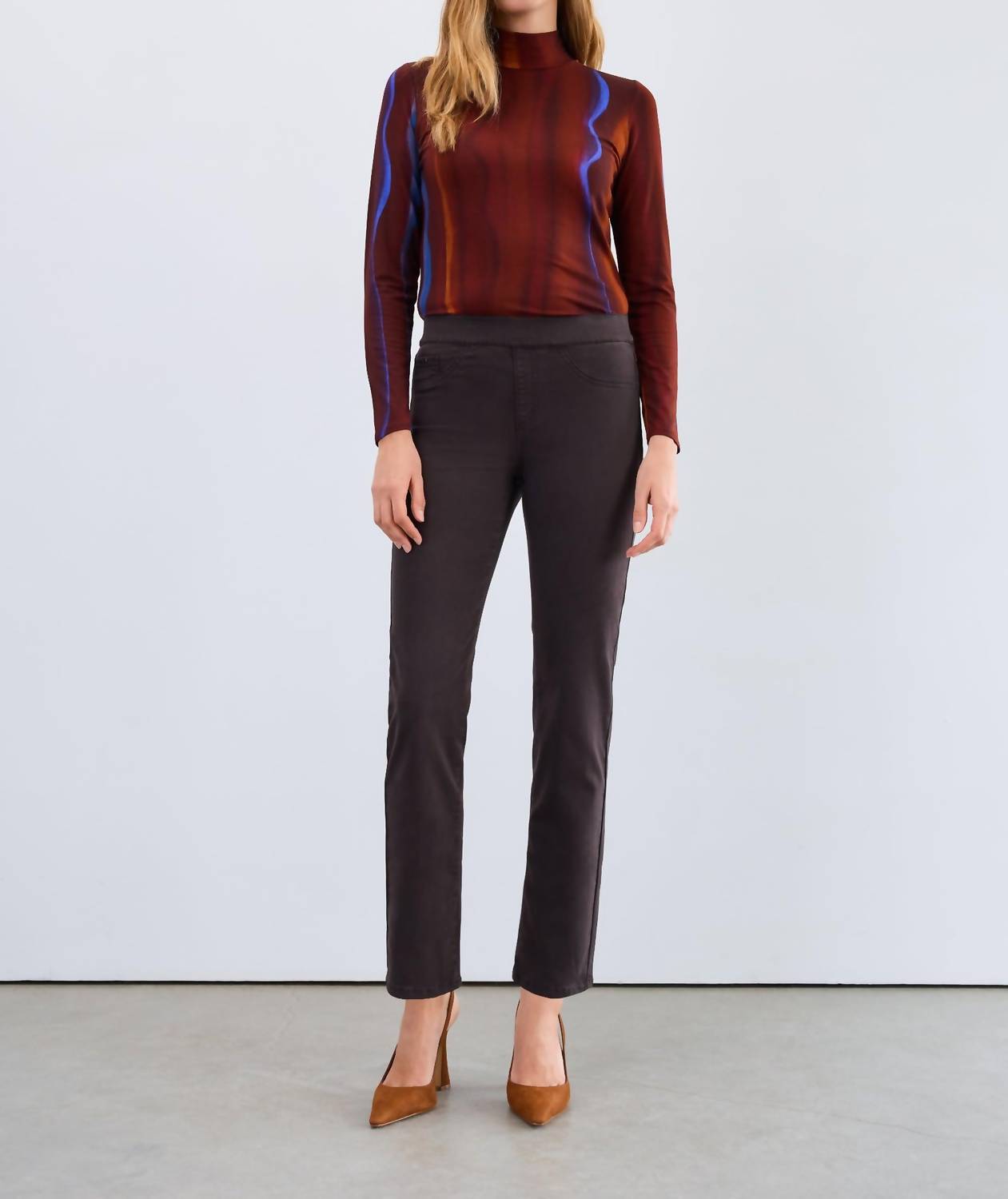 Discover the FDJ Pull-on Straight Ankle Denim Jeans, a stylish choice in rich brown for the modern woman. These full-length, cotton blend jeans feature a pull-on closure and a flattering straight leg design, complemented by a solid, dark wash finish. The high-rise waist and stretchy fabric ensure comfort, while functional back pockets add practicality. Simply machine wash inside out and line dry to maintain their sleek appearance; inseam measures 28 inches. 89% Cotton, 10% Polyester, 1% Elastane.