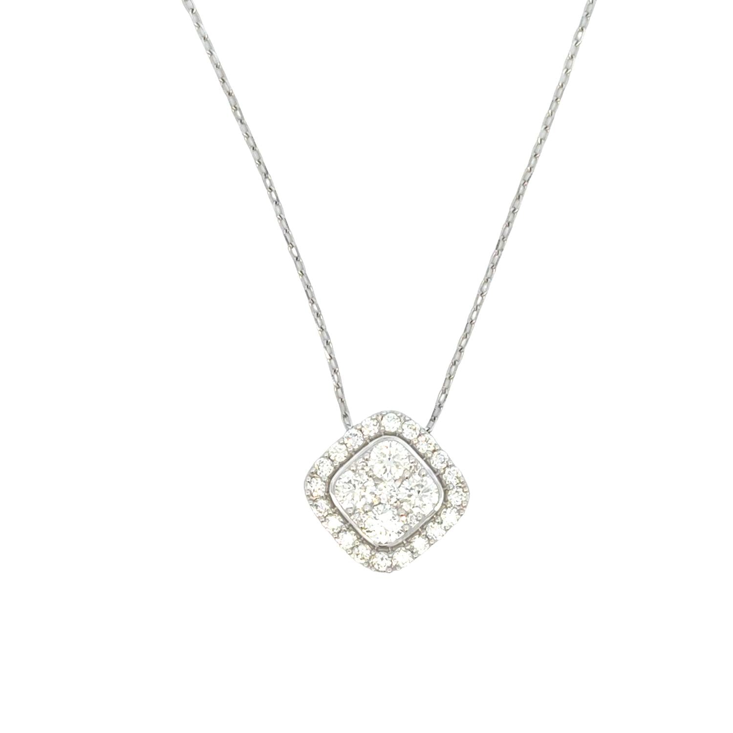 Elegant cushion-shaped pendant featuring 1.00 carat of natural round brilliant cut diamonds in a sophisticated cluster design. The center cluster of round brilliant diamonds is surrounded by a sparkling cushion-shaped halo, creating exceptional brilliance and visual impact. Crafted in 14k white gold (2.10 grams) with secure prong settings that maximize light reflection. This timeless design offers classic elegance perfect for special occasions or adding sophistication to everyday wear. Key Features: 1.00 total carat weight natural diamonds. Round brilliant cut diamonds throughout. 14k white gold construction (2.10 grams). Cushion halo setting with cluster center. Classic pendant design. Perfect for layering or wearing alone.