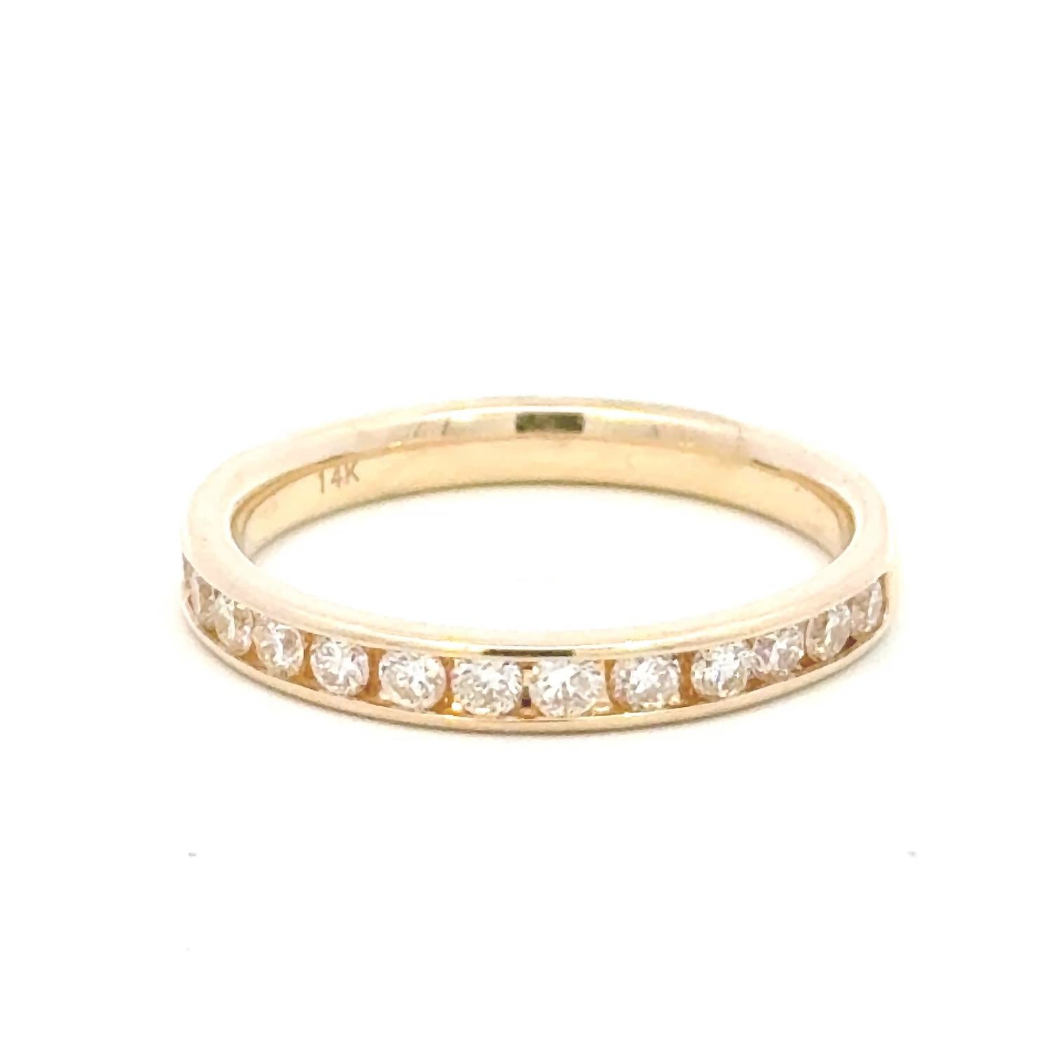 Stacked or solo - you can't go wrong with this bracelet. Classic channel-set band size 6.5 featuring 0.52 carats of natural round brilliant cut diamonds in a continuous row. The diamonds are securely set in a smooth channel between protective metal walls, creating a sleek and elegant appearance. Crafted in 14k yellow gold (2.30 grams) with secure channel settings that maximize brilliance while protecting the stones. This timeless design offers classic elegance perfect as a wedding band, anniversary ring, or sophisticated stacking piece. Key Features: 0.52 total carat weight natural diamonds. Round brilliant cut diamonds throughout. 14k yellow gold construction (2.30 grams). Channel setting. Eternity/anniversary band design. Perfect for stacking or wearing alone.