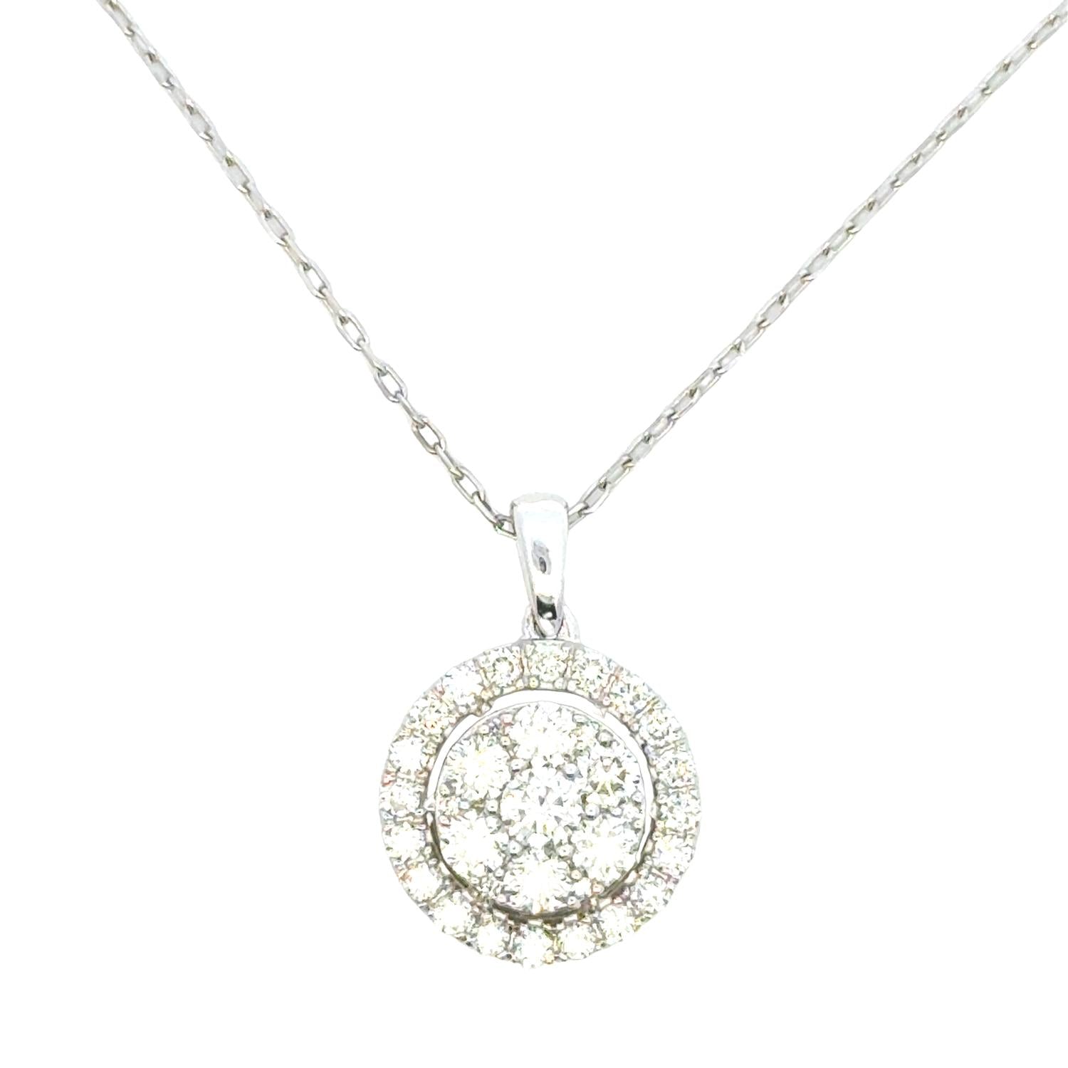Classic halo pendant featuring 1.00 carat of natural round brilliant cut diamonds. The stunning center diamond is surrounded by a sparkling halo of smaller round brilliant diamonds, all secured in traditional prong settings that maximize brilliance and fire. Crafted in 14k white gold (2.25 grams) with a polished bail for smooth chain movement. This timeless design offers exceptional sparkle and elegance, perfect for everyday wear or special occasions. Key Features: 1.00 total carat weight natural diamonds. Round brilliant cut center stone with round brilliant halo. 14k white gold construction (2.25 grams). Halo setting with prong details. Classic pendant design. Perfect for layering or wearing alone.