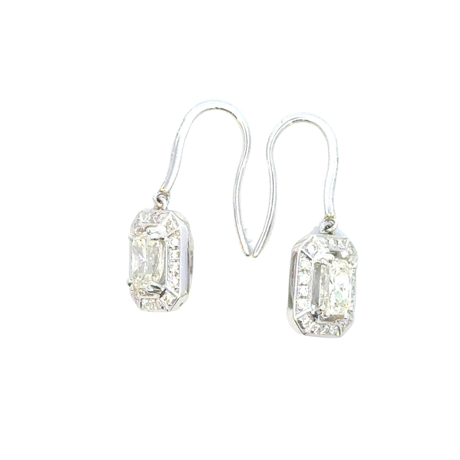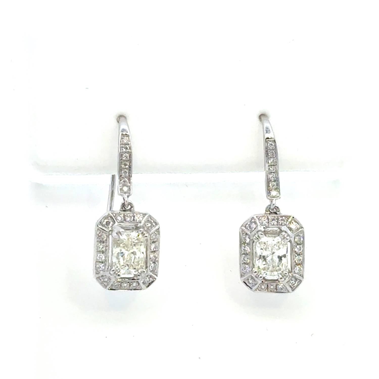 Classic earrings that will take you from season to season. Elegant drop earrings featuring 1.51 carats of natural diamonds with stunning emerald-cut center stones. Each center diamond is surrounded by a sparkling halo of round brilliant diamonds, with additional diamonds adorning the lever-back hooks. Crafted in 18k white gold (3.82 grams) with secure prong and halo settings that maximize brilliance and fire. These sophisticated earrings offer timeless elegance perfect for special occasions or adding luxury to everyday wear. Key Features: 1.51 total carat weight natural diamonds. Emerald cut center stones with round brilliant accents. 18k white gold construction (3.82 grams). Halo setting with lever back closures. Drop/dangle earring design. Perfect for formal occasions or elegant everyday wear.
