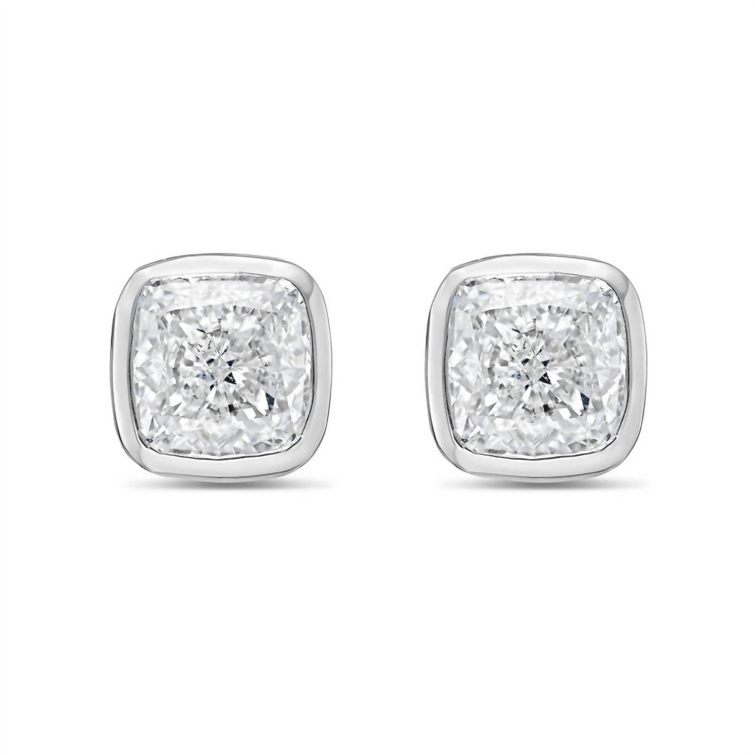 eye-catching earrings for every occasion. These sophisticated stud earrings showcase cushion-cut lab-grown gemstones with a total weight of approximately 3.00 carats. Each gemstone is elegantly secured in a sleek bezel setting, emphasizing its classic shape and modern elegance. A versatile and timeless pair, ideal for both everyday wear and special occasions.