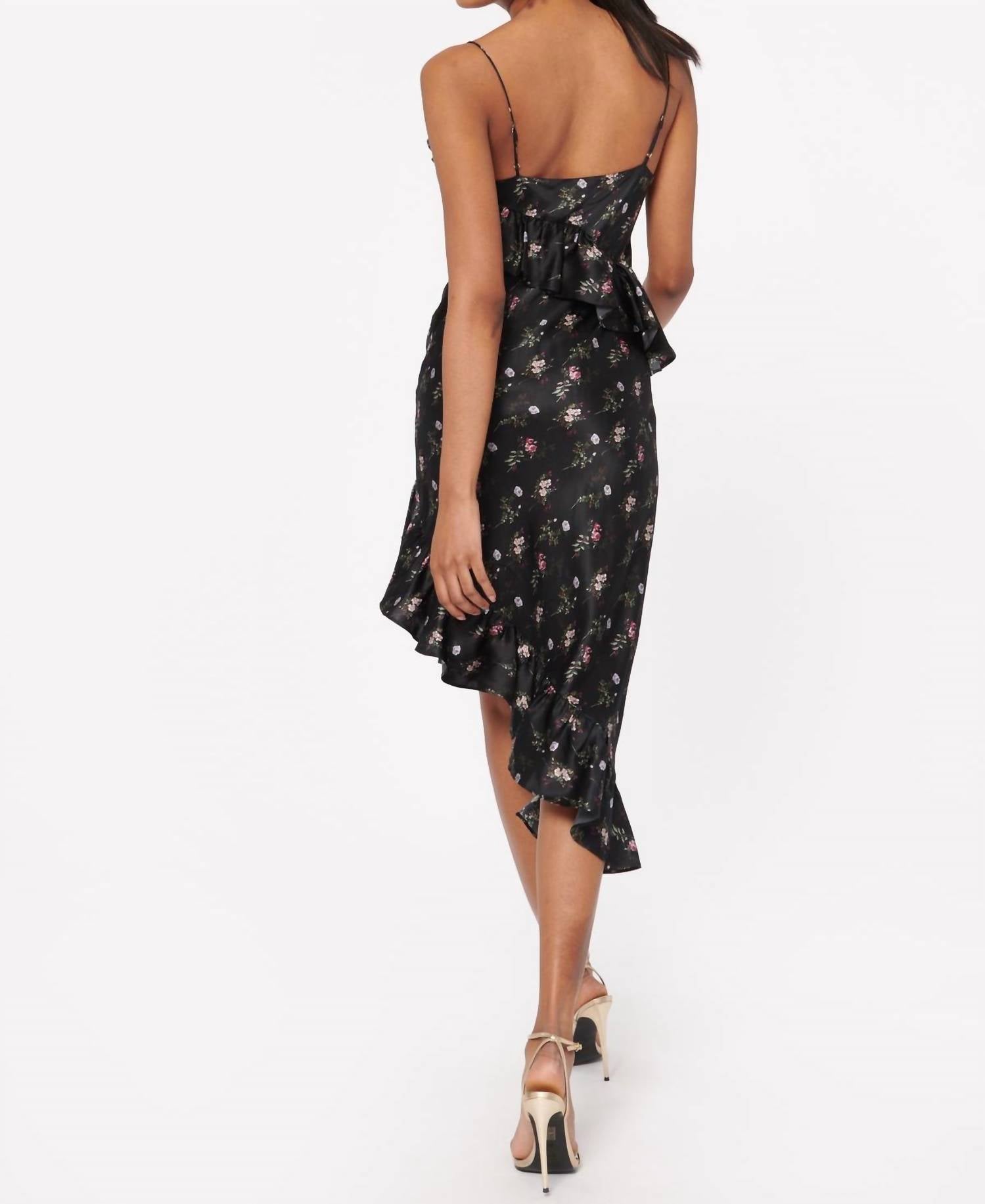 Make a memorable entrance with the Dua Dress by Cami NYC, perfect for any occasion. This Evening Bouquet floral sheath dress features a v-neckline with spaghetti straps and a stylish high-low midi length. Crafted in luxurious 100% Silk, it boasts a stunning asymmetrical hem with a tiered ruffle cascade and swingy ruffle trim. Embrace the essence of spring fashion with this quiet luxury piece, ideal for a dinner party or New Year's Eve celebration.