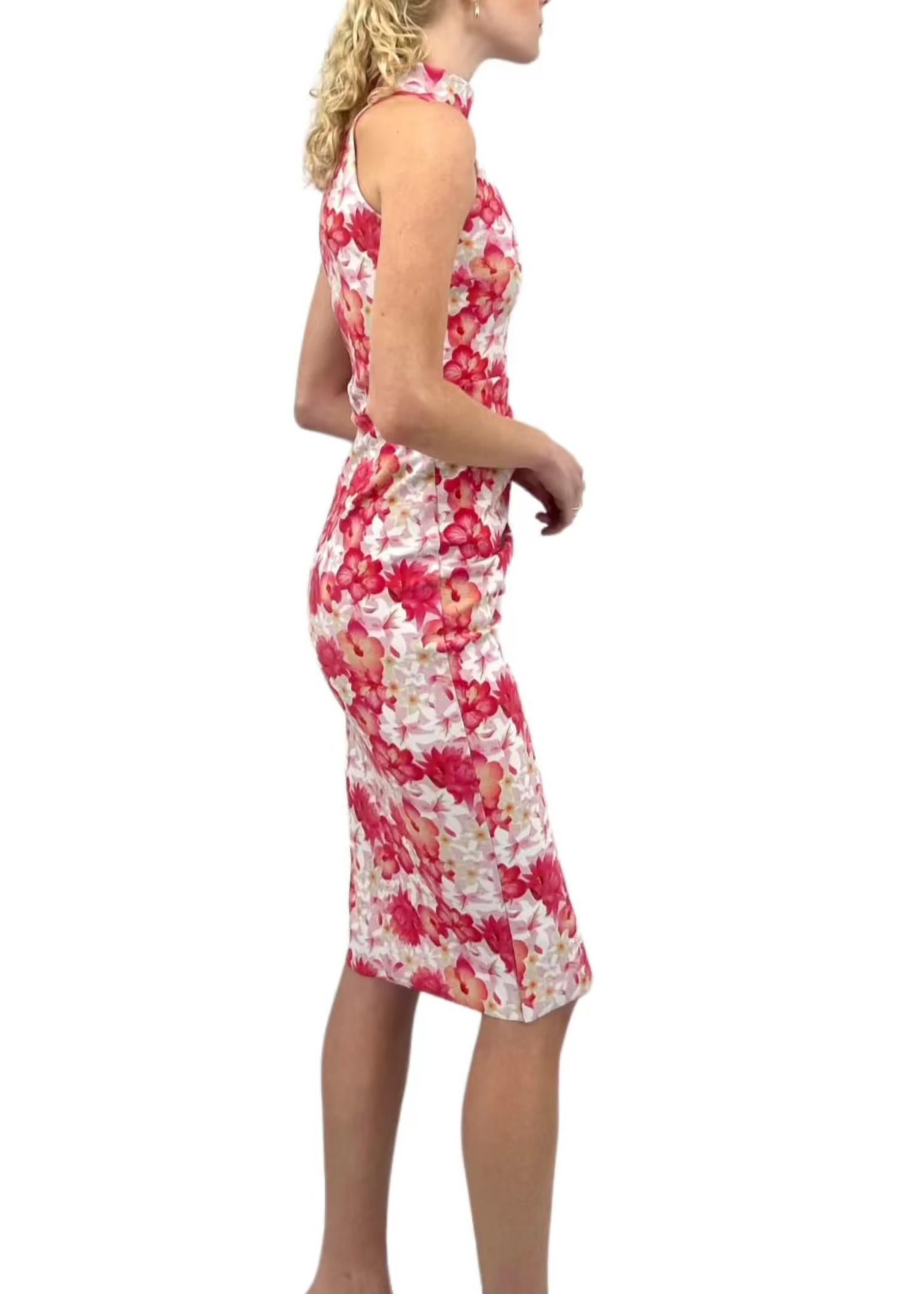 Just add slides or mules and you are good to go. Experience the sophisticated charm in elegant Pink Fantasia. Made from 72% polyamide and 28% elastane. Designed to enhance your figure with a fitted sheath silhouette and stylish high neck. Features a concealed zip closure and playful side ruffle. Finishing at a graceful 45 inches from the back of the neck to hem. Care for this exclusive piece with a gentle hand wash.