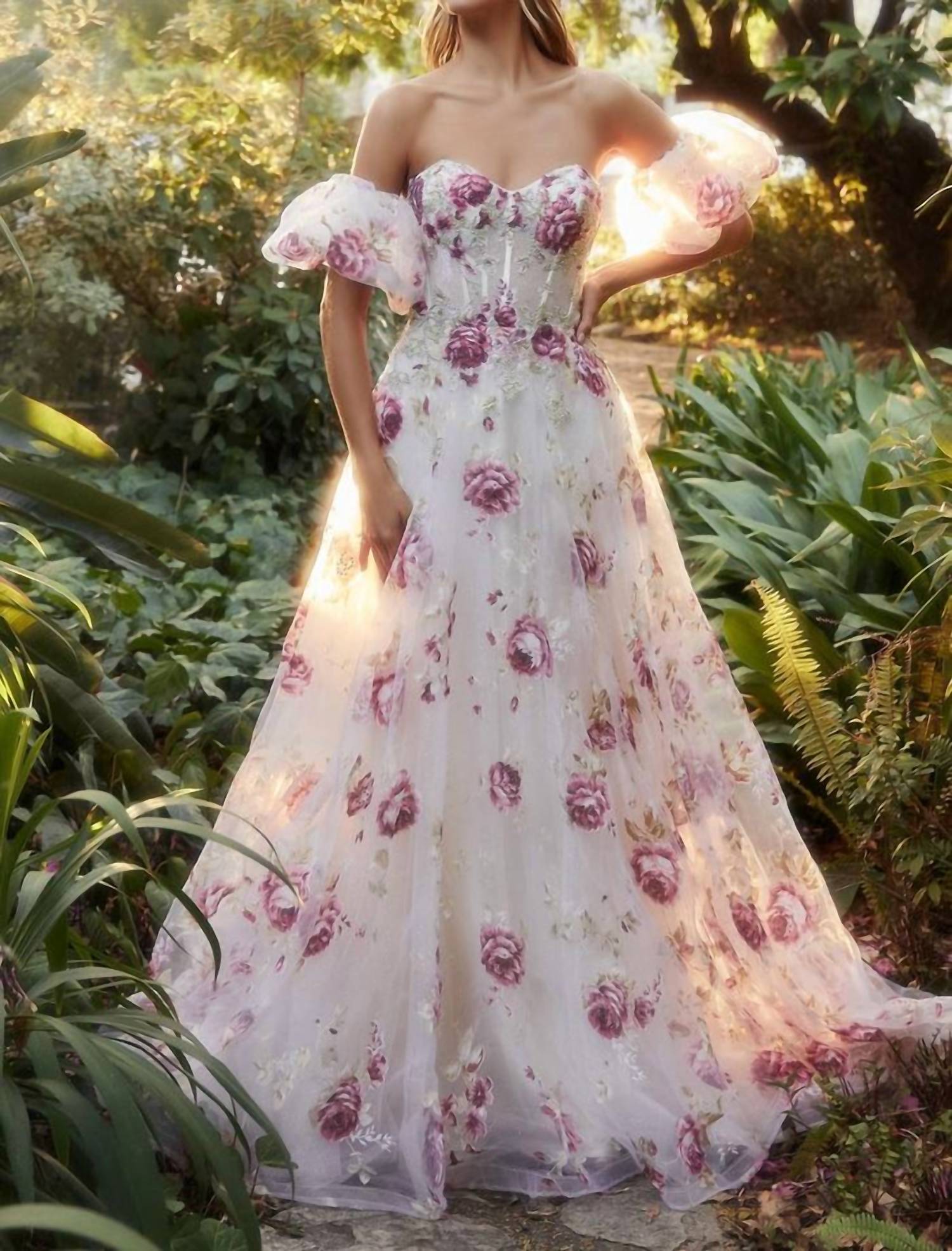 Looking for that perfect event dress? Look no further... This strapless ball gown features a sheer, boned bodice adorned with coordinating hot stones for a touch of sparkle. Crafted from layered organza, the full floor-length skirt showcases a vibrant peony print on an off-white background. Detachable puff sleeves add versatility and a dramatic flair, creating a romantic and fairytale-inspired silhouette.