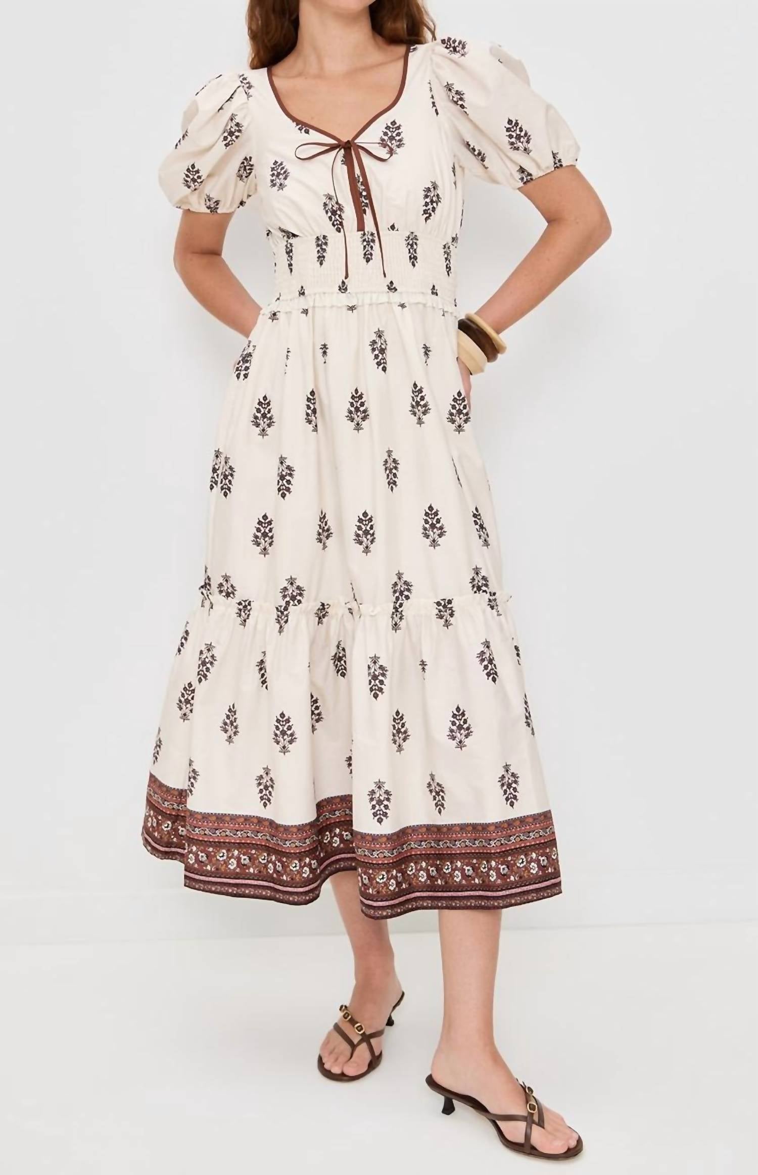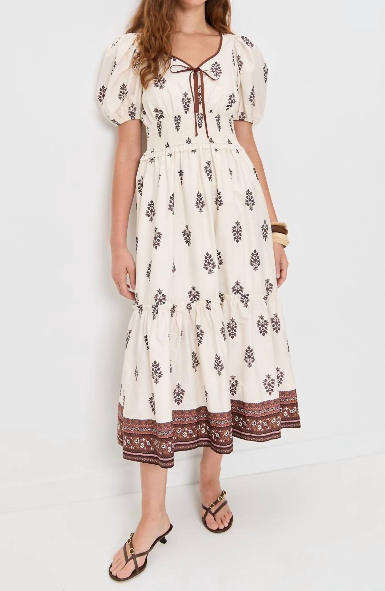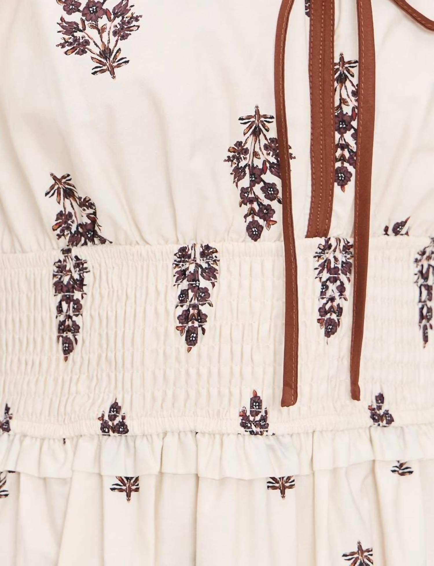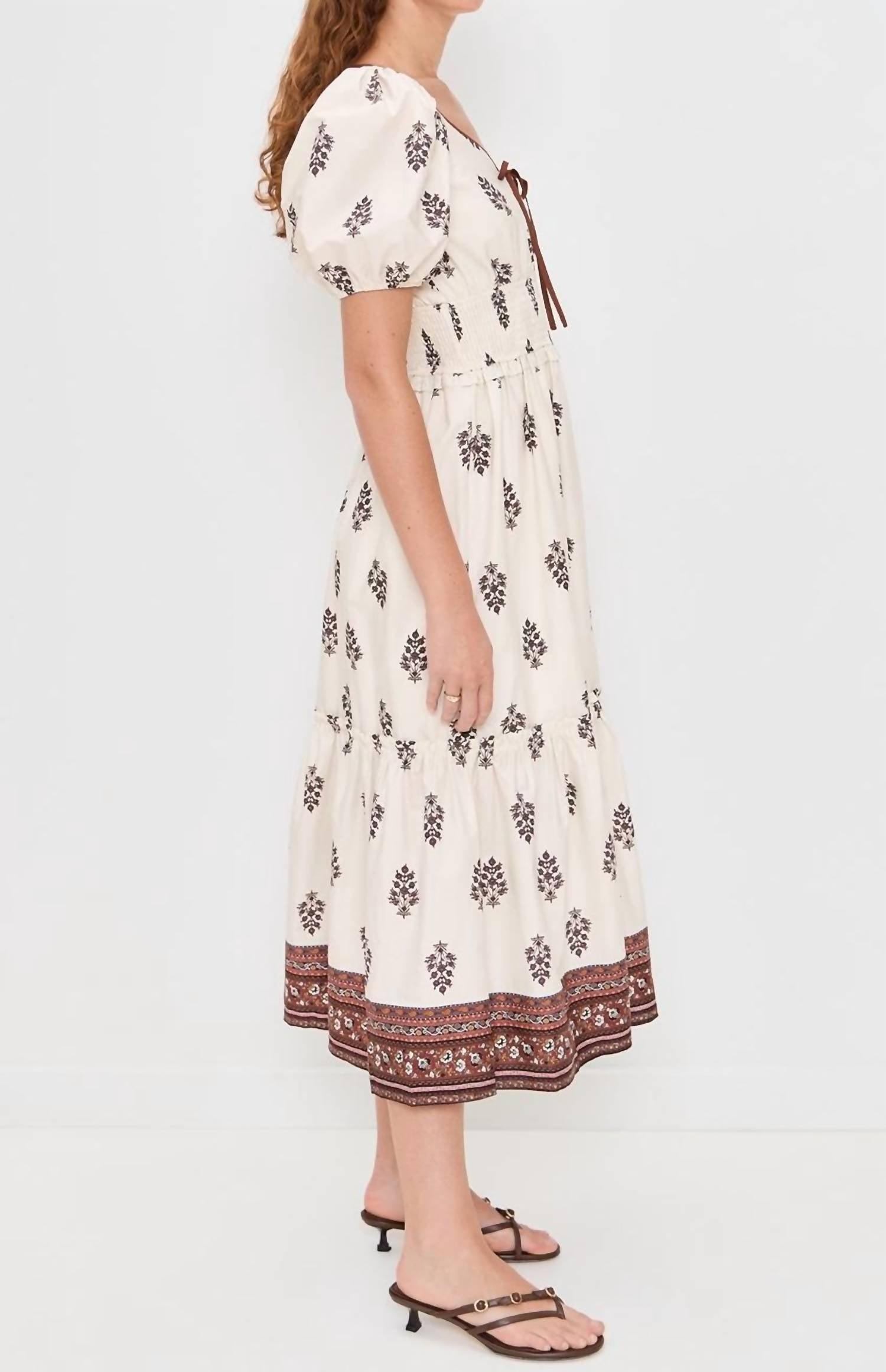 Just add slides or mules and you are good to go. Unveil a touch of enchantment with the Puff Sleeve Pleated Midi Dress by MOON RIVER, crafted from breathable cotton in a delightful cream multi floral pattern. This A-line midi dress features charming short puff sleeves and a flattering smocked waist, enhancing your silhouette with a feminine, boho chic flair. Designed with a playful ruffle hem and a flirty front tie detail, it's the perfect choice for summer occasions, travel, and even Thanksgiving festivities.