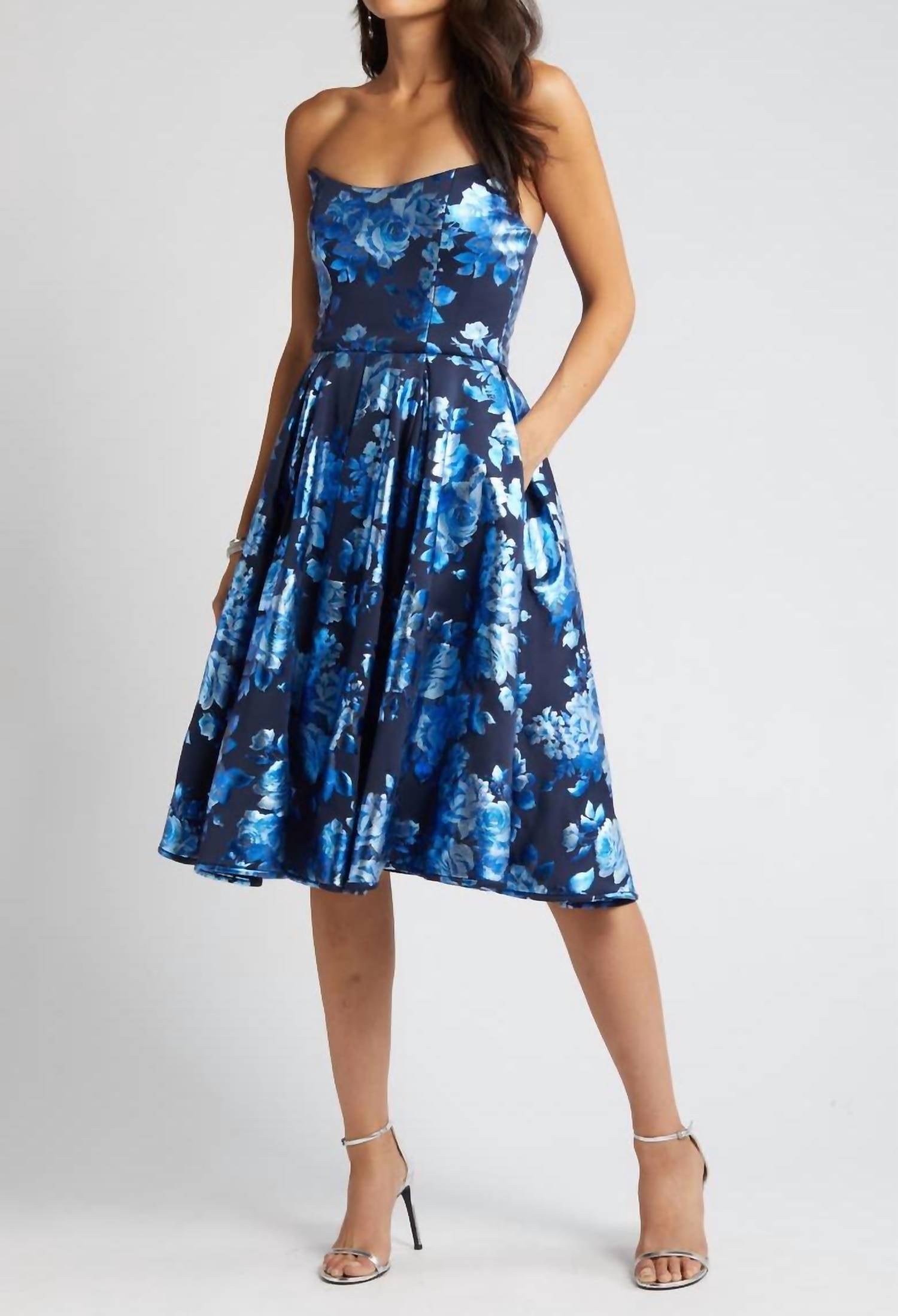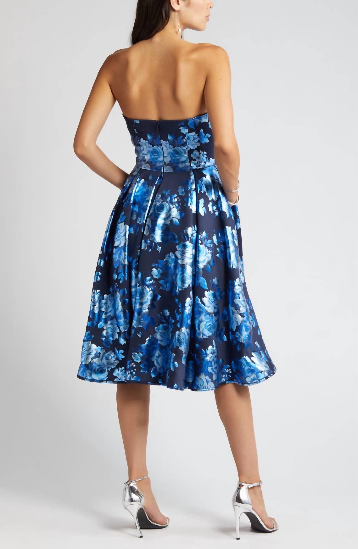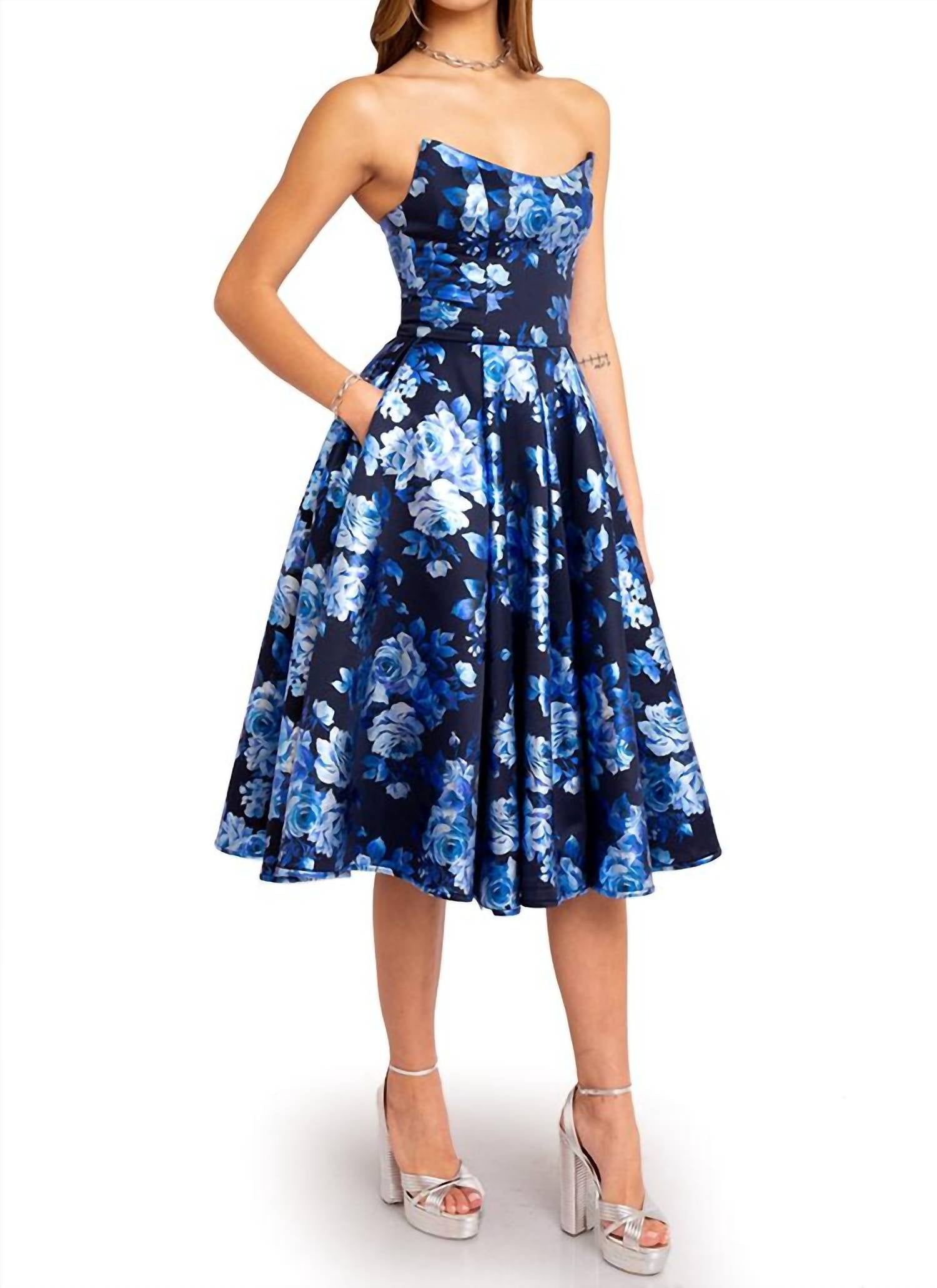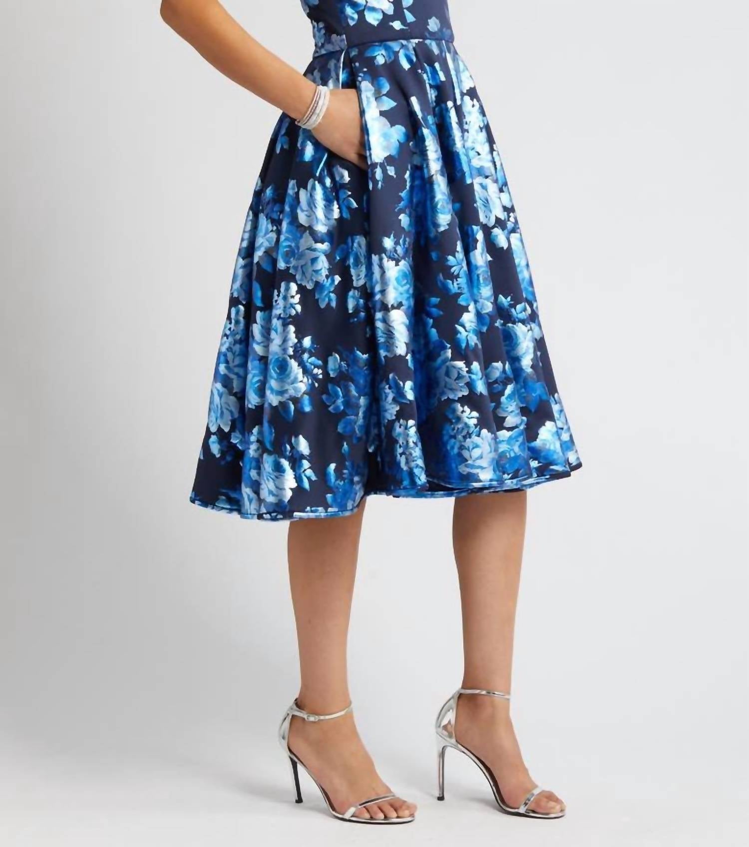 The perfect length dress does exist. Discover timeless elegance with the Clara Dress by Black Halo, a must-have for your special occasions. This strapless fit and flare midi dress showcases a gorgeous off-the-shoulder neckline and is adorned with a striking navy and crystal blue floral print. Crafted from premium polyamide, it effortlessly flatters with a full skirt and practical pockets. Closure: Zip closure. Care: Dry clean. Made in the USA.