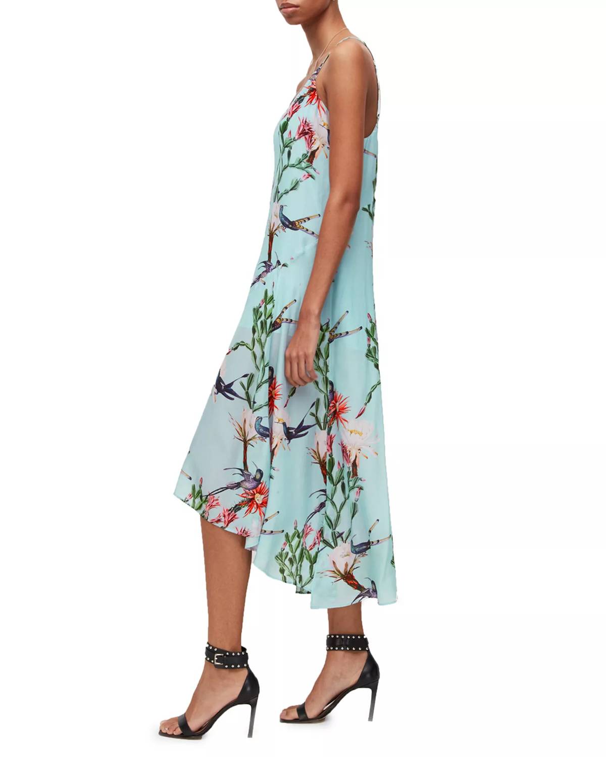 When you can't decide between length, the high-low dress is the way to go. Presenting the Essey Senja Sleeveless Hi-low Dress by AllSaints, a vibrant floral masterpiece in blue, green, and pink. This dress features adjustable spaghetti straps and a flattering V-neck, creating a chic trapeze silhouette. Crafted from 100% viscose, it showcases an asymmetrical high/low hem designed to hit mid-calf. Made in India with a pull-on style, this dress requires dry cleaning for optimal care, making it an ideal choice for summer vacation wear.