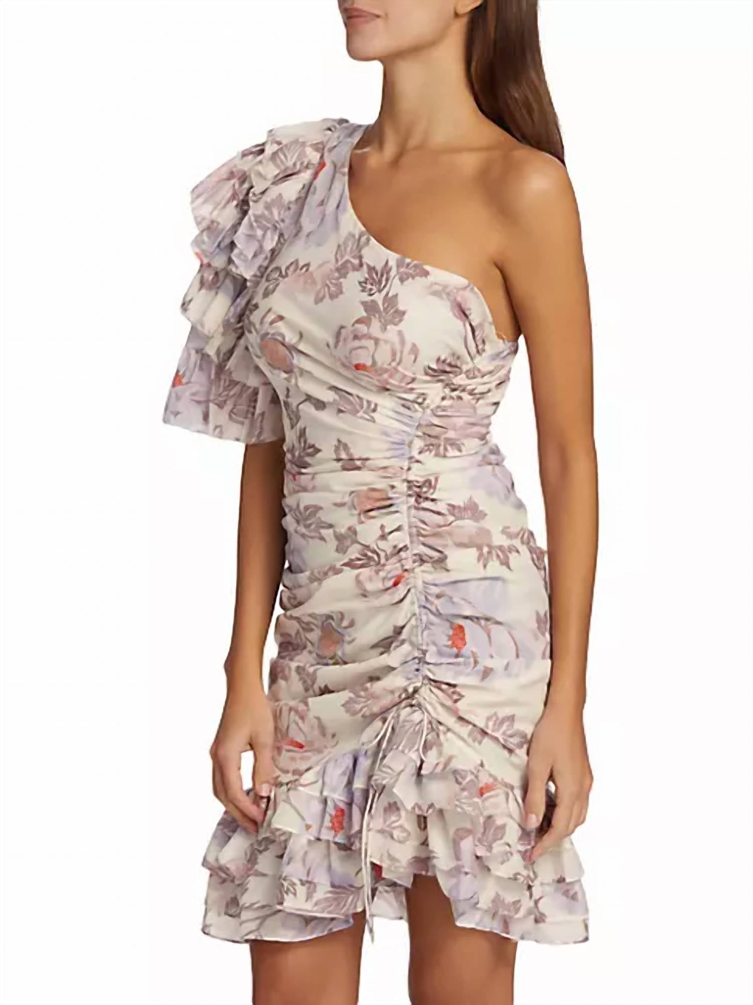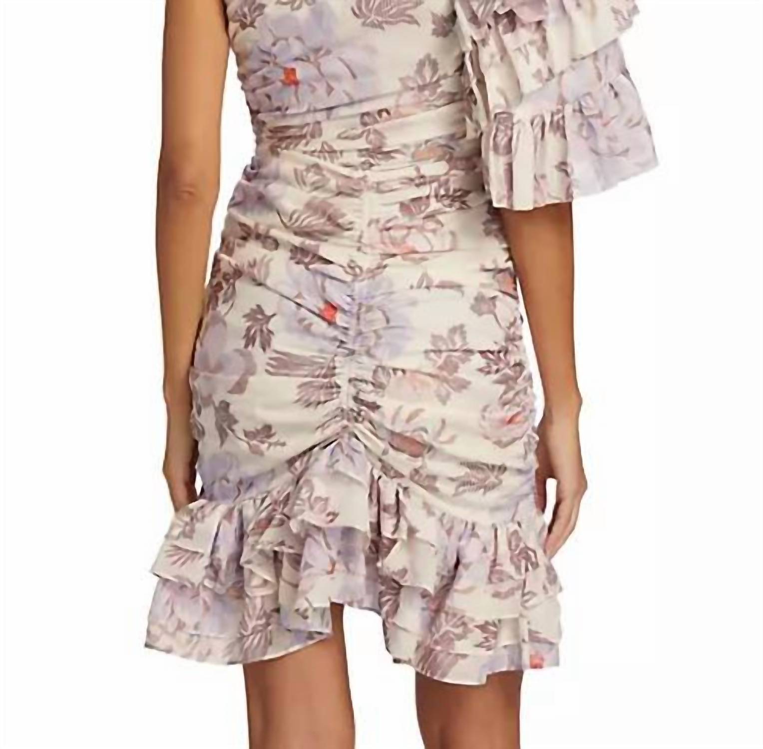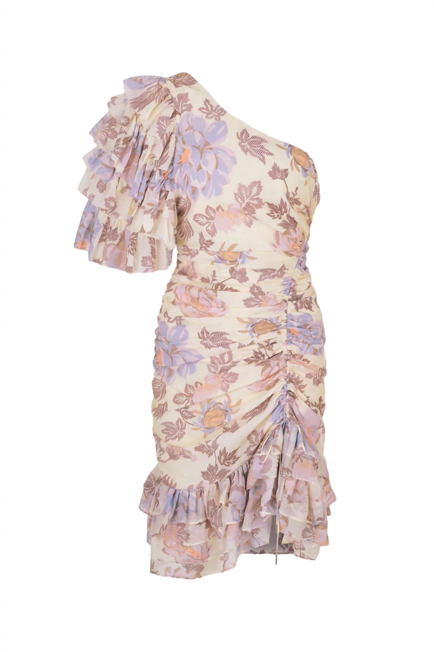 The Desa Dress by Magali Pascal features an off-the-shoulder design with signature ruffle details on one sleeve. Its asymmetric shape allows for adjustable length, making it versatile for different styling preferences. Composition: 70% cotton, 30% silk. The model is wearing a US size Small. Care: It's recommended to cold, gentle machine wash, avoid bleach, cold iron on reverse, and refrain from tumble drying.
