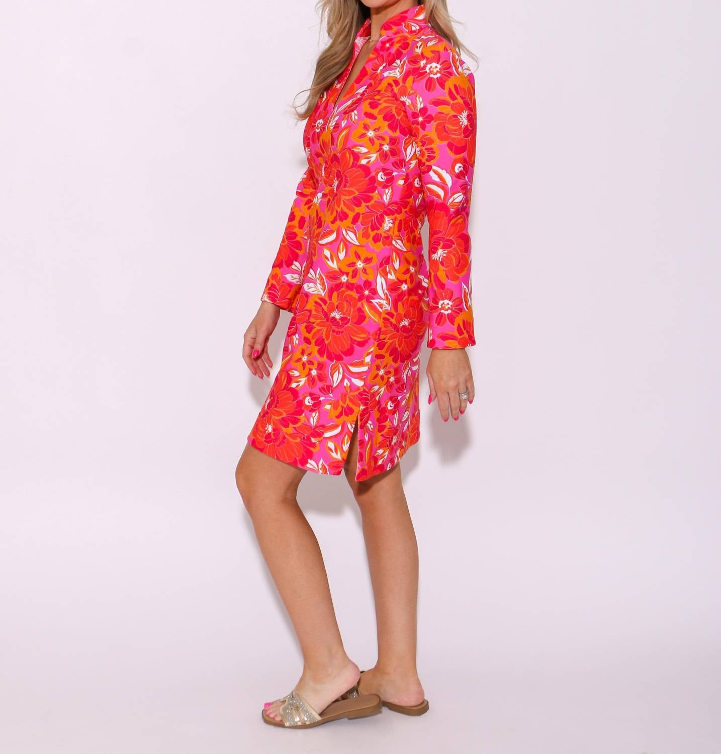 A short and breezy dress for those warmer days. Discover the Kate Dress I by JUDE CONNALLY, a charming addition to your wardrobe in Peony Dream Pink. This floral mini dress features a V-neckline and three-quarter sleeves, perfect for a blend of elegance and comfort. Made in the U.S.A., it offers a convenient pull-on closure for ease of wear. Care instructions include machine washing and line drying, making it both stylish and practical for spring holiday parties and workwear.