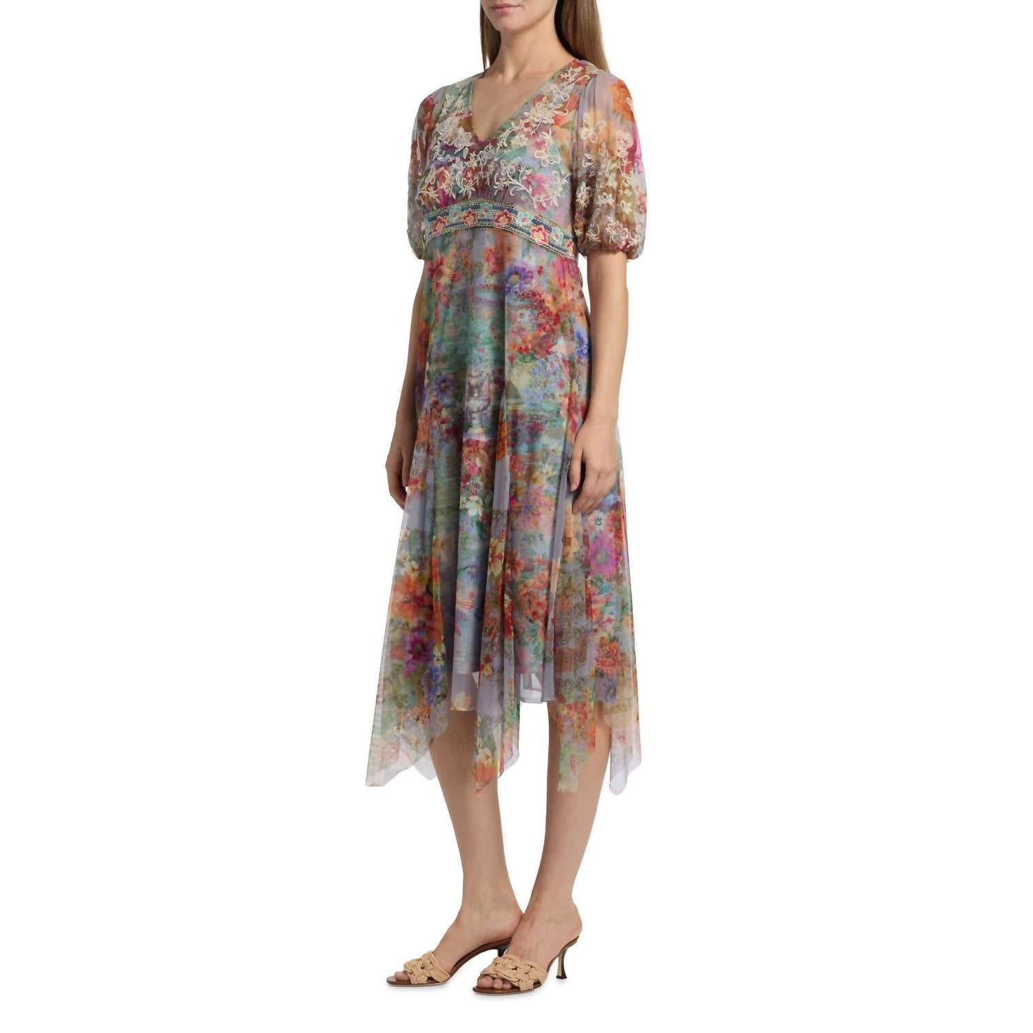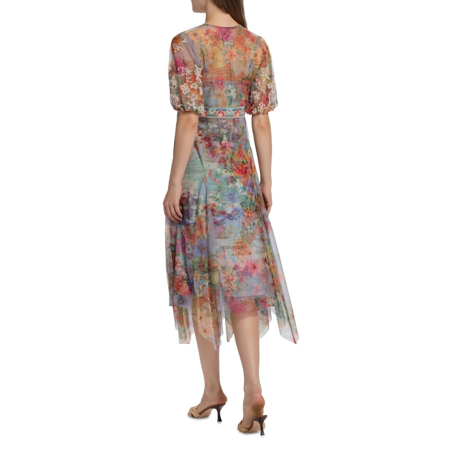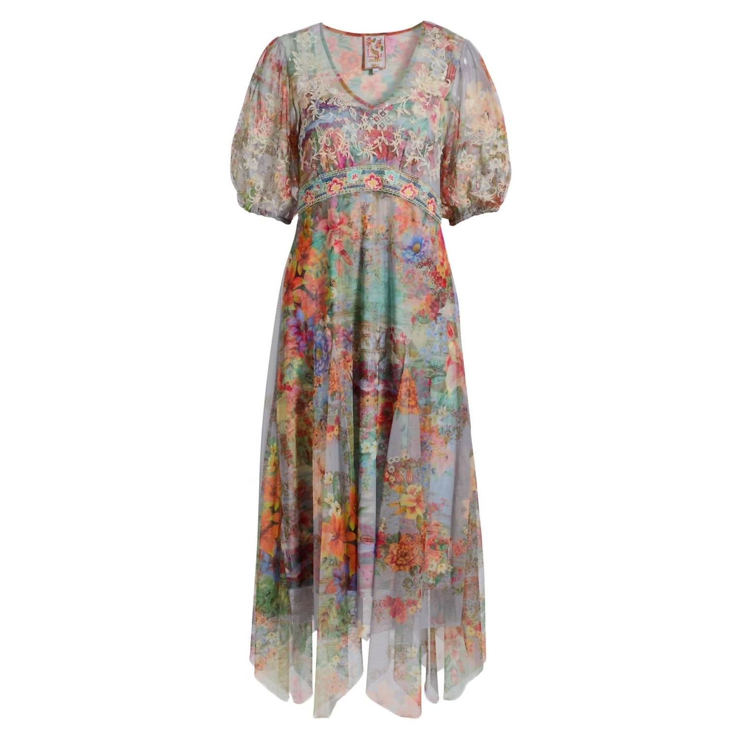Just add slides or mules and you are good to go. Experience bohemian elegance with the Sally Mesh Dress by Johnny Was, a sophisticated yet free-spirited piece in a vibrant Asteria hue. This short-sleeve A-line dress features a whimsical mesh overlay crafted from airy nylon, complete with intricate floral embroidery on the bust and short puff sleeves. Designed with a chic handkerchief hem, this 48-inch V-neck beauty is perfect for a spring anniversary event. Closure: Pull on. Care: Hand wash.