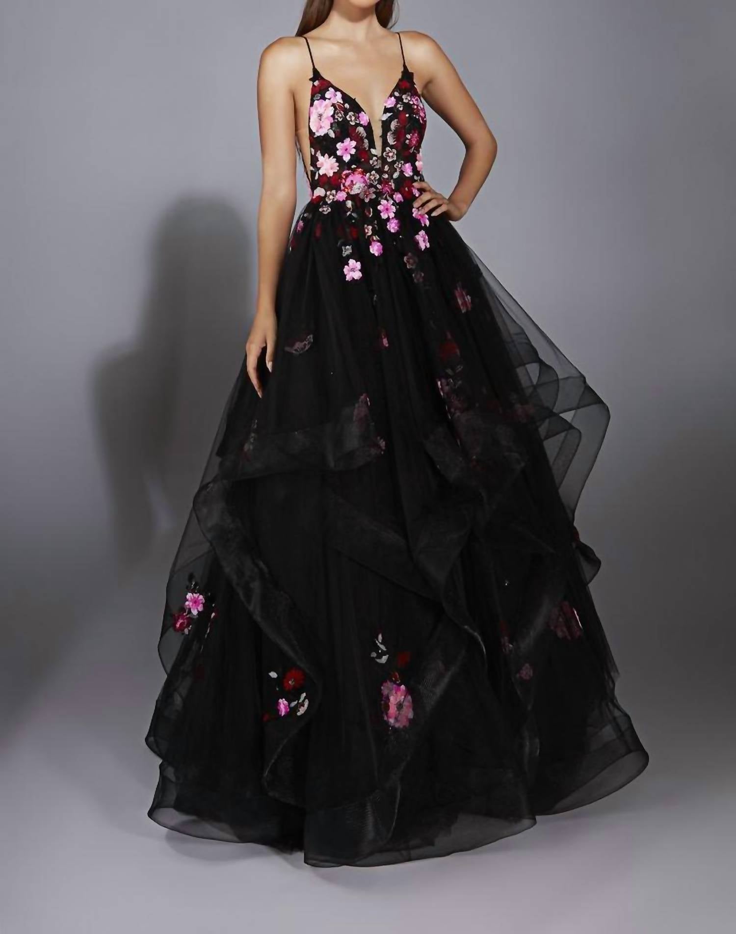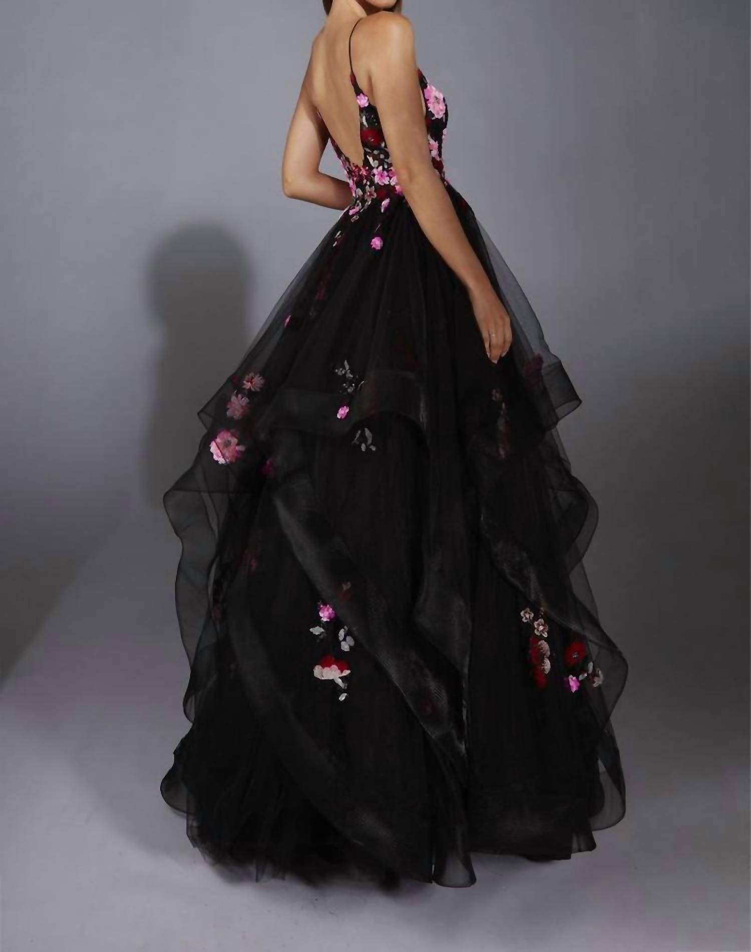 Turn heads in the cutest and most flattering evening dress. Captivating choice for prom. Combines spaghetti straps with a corset bodice, featuring a deep plunging V-neckline and an open V-back. Crafted from tulle and adorned with multicolor floral sequin appliques, showcases a flounce skirt with horsehair edging for added volume. Zip closure. Dry clean only, made to enhance your Boho Chic style.