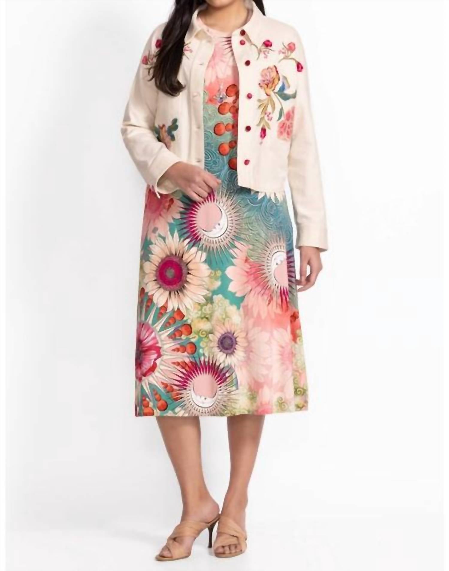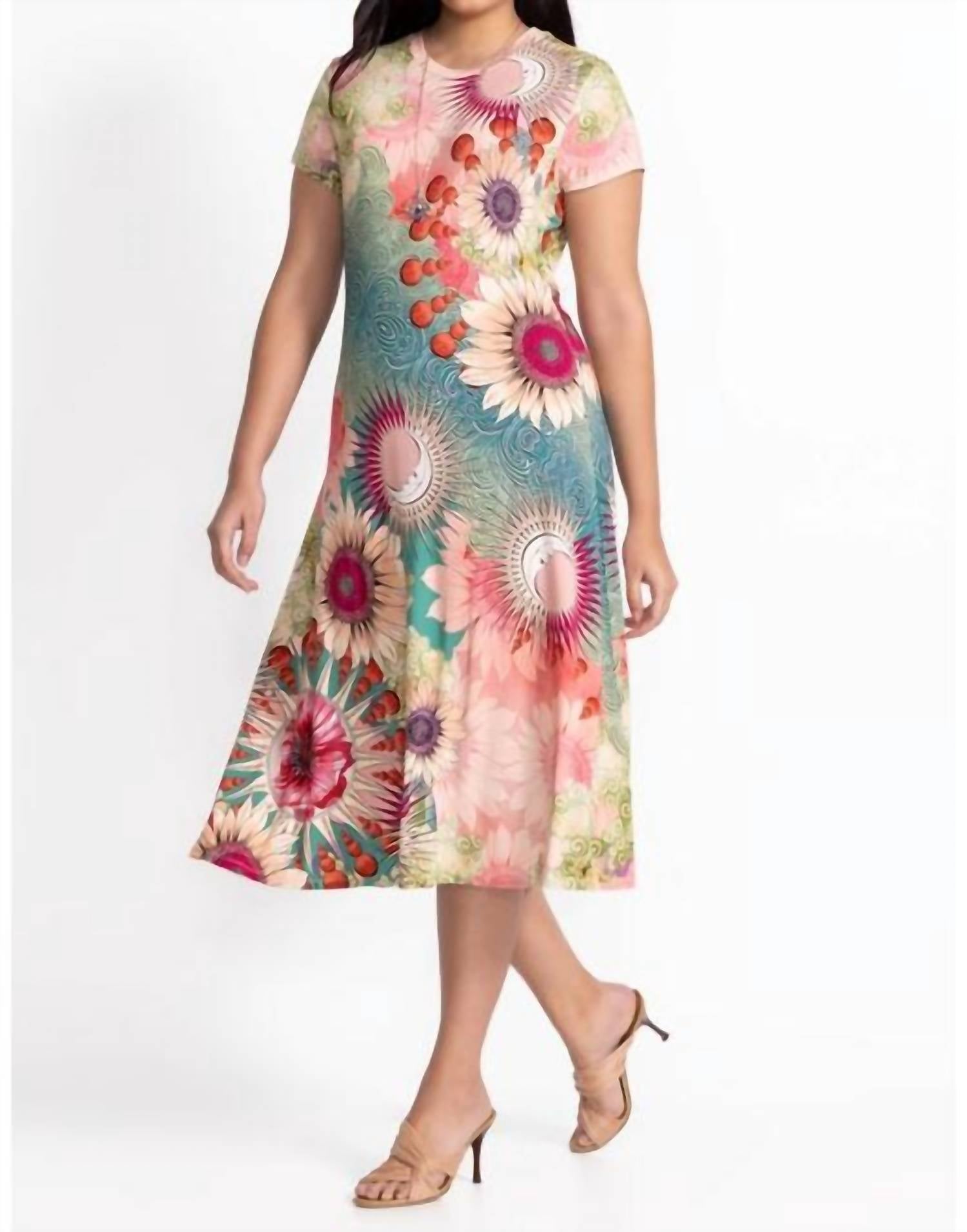 The perfect length dress does exist. Discover the Janie Favorite Cap Sleeve Dress by Johnny Was, a refreshing take on the classic t-shirt dress. This plus-sized midi dress flaunts short sleeves and a relaxed shirt silhouette with a crew neckline, perfect for vacation wear. A vibrant floral pattern in Emily hues adds a lively touch to the lightweight Rayon fabric with 5% Spandex for a comfortable stretch. Designed for ease, it features a pull-on closure and is machine washable for effortless care.