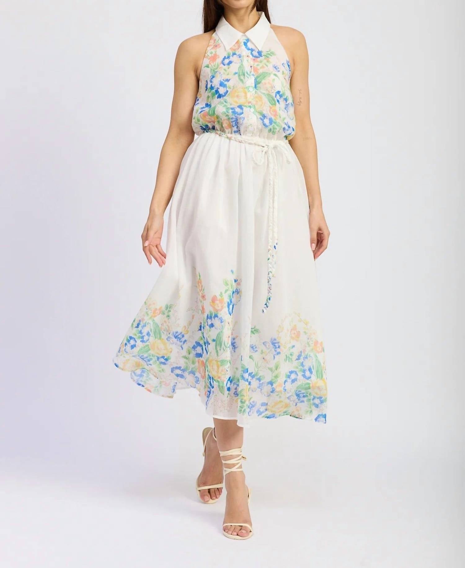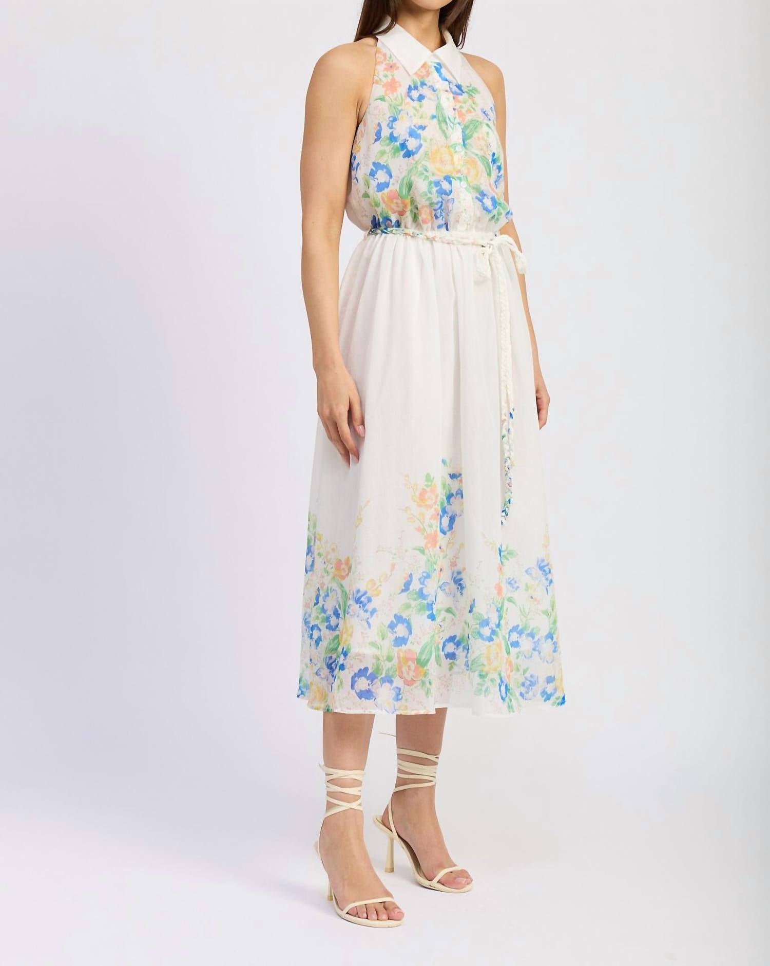 The perfect length dress does exist. Experience the boho-chic charm of the En Saison Collared Halter Midi Dress in a captivating white blue multi floral pattern. This sleeveless A-line dress is crafted from 100% Lyocell with a cotton lining, ensuring comfort and elegance for your spring vacation. Imported with a pull-on closure, this dress features a collar neckline and is easy to care for with hand washing. Ideal for various outings, this versatile midi silhouette is a must-have addition to your wardrobe.
