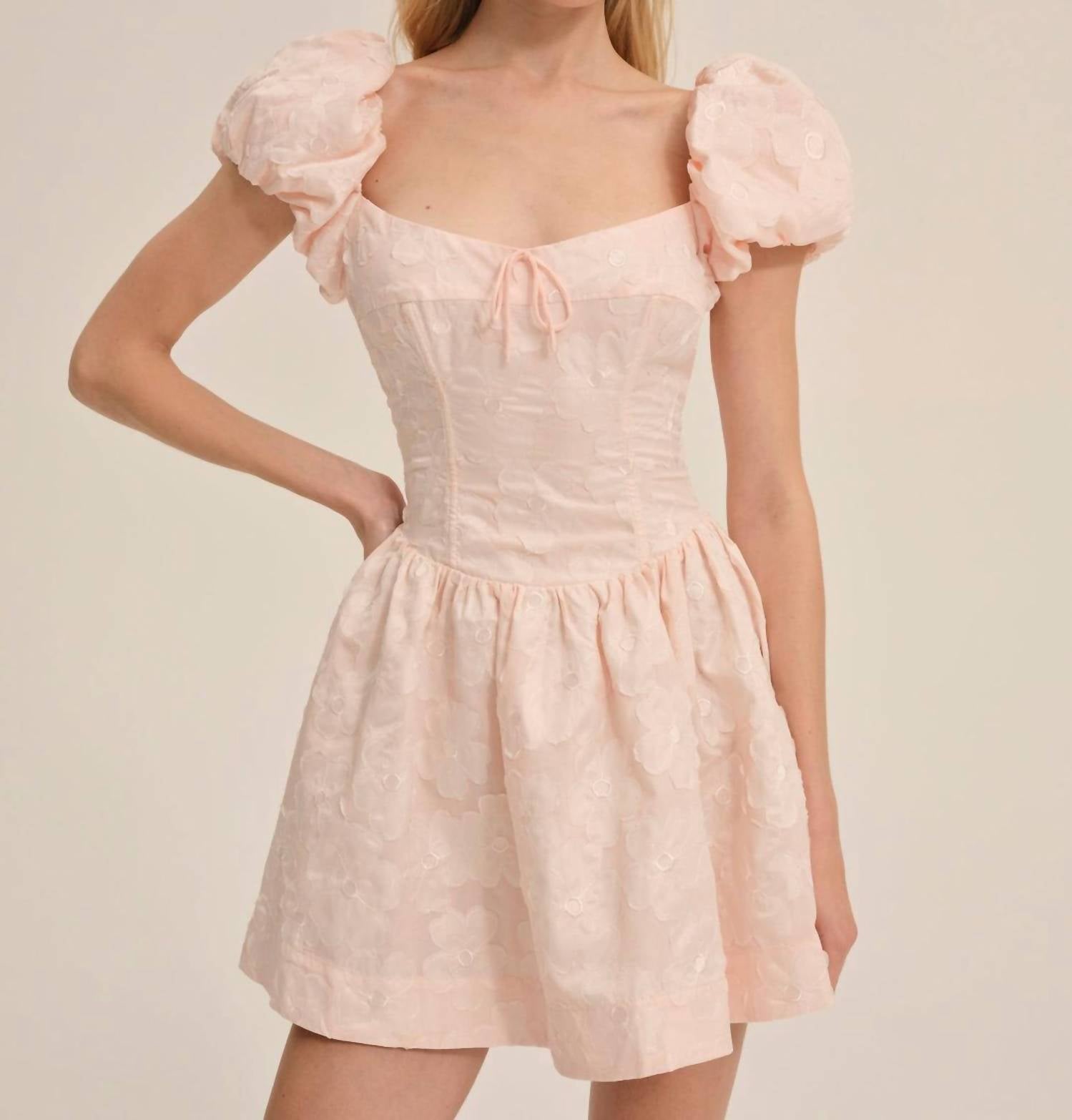 The kind of easy and flattering dress you'll be reaching for all season long. Embrace Boho Chic elegance with the Florence Mini Dress by For Love & Lemons, tailored for your sweetest summer escapes. This peach-hued, floral mini dress features romantic short puff sleeves and a fitted boned bodice, highlighted with a charming center-front decorative bow. Composition: 100% Polyester; Lining: 98% Recycled Polyester, 2% Spandex and 100% Recycled Polyester. Closure: Side zipper. Care: Dry clean only.