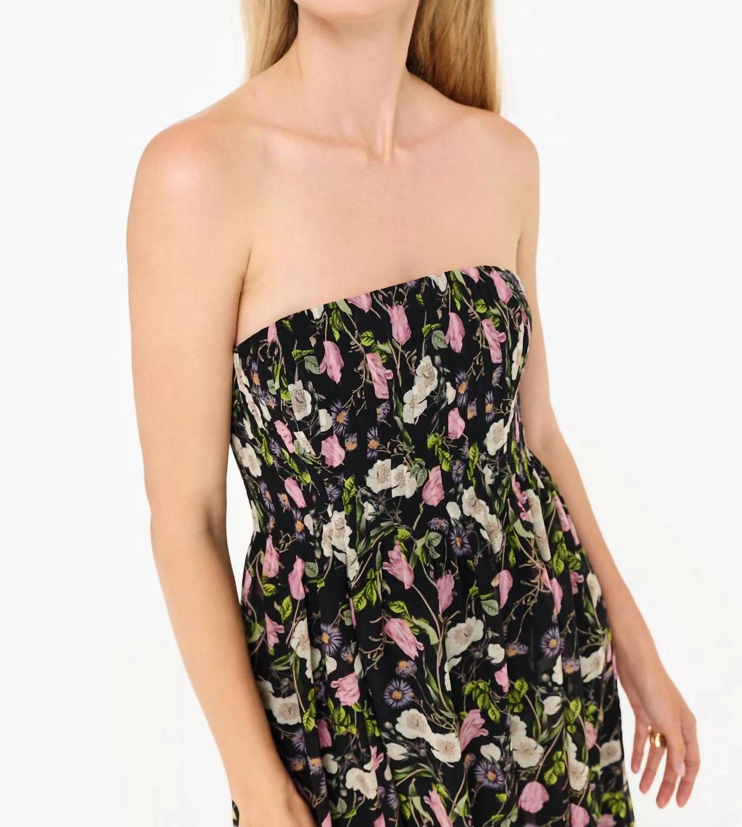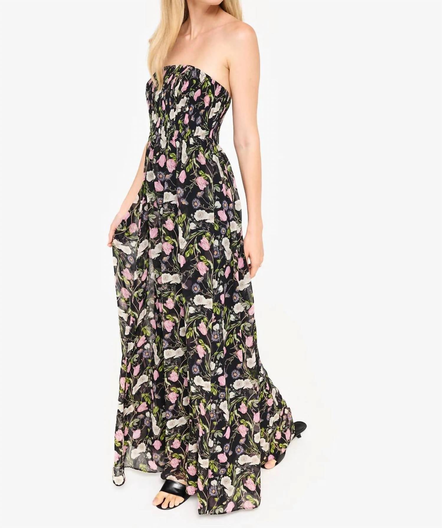 A strapless dress so versatile you can dress it up with heels or wedges, or give off a more casual vibe with flats. Introducing the Minoa Gown by Cami NYC, a stunning strapless piece crafted from poly chiffon and canvas, composed of 100% polyester and 100% cotton. This gown features a pleated bodice with boning for structure, and silicone tape for added support. Designed in a captivating Midnight Gardens floral pattern, it comes with an invisible center back zipper and hook and eye closure. Care: Dry clean and steam only. Imported. Perfect for a summer dinner party with its boho chic trend.