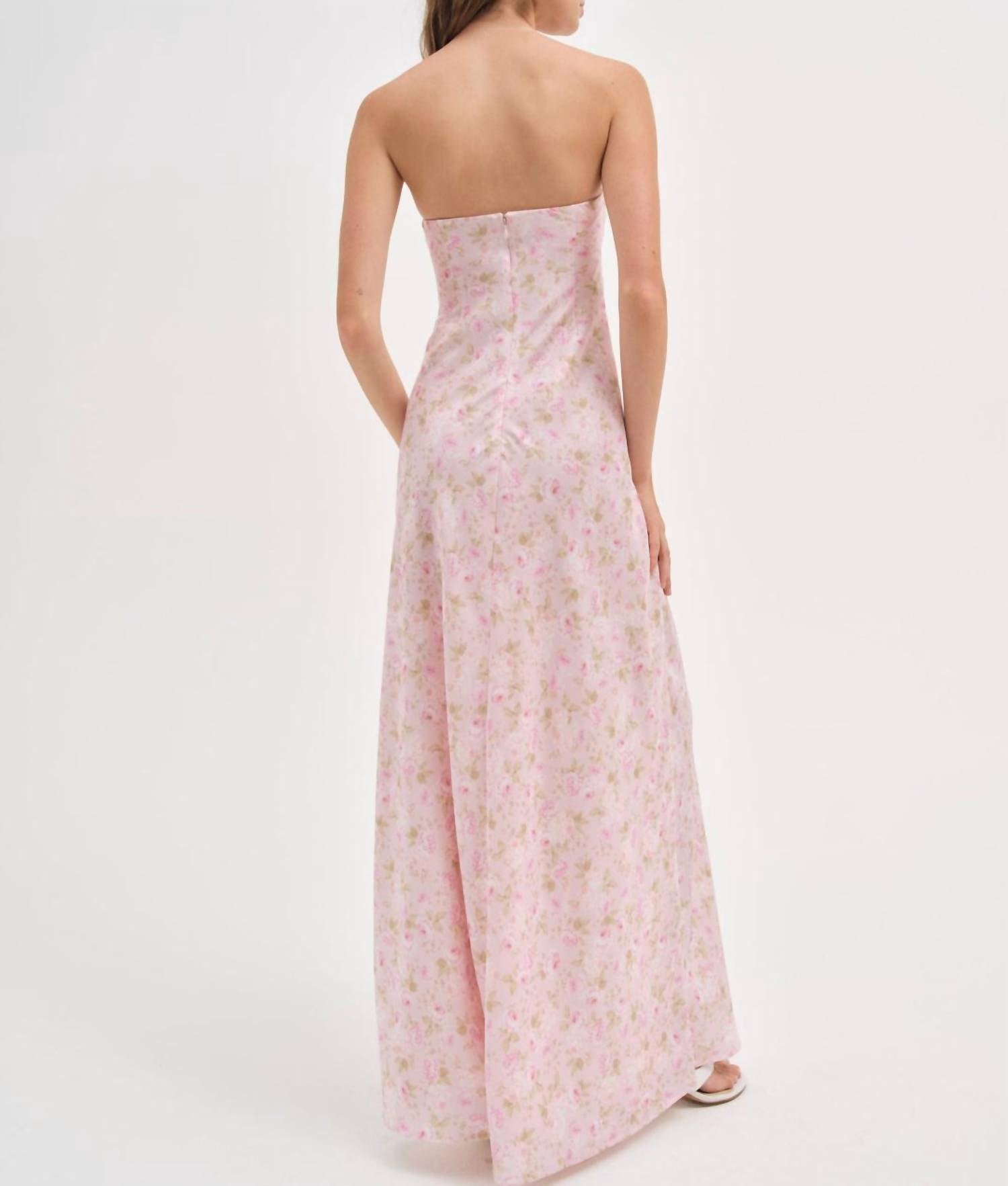 A maxi dress that is just as cute as it is comfortable. Presenting the Carla Floral Strapless Maxi Dress by For Love & Lemons, a chic choice for your next evening event. This off-the-shoulder, fit and flare silhouette in a soft pink floral pattern exudes quiet luxury. Made from 100% polyester and featuring a zip closure, this dress is ideal for spring occasions like Easter. Care instructions include hand washing with line drying.