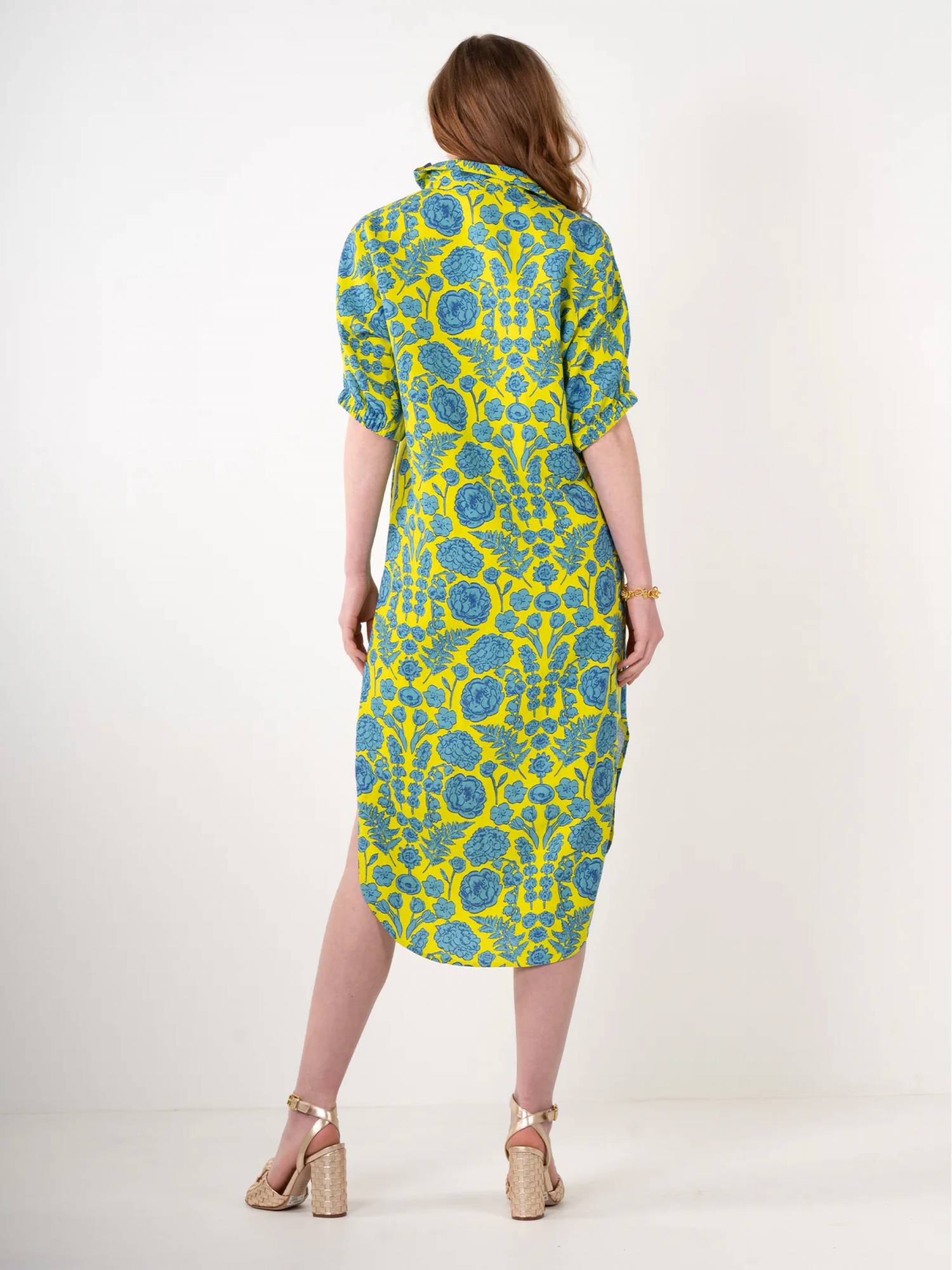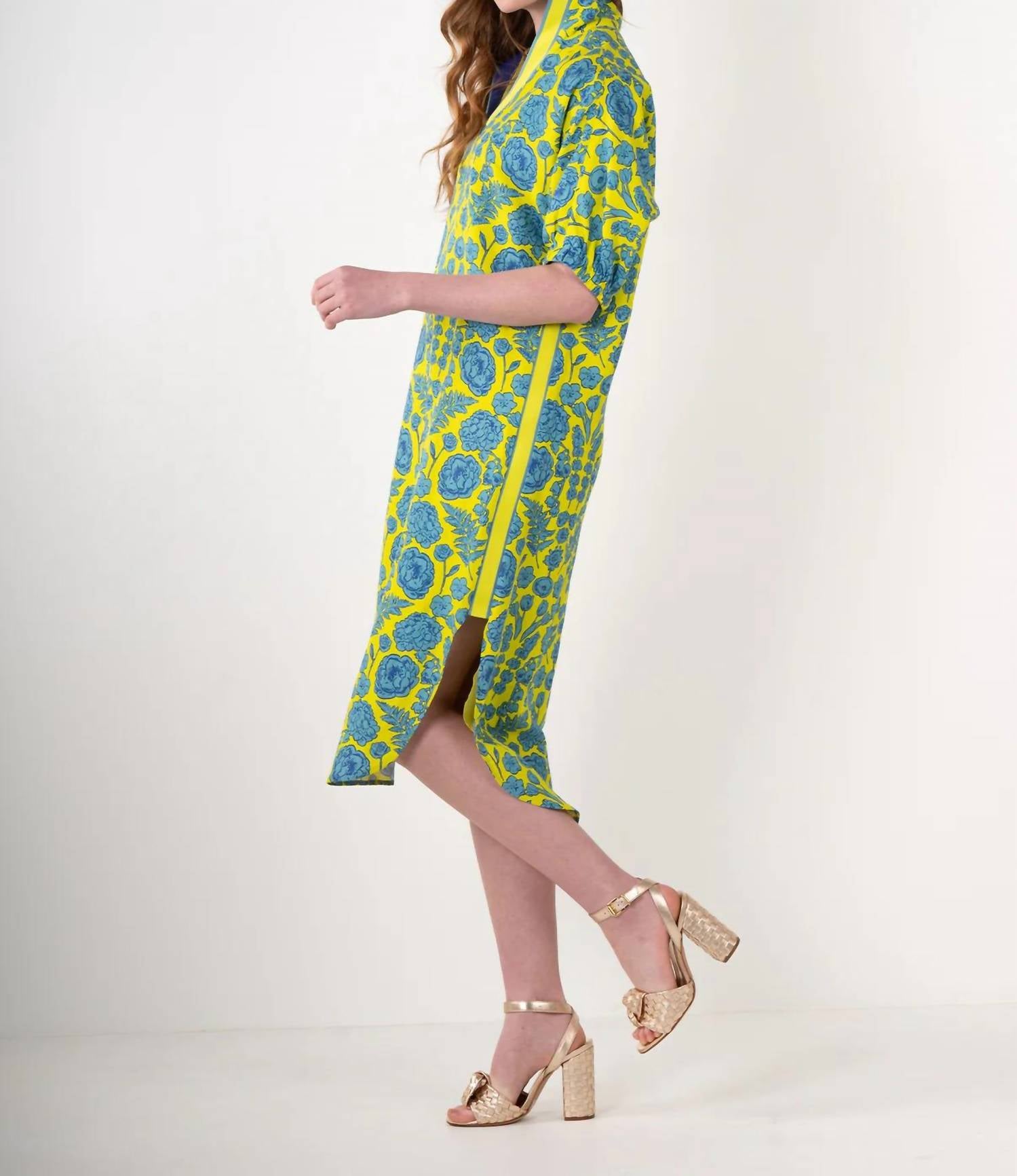 The perfect length dress does exist. Elevate your spring wardrobe with the Poppy Caftan by Emily McCarthy, crafted for style and ease in a vibrant turquoise color. Featuring elegant elbow sleeves and a sophisticated collar neckline, this shirt silhouette dress brings a touch of floral charm to any dinner party occasion. Made from durable rayon with a beautiful floral pattern, it offers a breathable and chic option for warmer days.
