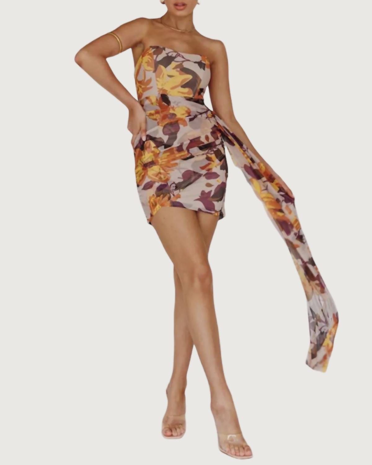 A cool twist on a classic style dress. This strapless mini dress features a bold floral print with a flattering sweetheart neckline and side draping panel. Designed with a corset-style top, overlap hemline, and back zipper closure, it’s fully lined in stretchy mesh for comfort and ease of movement. Made from 90% Polyester and 10% Spandex.