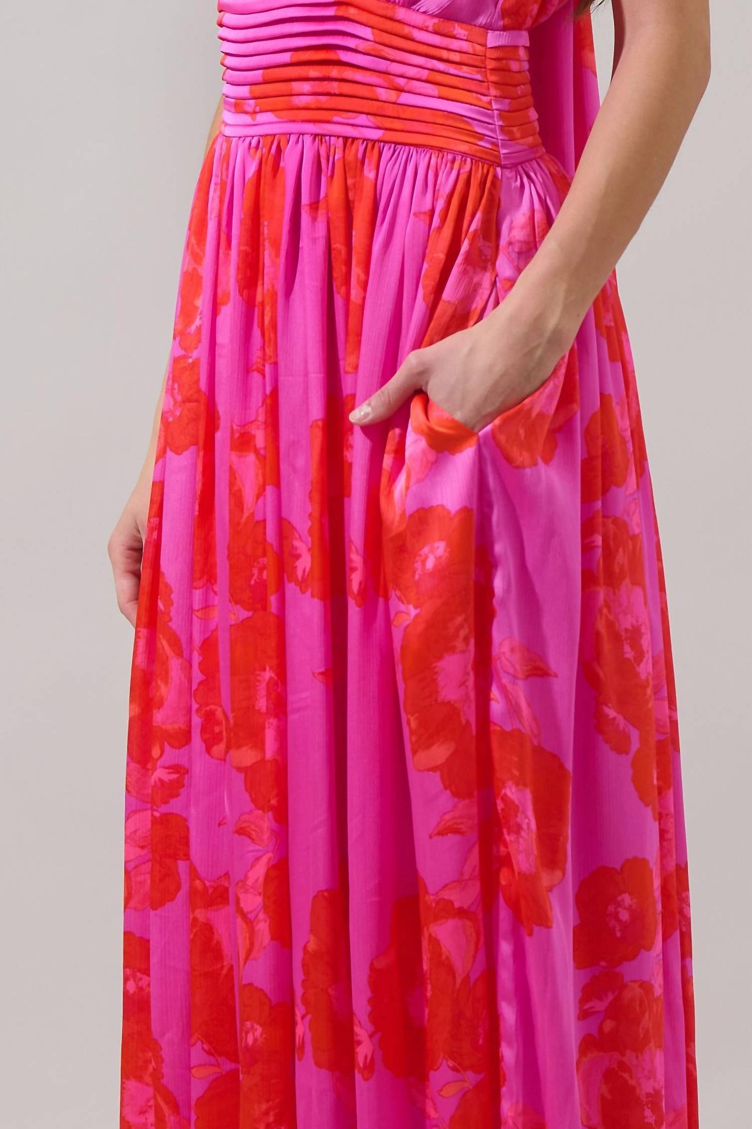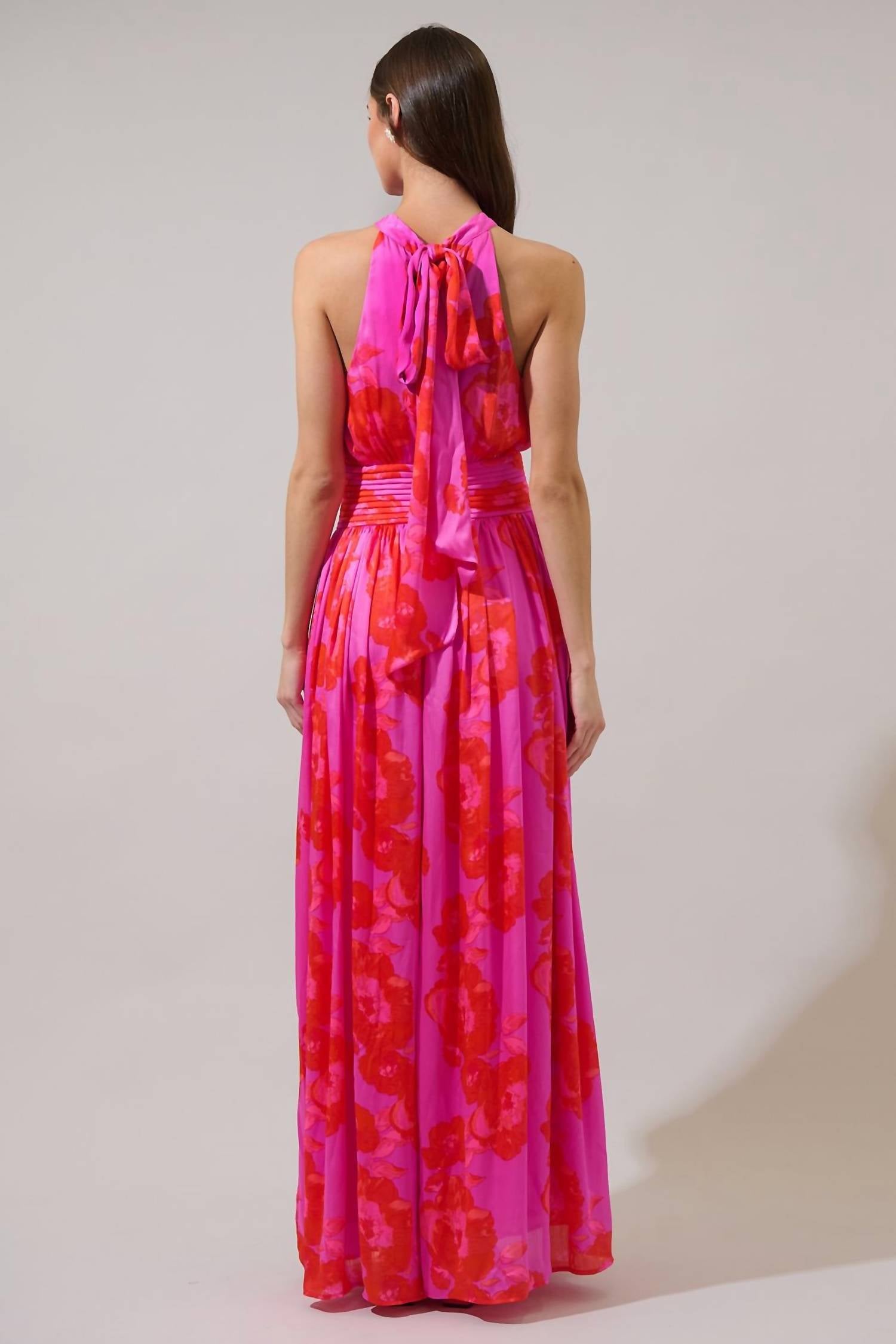 Style this maxi with your favorite statement necklace and sandals for the perfect look. Embrace elegance with the Lailah Floral Landy Halter Maxi Dress by SUGARLIPS, designed in a striking magenta red. This sleeveless maxi dress features a halter neckline and a back tie for a sophisticated finish. Crafted from 100% Polyester with a lining of 97% Polyester and 3% Spandex, it cinches at the waist with a pleated flat waistband, creating a beautiful flow with its gathered skirt. Complete your look with sandals or heels and enjoy the added convenience of pockets.