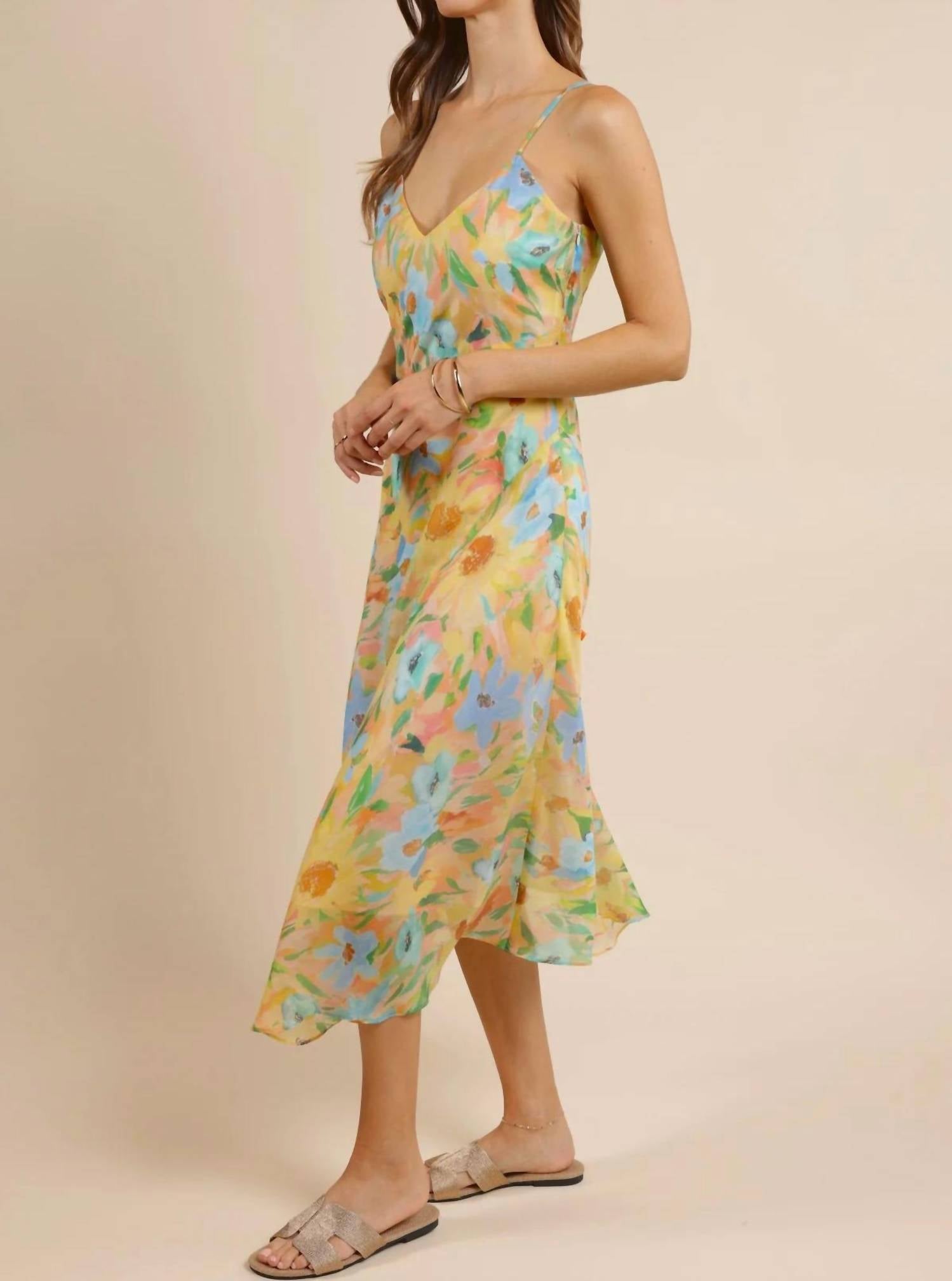 A cool twist on a classic style dress. Introducing the Daisy Chain Asymmetric Hem Slip Dress by SAGE THE LABEL, a floral masterpiece perfect for spring anniversaries. This sleeveless slip dress, in a vibrant multi-color, features a scoopneck and adjustable cross-back cami straps for a customized fit. It's crafted from luxurious 100% rayon with a bias-cut low-stretch textured fabric and lined with a blend of 92% polyester and 8% spandex, ensuring both comfort and elegance. Designed with a draped back, it’s a pull-on style that offers effortless sophistication. Care instructions advise hand washing cold and line drying.