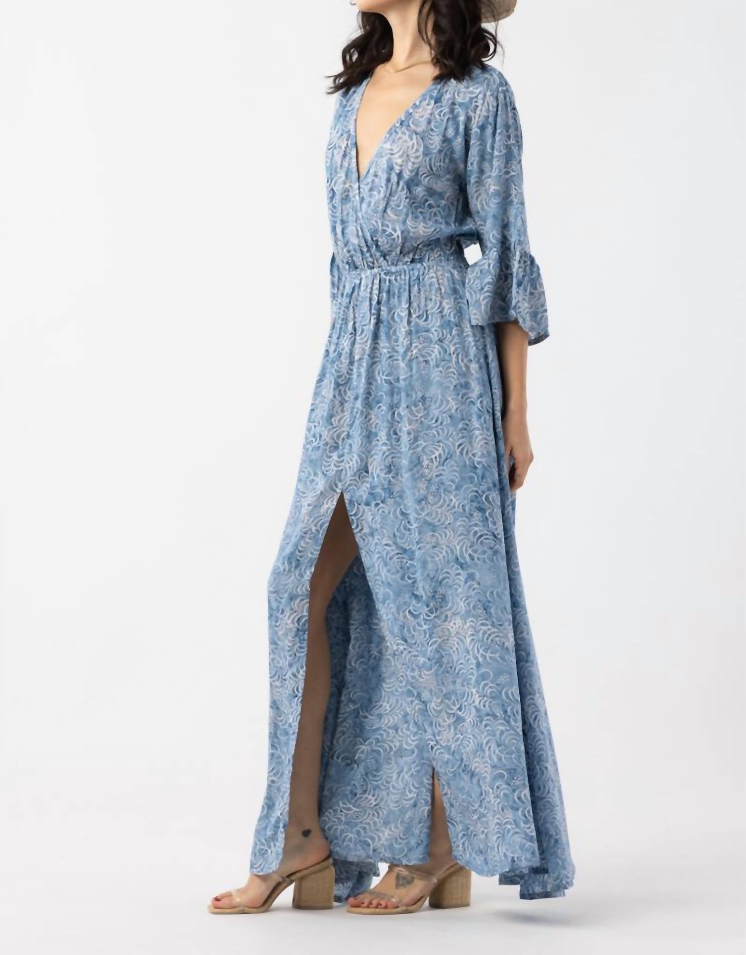 Who doesn't love a good maxi dress? This one you'll be reaching for season after season. Embrace the Boho Chic vibe with the Surry Maxi Dress by Tiare Hawaii in Batik Dreams Chambray. This women’s vacation-ready piece features three-quarter bell sleeves and a V-neckline, crafted from 100% rayon for a soft-fit comfort. The dress showcases a surplice front with a hidden snap button closure, an elasticized waist, and a leg slit. This A-line silhouette measures approximately 42" to the hem, with the slit hitting around 14", perfect for spring flair. Care for it by hand washing cold and laying flat to dry.