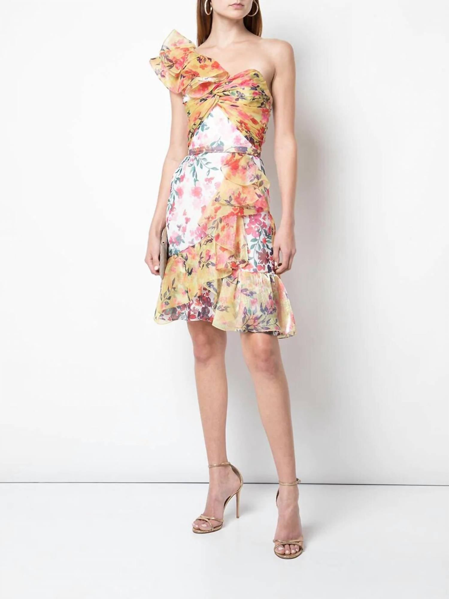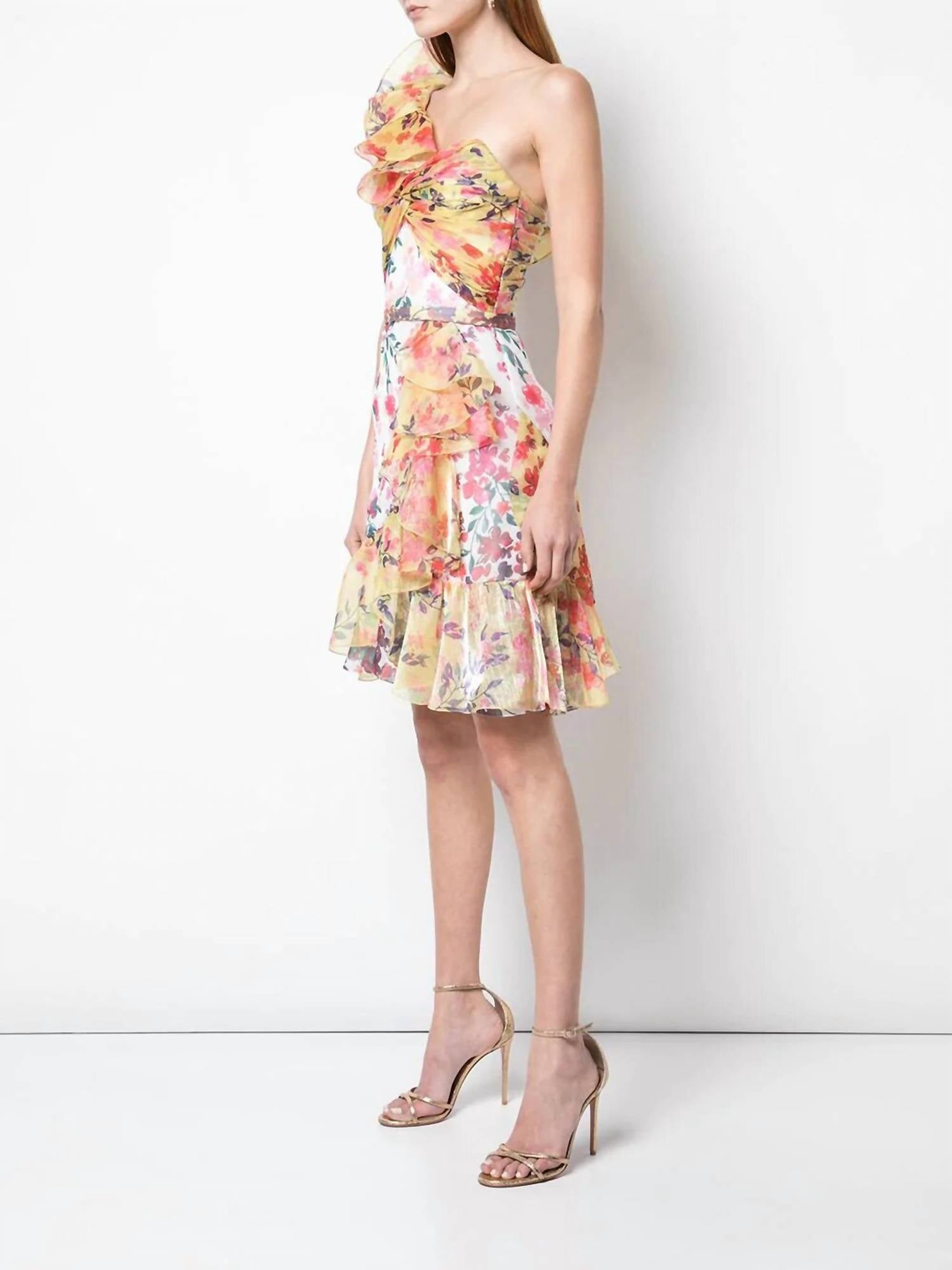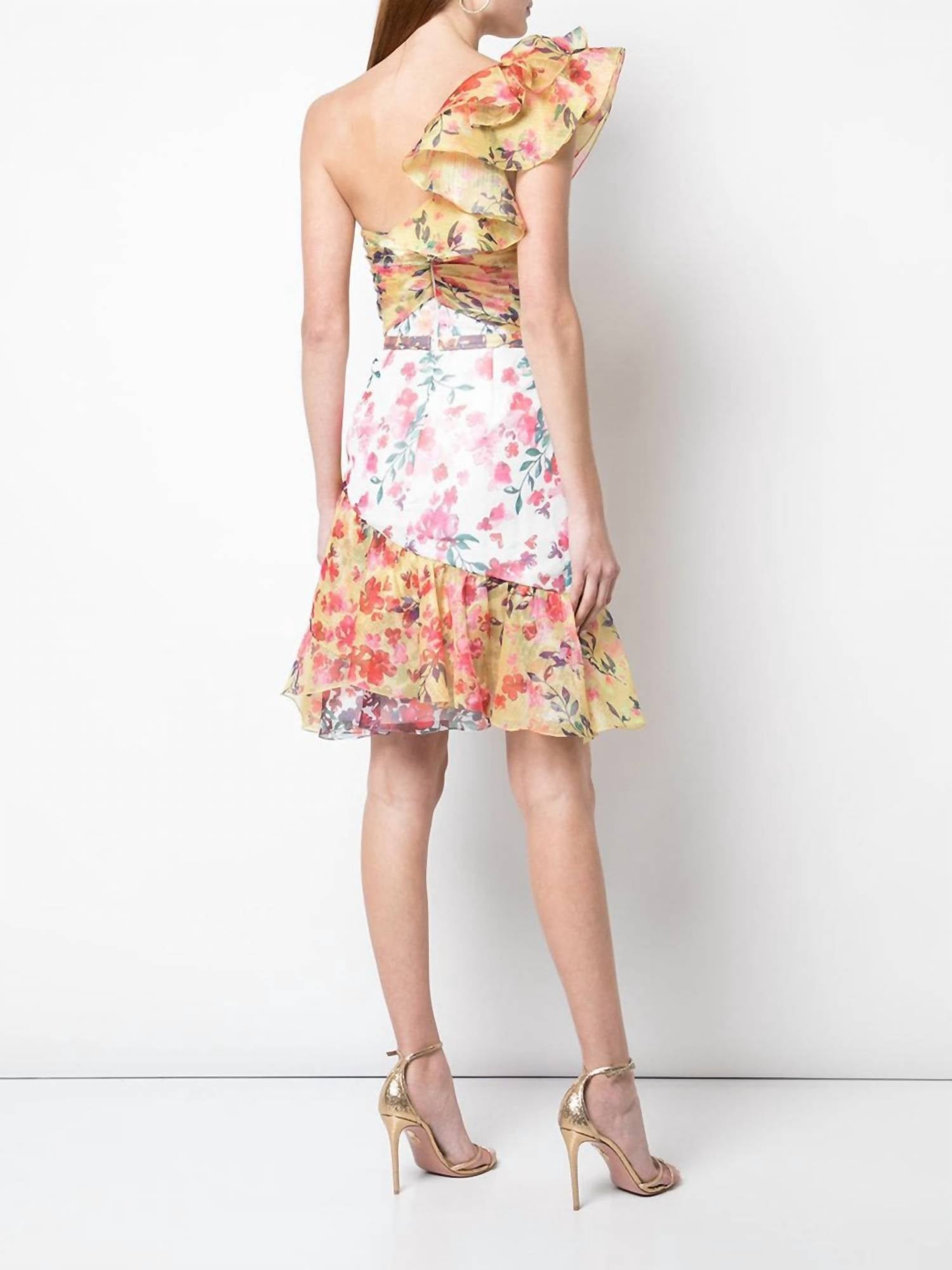 This pretty cocktail dress is full of feminine frills with a ruffly shoulder strap