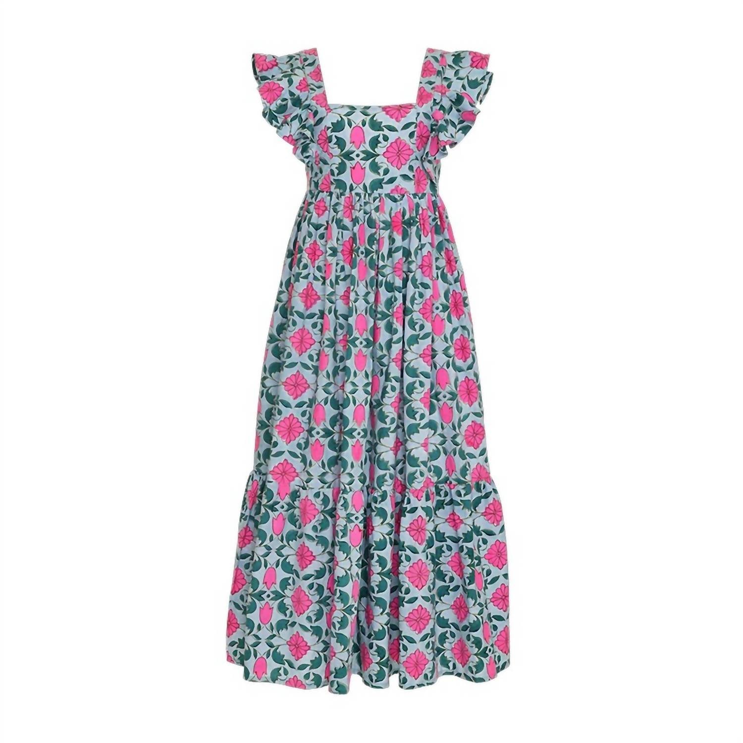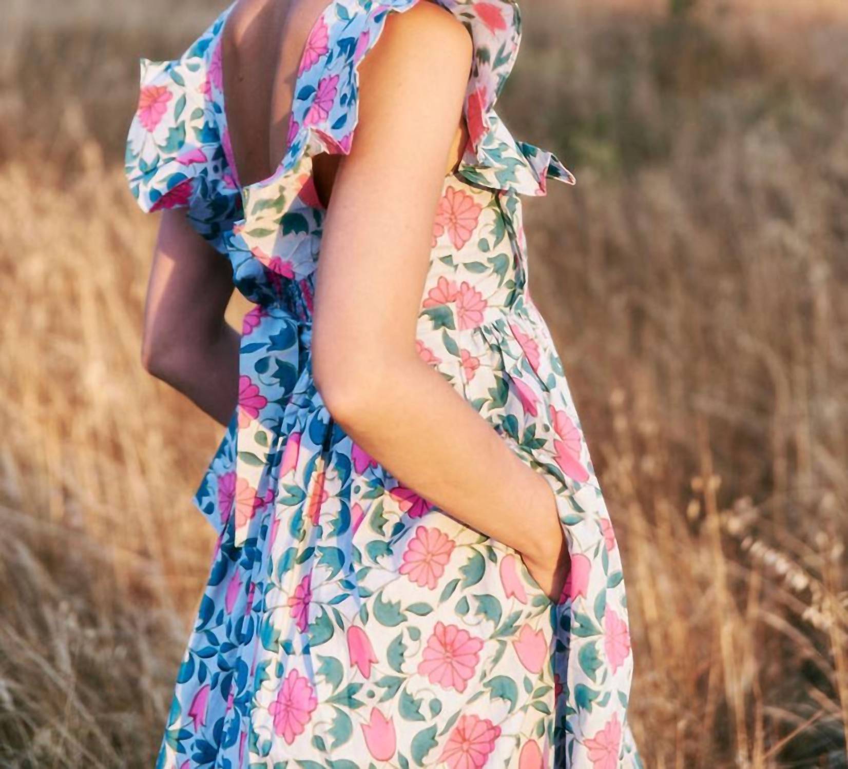 The perfect length dress does exist. Celebrate summer in style with the Charlotte Dress by SZ Blockprints, featuring cap ruffle sleeves and a classic square neckline. This midi-length, A-line silhouette dress is crafted from 100% Indian cotton and boasts a vibrant floral hand block print in blue, pink, and green. Designed with convenience in mind, it comes with side seam pockets and a pull-on closure. Easy to care for, machine wash and line dry for best results. Perfect for vacation escapes or Easter gatherings, it embodies boho-chic elegance.