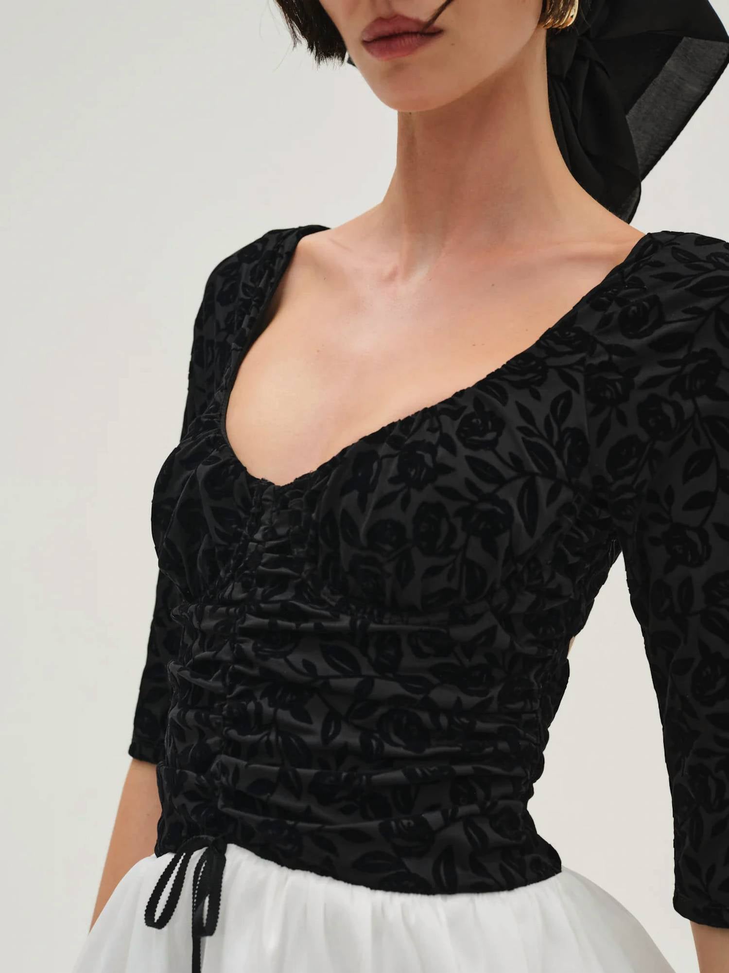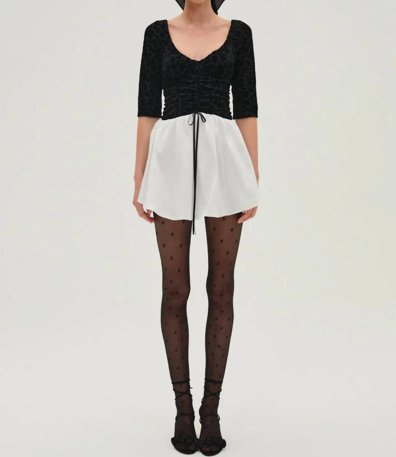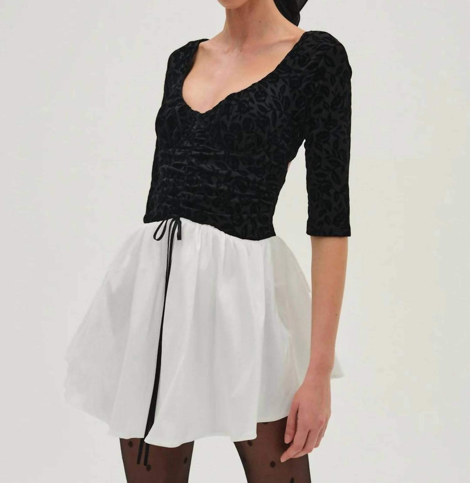 The kind of easy and flattering dress you'll be reaching for all season long. Stunning black and white piece boasts a luxurious velvet bodice with ruched underwire cups and a contrast taffeta skirt. Made from 75% polyamide and 25% elastane. With a zip closure at the center back. Features a fitted bodice that flares into an A-line silhouette. Care for this chic dress is dry clean only, ensuring its exquisite quality is maintained.