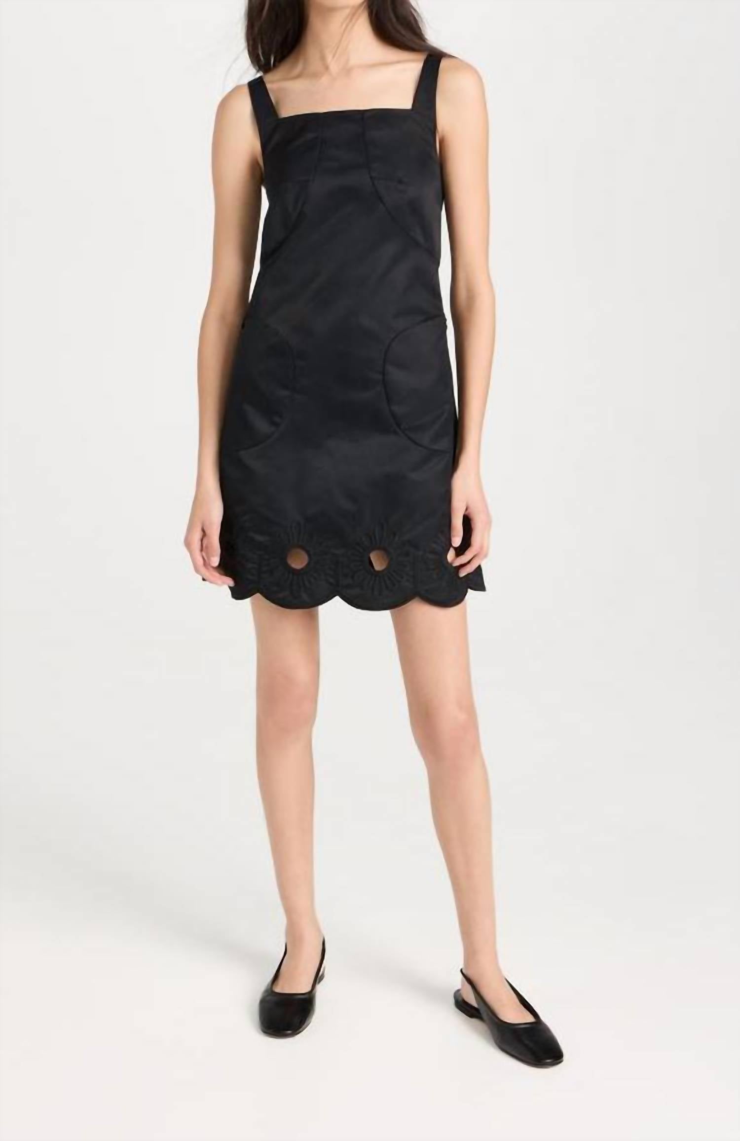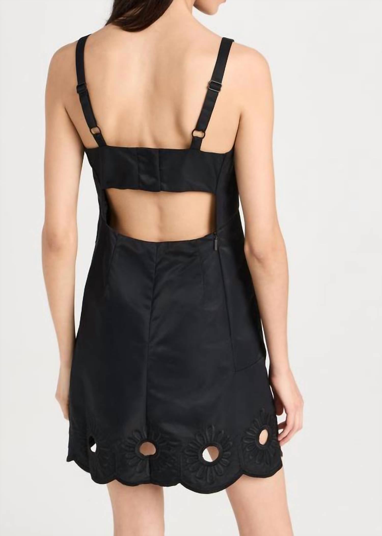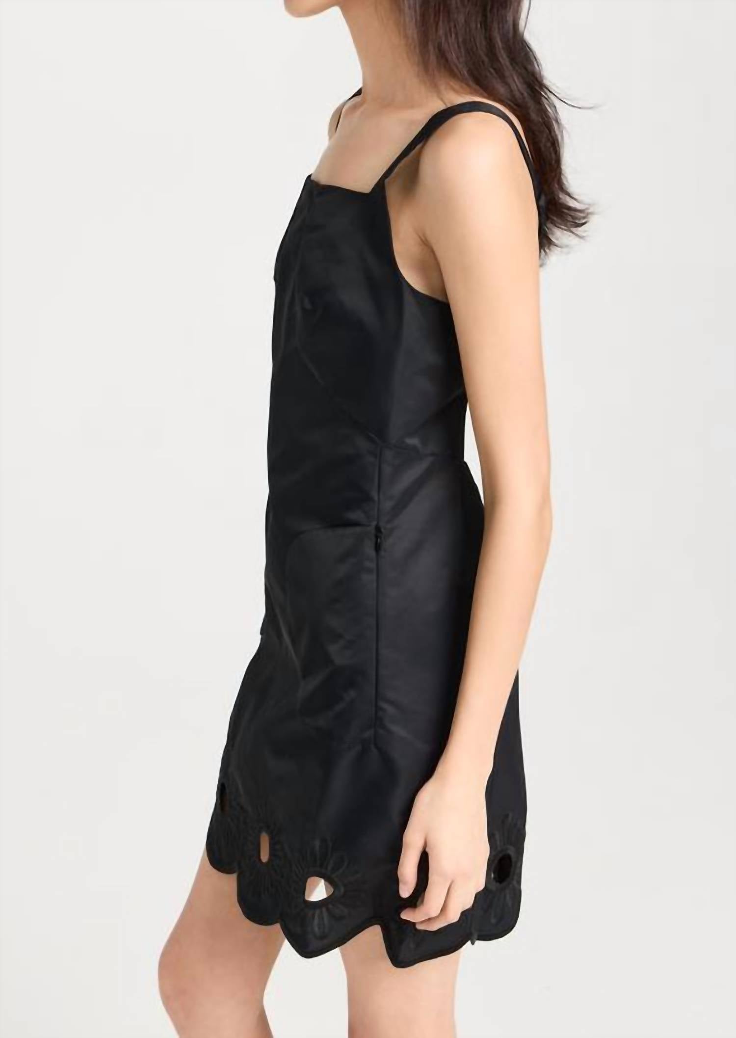 A short and breezy dress for those warmer days. Introducing the Daisy Embroidered Short Dress by Tibi, a sleek and feminine mini in elegant black. This sleeveless dress showcases lightweight, non-stretch technical weave with tonal floral embroidery, adjustable shoulder straps, and a square neckline. Made from 100% polyamide, it features a stylish cutout at the back and a scalloped hem at 32.75 inches, with a hidden zip closure for a seamless look. Care for this timeless piece with professional dry cleaning.