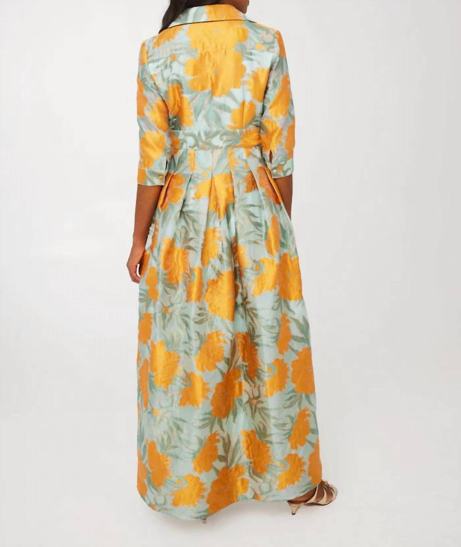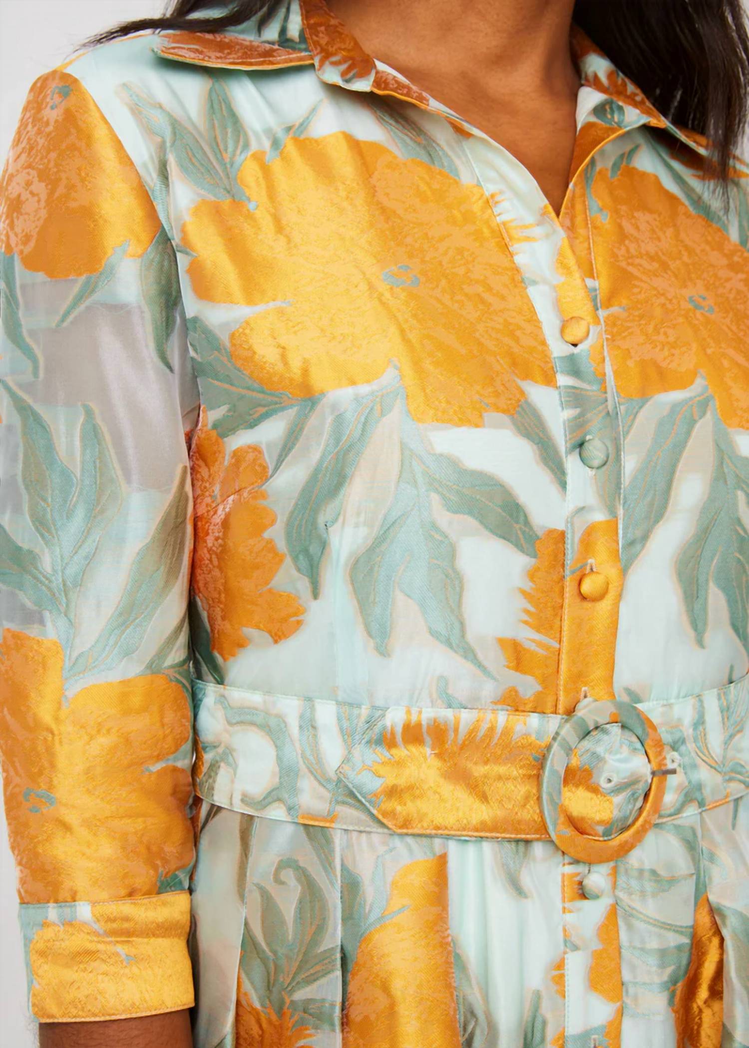 Style this maxi with your favorite statement necklace and sandals for the perfect look. he Cecilia Gown is the epitome of refined elegance. With its structured collar, quarter-length sleeves, button-up front, and buckle belt, this full-length gown offers graceful coverage with timeless appeal. Whether you're the mother of the bride or groom or attending a black-tie affair, the Cecilia ensures you feel polished and poised for life’s most meaningful moments. Rendered in a soft mint and orange pansy vine organza, it brings a fresh yet classic feel to formal dressing. Collared neckline Quarter-length sleeve with button cuff detail Removable and adjustable buckle belt Front closure with covered buttons A-line silhouette Fully lined, except for the sleeves Fabric: Organza, 80% Polyester; 20% Nylon