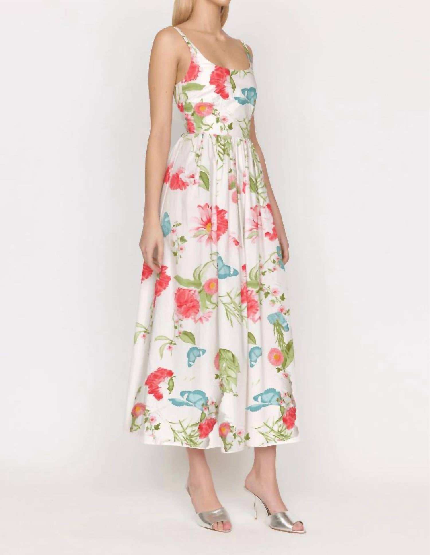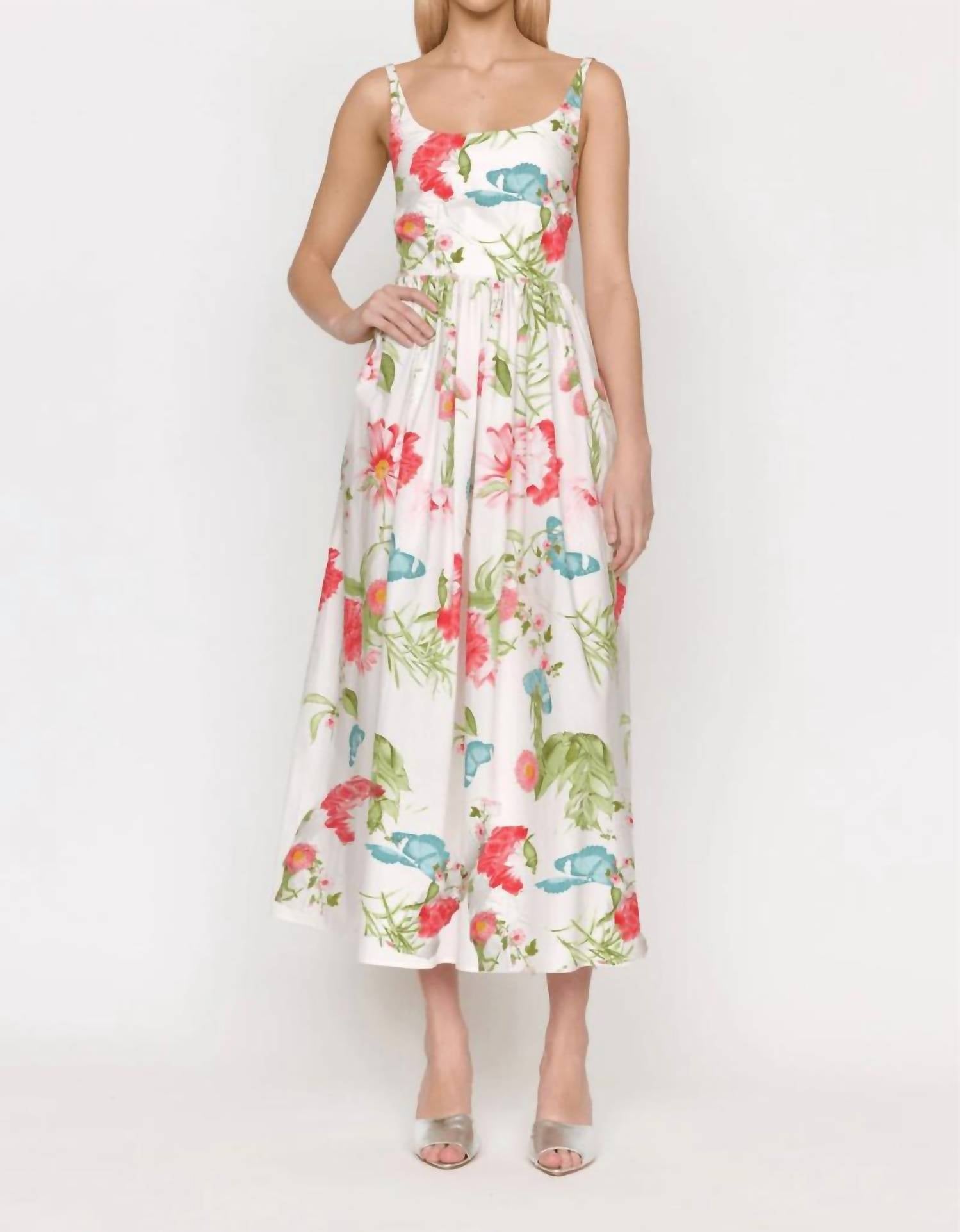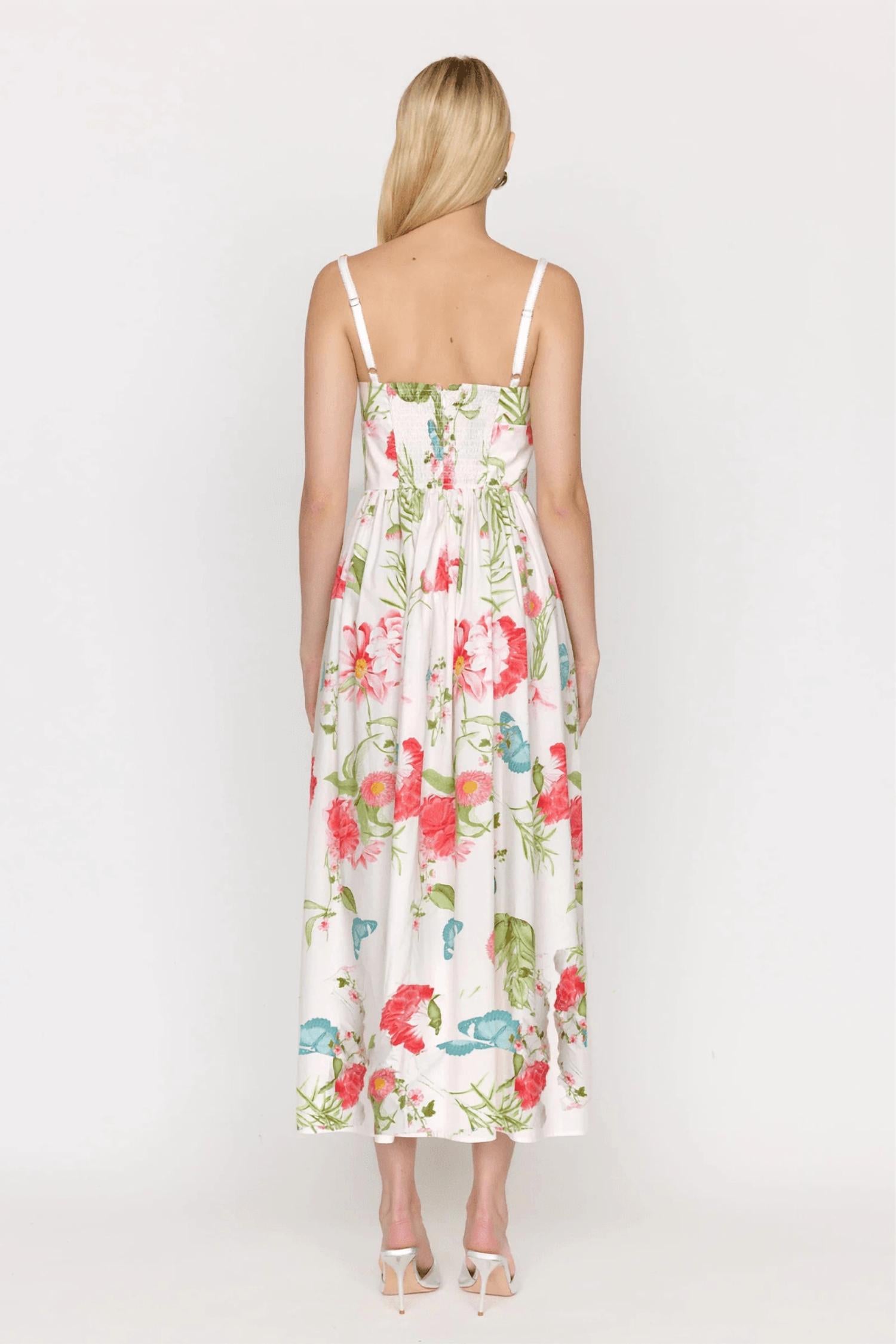 Pair with your favorite sandals for an effortlessly chic look. Introducing the Nixie Midi Dress by CHRISTY LYNN, a stunning addition to your wardrobe with a boho chic flair. This sleeveless dress features a scoop neckline and is crafted from 100% Cotton Poplin, ensuring comfort and elegance. Designed with convenience in mind, it showcases ring and slider adjustable straps, pockets at the waist side seam, and an invisible zip closure with smocking at the back for a flawless fit. Made for the woman on the go who loves feminine florals, this imported piece requires dry clean only care.