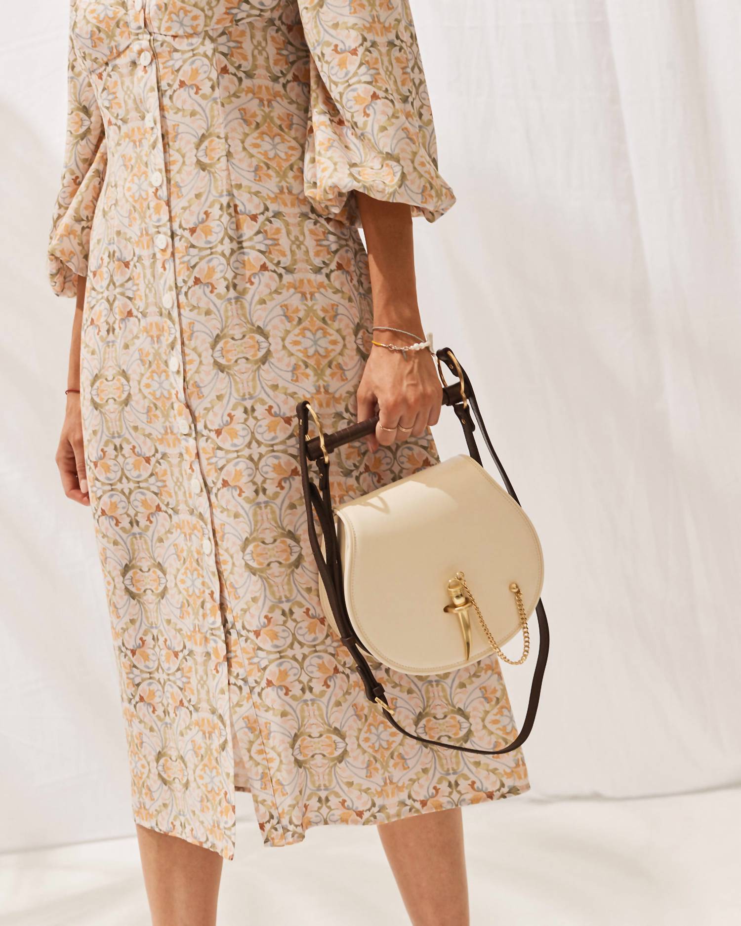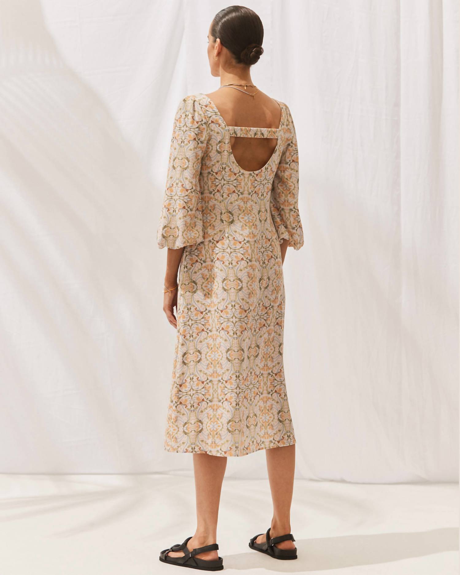 Just add slides or mules and you are good to go. Elevate your wardrobe with the Sancia Fleur Dress in Luzianes Floral, featuring refined three-quarter puffed sleeves and an elegant sweetheart neckline. This floaty midi-length dress is skillfully handmade from 64% Tencel® Lyocell and 36% Rayon, ensuring a light and airy feel. Style effortlessly with its center-front button closure and an open-back design with ruched strap detail. Care involves a gentle hand wash in cold water with line drying in the shade, and it welcomes a warm iron and dry cleaning for maintenance.