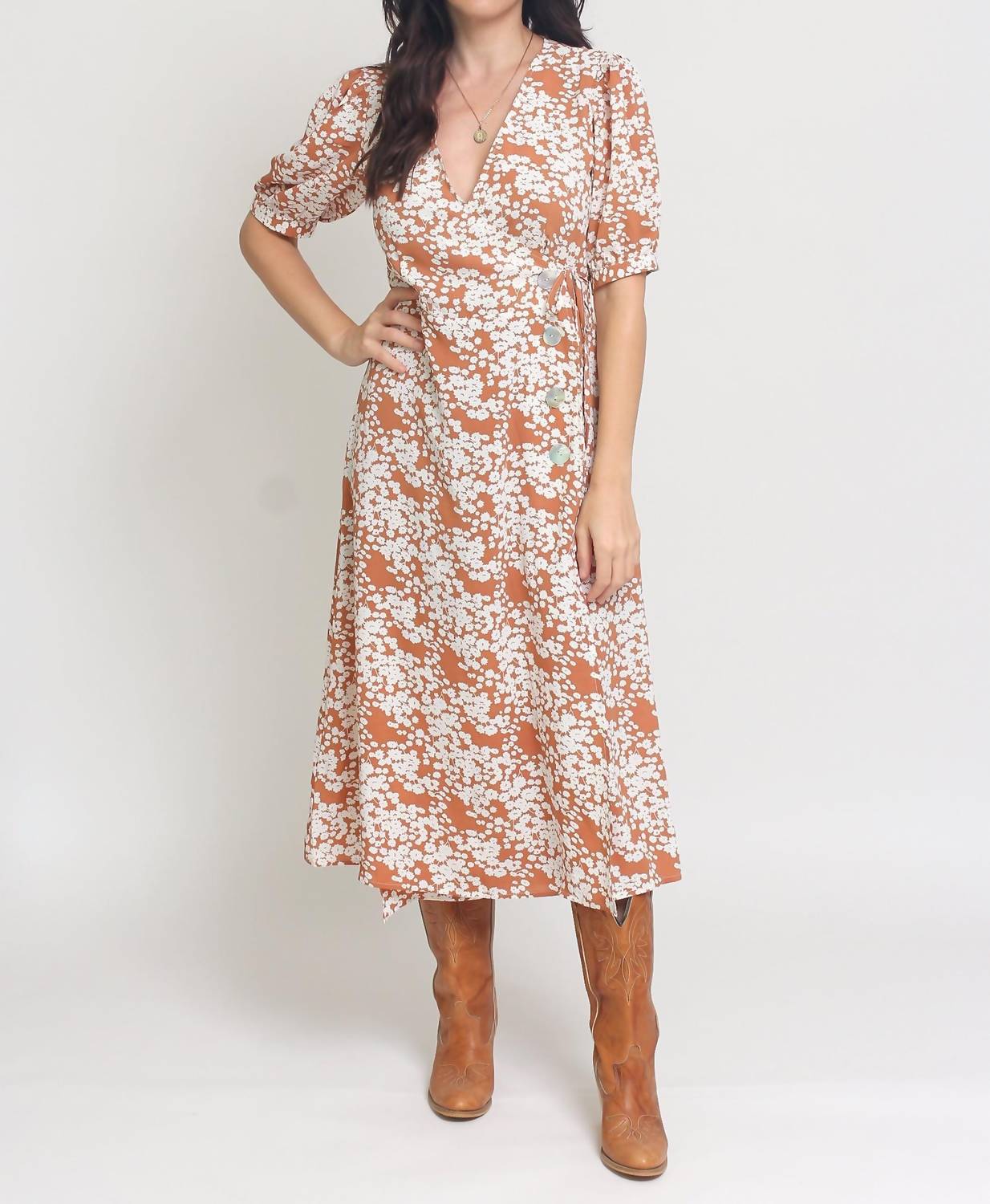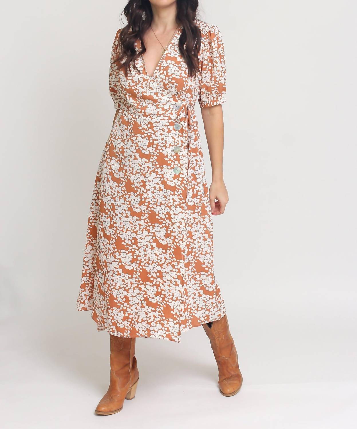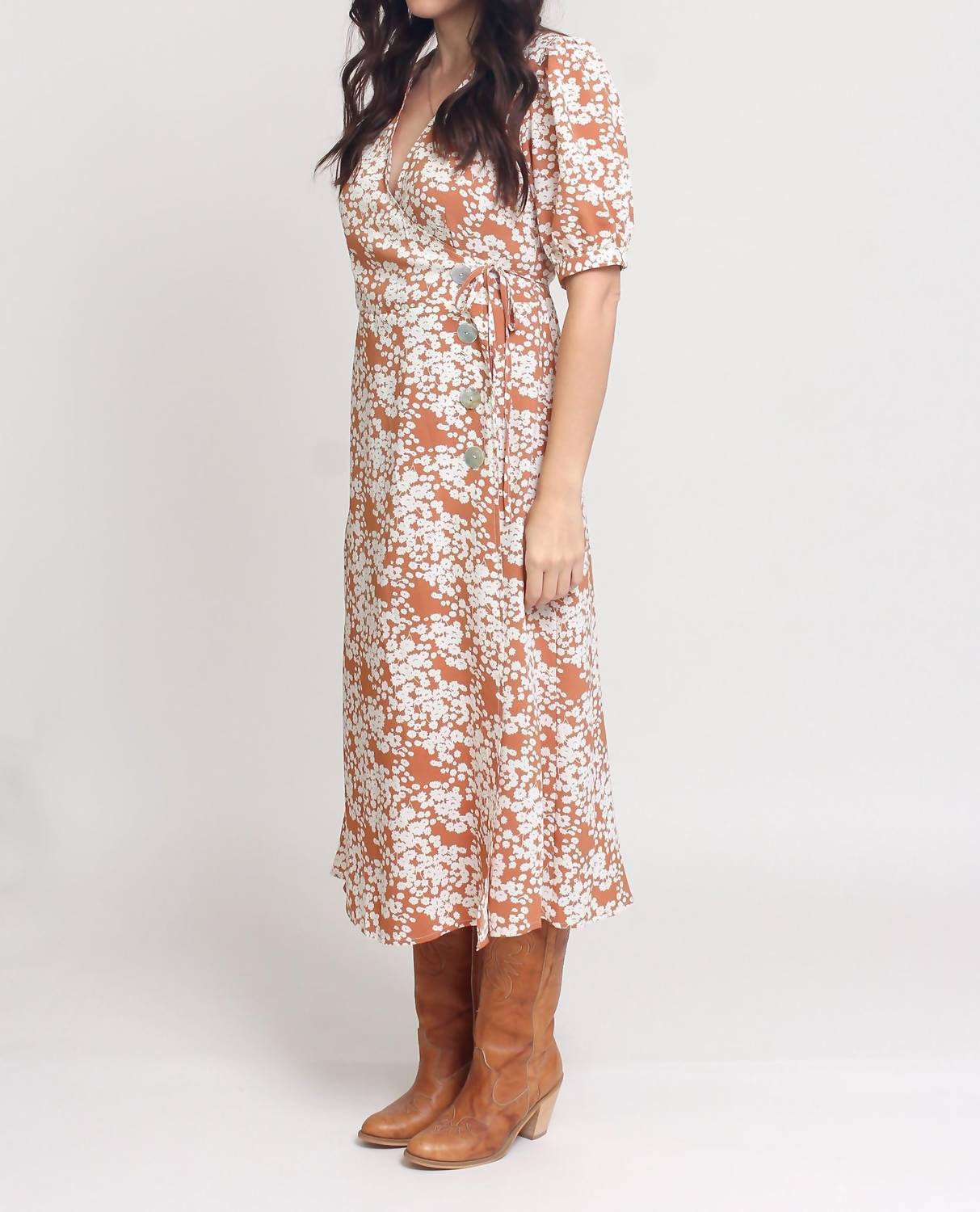 The pefect long sleeve dress for those cooler months. Discover effortless elegance with the Lillie Floral Midi Wrap Dress by Crescent, designed in a rusty floral print for a charming holiday party look. This dress showcases short puff sleeves with button cuffs and a flattering midi length. Crafted from 100% Polyester with a 100% Rayon lining, it offers a wrap front with a side tie and working button closures. Care is simple with a hand wash recommendation, ensuring this piece remains a staple for spring occasions. Model Height 5'3"| Bust 32"| Waist 25"| Hips 34", wearing a size small (Unstretched fit measurements: S: Bust 32", Waist 28", Length 45.5").