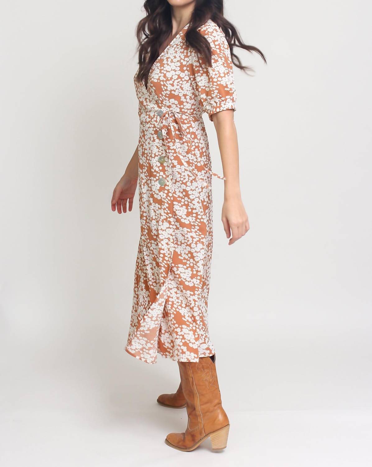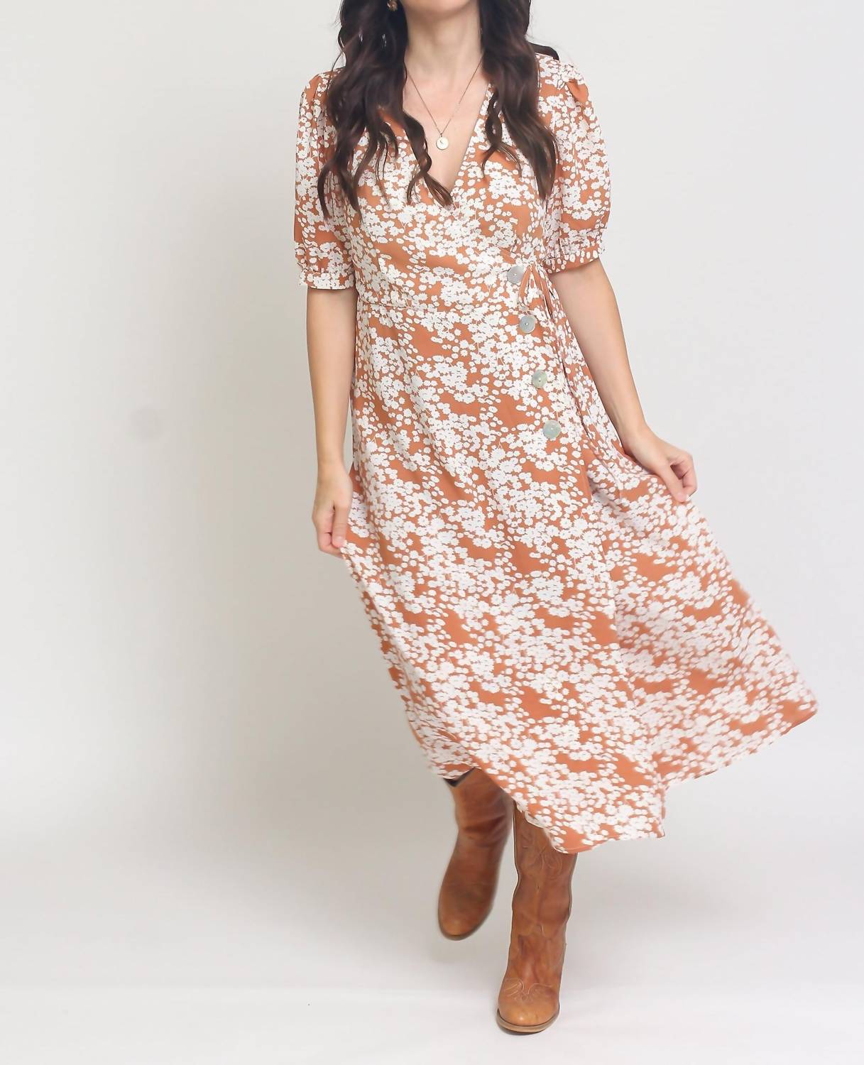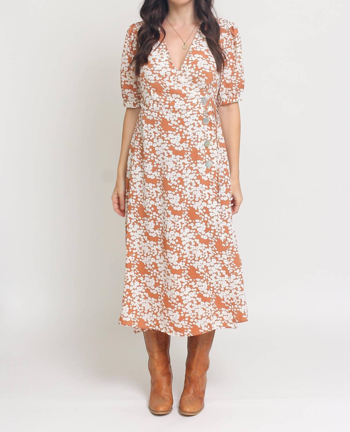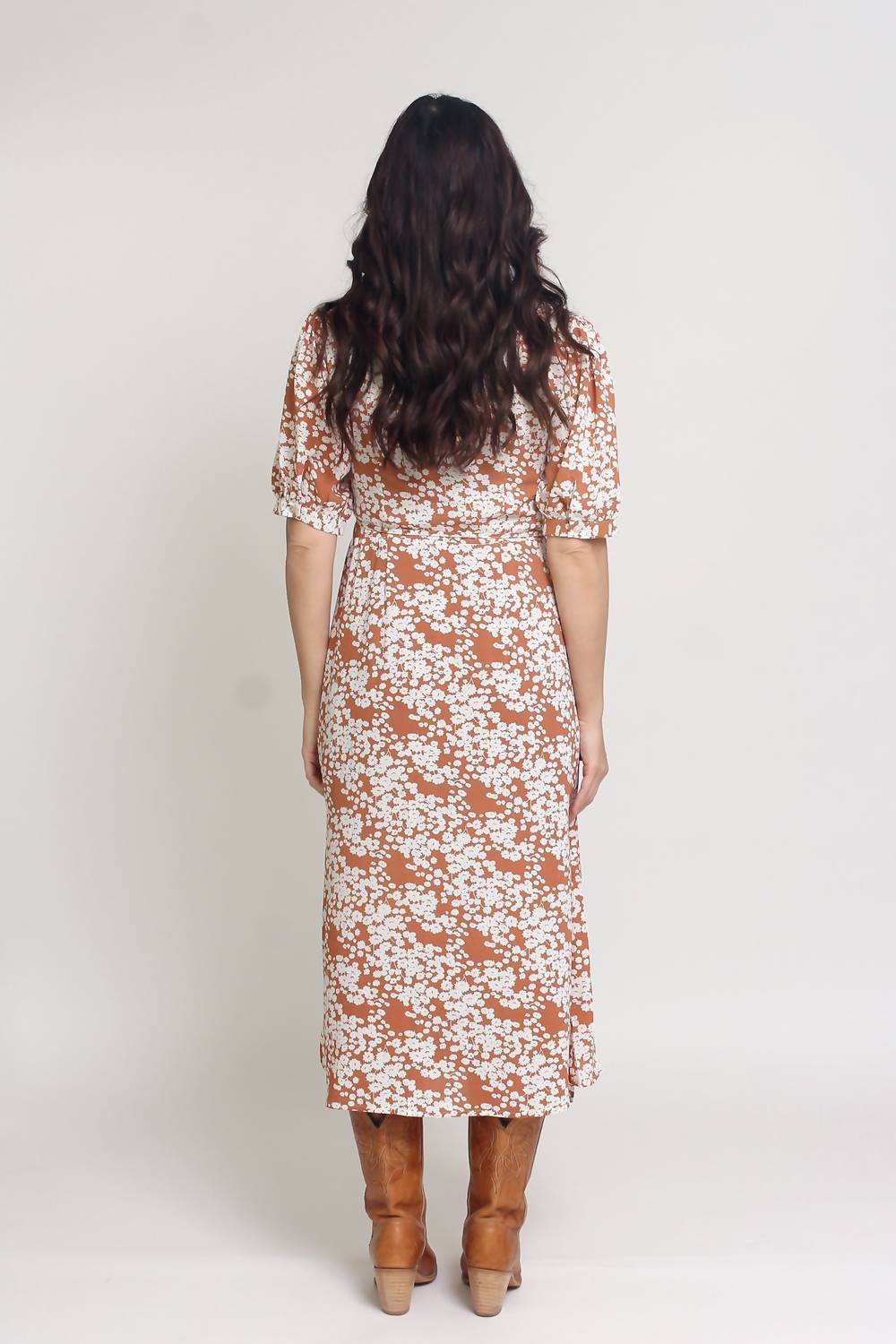 The pefect long sleeve dress for those cooler months. Discover effortless elegance with the Lillie Floral Midi Wrap Dress by Crescent, designed in a rusty floral print for a charming holiday party look. This dress showcases short puff sleeves with button cuffs and a flattering midi length. Crafted from 100% Polyester with a 100% Rayon lining, it offers a wrap front with a side tie and working button closures. Care is simple with a hand wash recommendation, ensuring this piece remains a staple for spring occasions. Model Height 5'3"| Bust 32"| Waist 25"| Hips 34", wearing a size small (Unstretched fit measurements: S: Bust 32", Waist 28", Length 45.5").