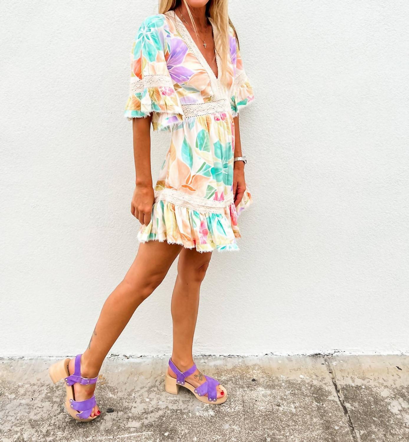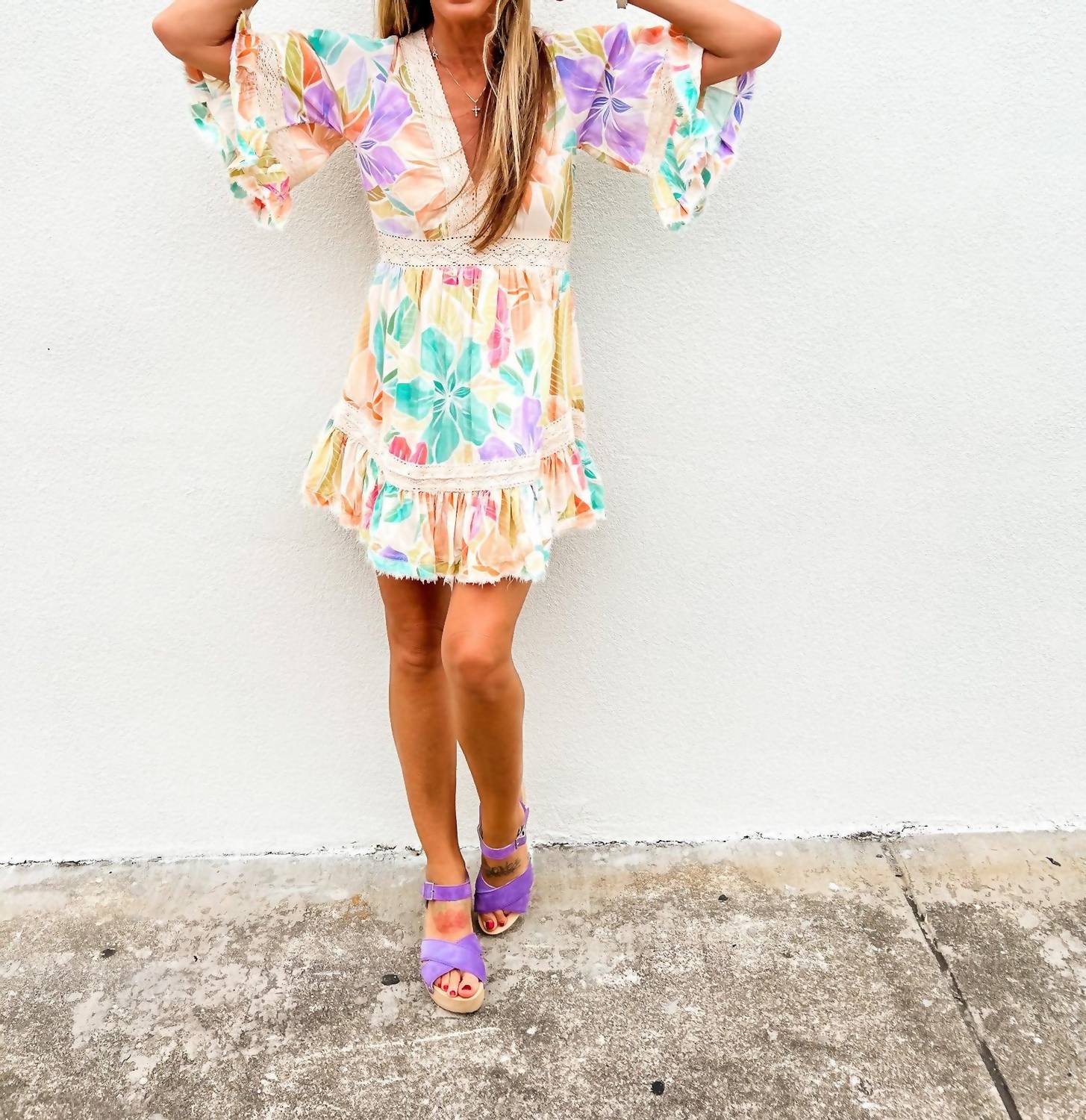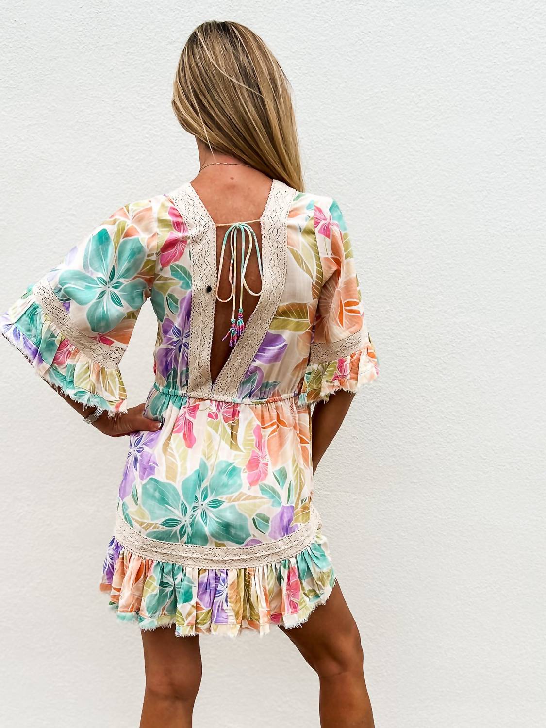 Comfortable and cute, this casual day dress has it all. The Glowing Bloom Mini Dress by Z&L Europe is a stunning addition to your summer wardrobe, featuring elbow-length flared sleeves with raw-edge cuffs. Crafted from 100% lightweight viscose, this multi-color floral print dress boasts a captivating V-neckline with vintage-inspired crochet lace trim and a flowy ruffle hem for flirtatious movement. The open back with a tassel-tie closure adds an element of surprise and delight. Perfect for vacations or beach getaways, the dress runs true to size and should be hand washed separately, line dried, and ironed on medium heat if needed.