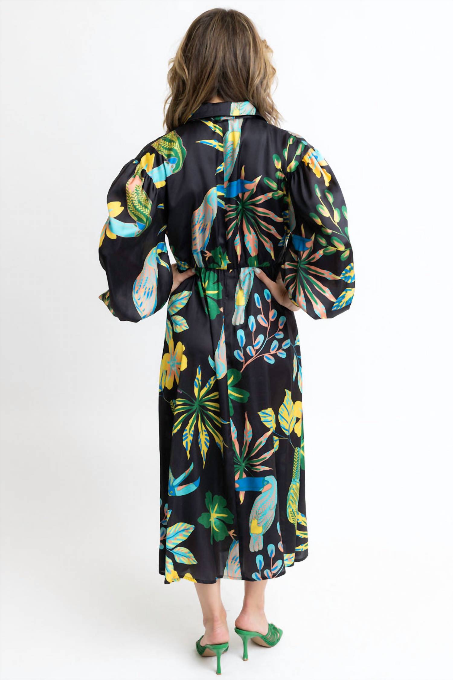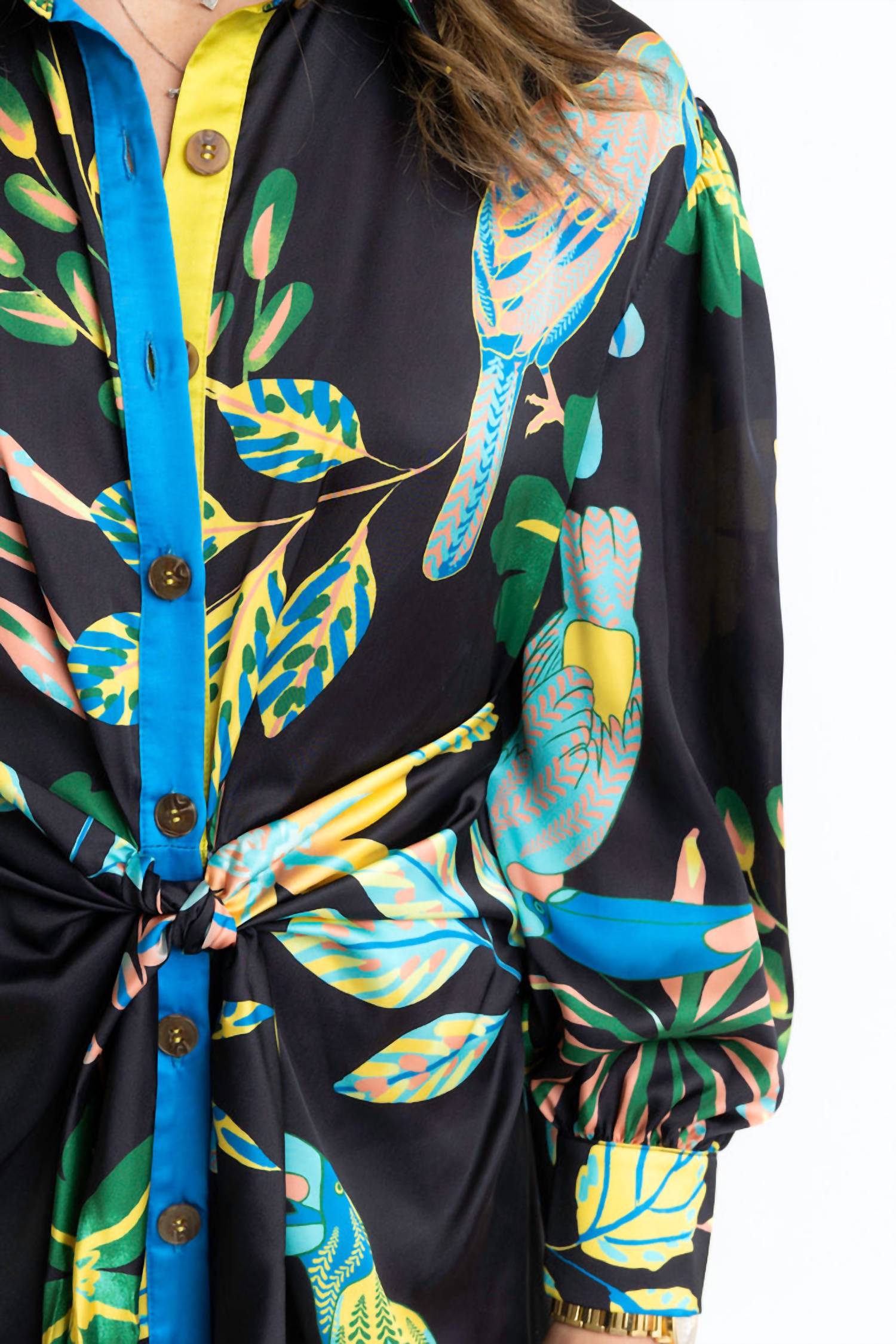 The perfect length dress does exist. Elevate your evening event look with the Karlie Toucan Jungle Button Knot Tie Satin Dress, a striking piece in rich black with a vibrant floral pattern. This shirt silhouette dress features long sleeves and a classic collar for sophisticated flair. Crafted from luxurious satin and designed as a midi dress, it offers a chic maximalist appeal perfect for spring occasions. Closure: Button closure.