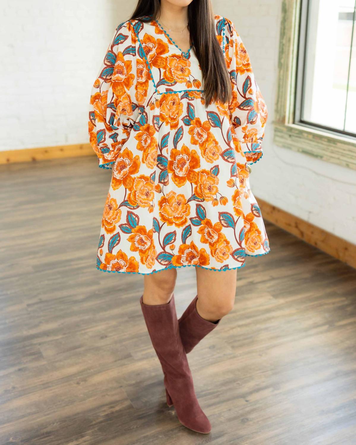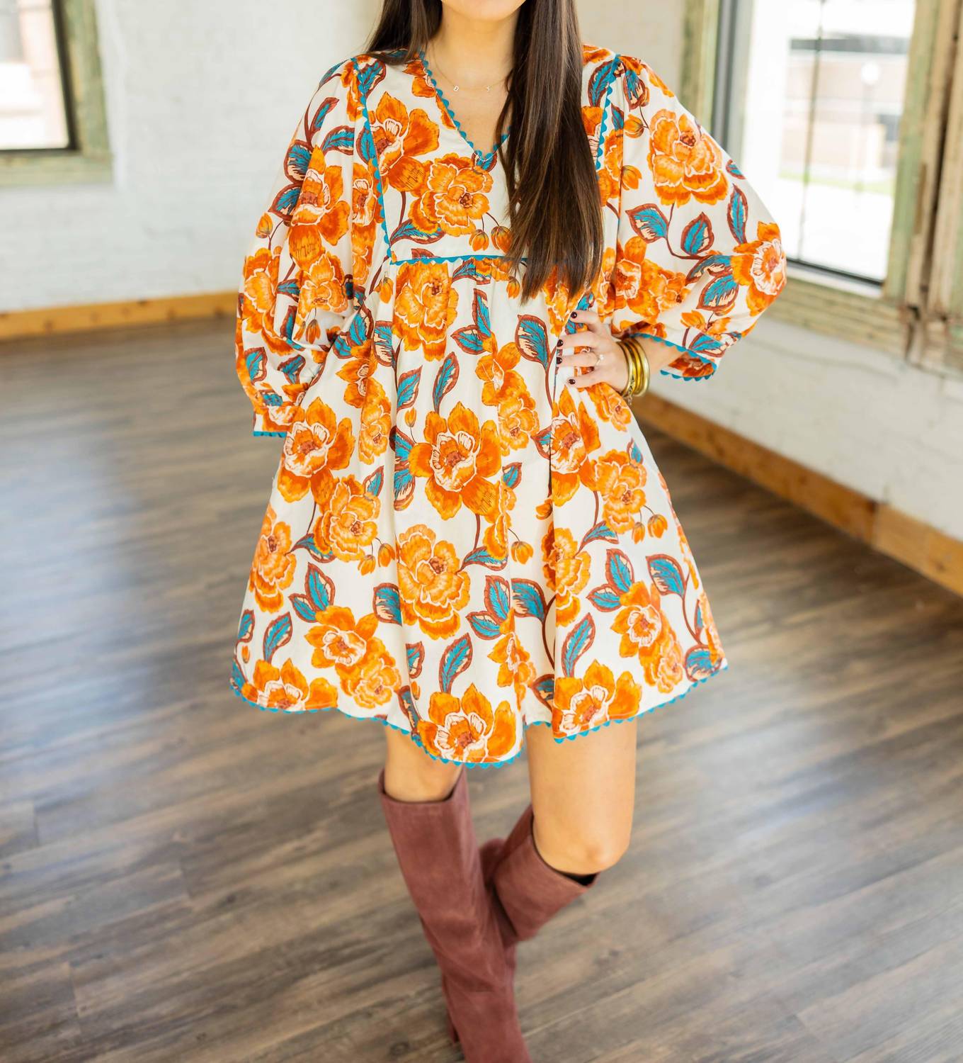 The pefect long sleeve dress for those cooler months. Embrace the spirit of autumn with the Noa Floral Pullover Mini Dress by Entro, a delightful choice for those who love boho chic trends. This dress features three-quarter sleeves and a V-neckline, crafted from 100% cotton with a lining of 100% polyester. Featuring a vibrant orange and teal floral pattern, the dress showcases a charming rick-rack trim against an amber cream background. With pull-on closure and an oversized fit, it's both stylish and comfortable, making it ideal for fall festivals or casual outings. This mini dress is effortlessly practical with additional pockets, making it a versatile and fun wardrobe addition. Model Kayla is wearing a medium, and for more length, consider sizing up.
