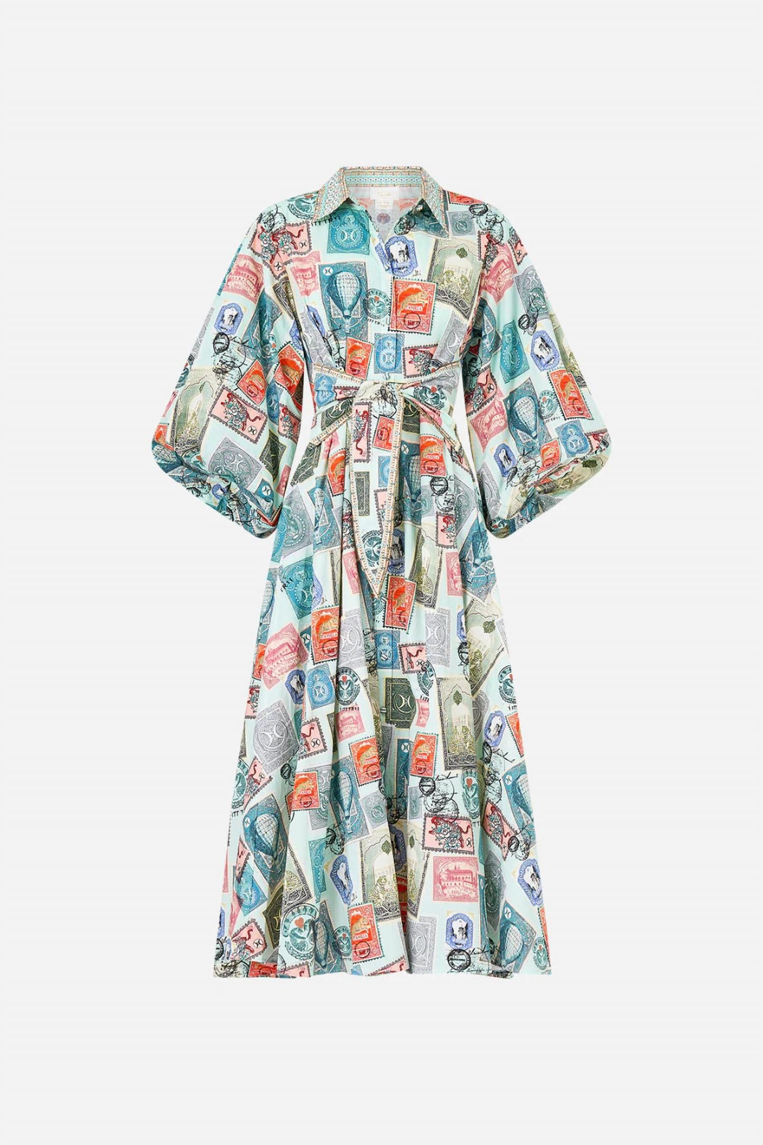 Pair with your favorite sandals for an effortlessly chic look. Introducing the With Love From Turkiye Waist Tie Shirt Dress by Camilla, a boho chic masterpiece with short bubble sleeves for a touch of volume. Expertly crafted from 100% organic cotton, this dress features an exclusive floral print, perfect for spring vacation style. With a midi hemline and button front closure, it includes back shirring and adjustable front ties to enhance comfort and femininity. Made with care, this shift dress boasts a collar neckline, ideal for a casual yet chic look.