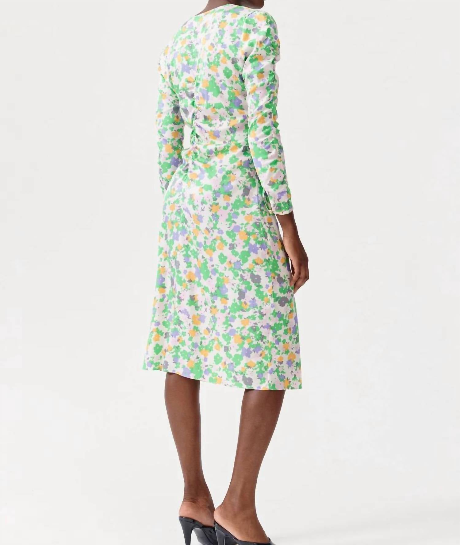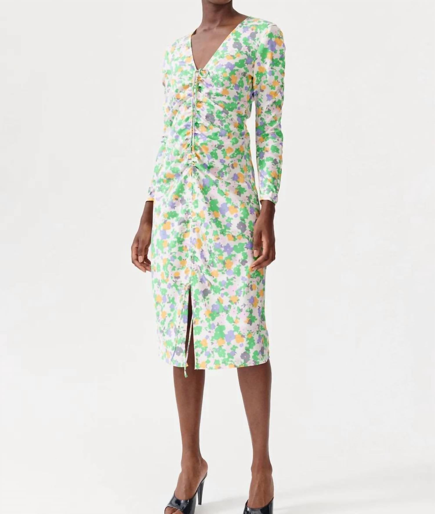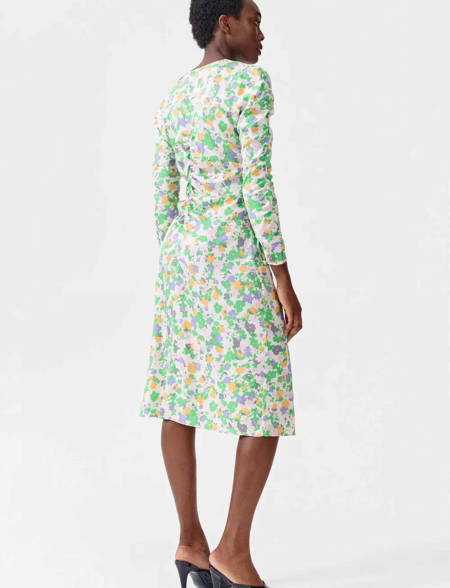 The perfect length dress does exist. Introducing the Aditri Dress by Baum und Pferdgarten, a statement piece for your Spring wardrobe. Designed in a vibrant Garden Floral pattern, this midi-length dress features an A-line silhouette with a V-neckline and three-quarter sleeves, capturing the essence of Boho Chic. Crafted from a luxurious silk blend material (96% silk, 4% elastane), it presents a refined pull-on closure. For maintenance, dry cleaning is recommended, as the dress should not be machine washed, bleached, or tumble dried; iron at up to 110°C if needed.
