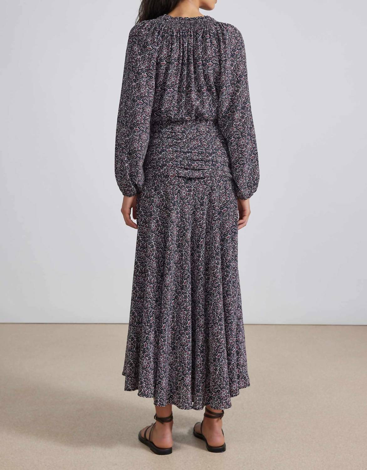 Style this maxi with your favorite statement necklace and sandals for the perfect look. Introducing the Esparta Maxi Dress by APIECE APART, an exquisite evening piece in Night Garden Black. This long-sleeve dress is made from 100% silk, featuring a chic crew neckline and a flattering ruched waist that leads into an A-line silhouette with an asymmetrical hem. Dress up for your next evening event or Christmas celebration with its elegant floral pattern and button closure. For best results, dry clean only to maintain its quiet luxury allure.