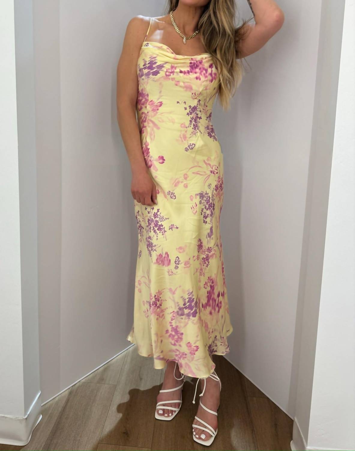 Just add slides or mules and you are good to go. Discover the Elyria Satin Midi Dress by French Connection, an exquisite choice in multi-colored floral perfect for a boho chic summer look. This sleeveless dress showcases a draped cowl neck and a graceful bodycon silhouette with a flowy midi-length skirt. Made from luxurious satin, it features a convenient zip closure. Care for this dreamy piece through dry cleaning to maintain its elegance, making it ideal for both evening events and romantic occasions like Valentine's Day.