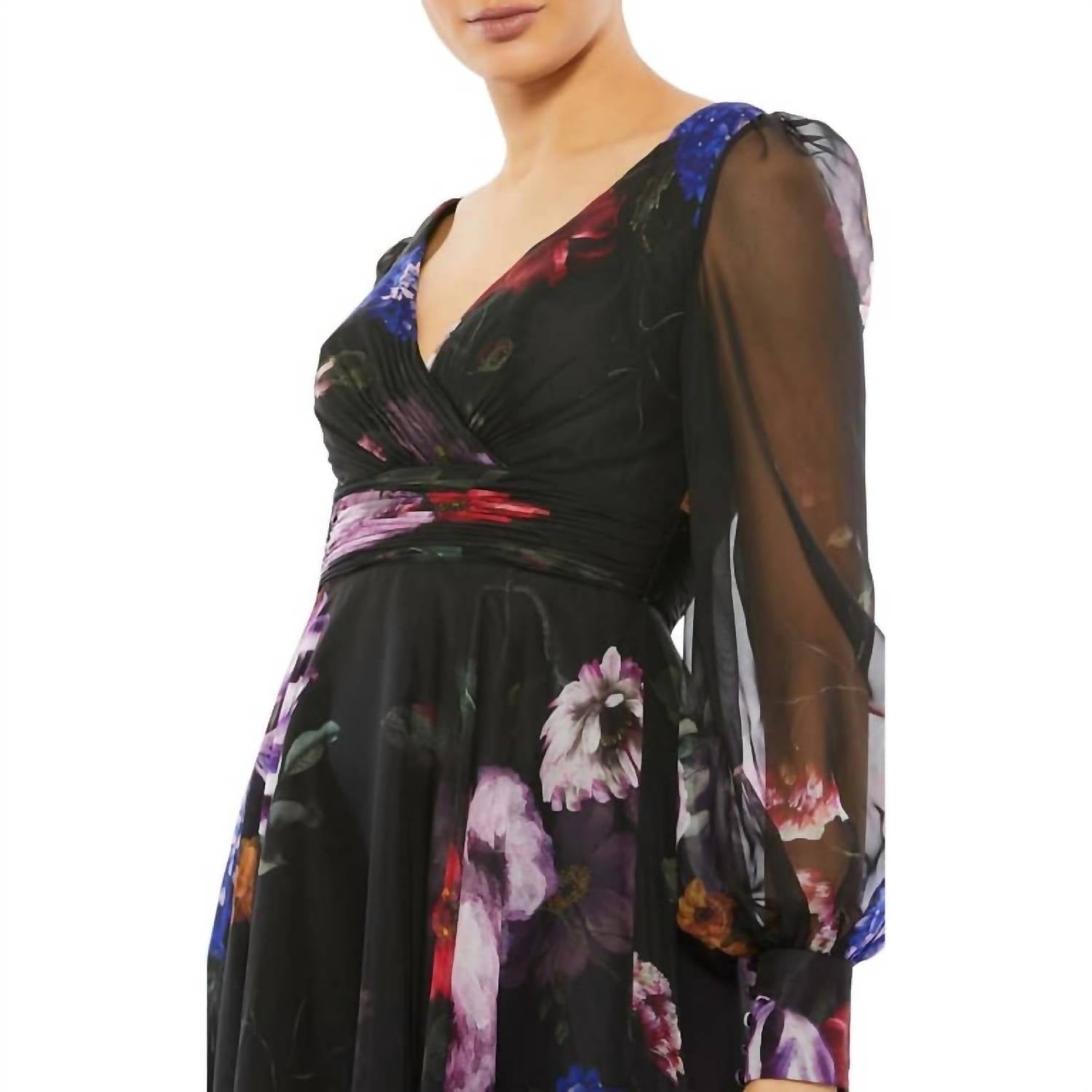 Designed for the bride who values understated elegance. Its classic design and perfect fit make it the ideal choice for your special day. Say yes to the dress! Meet the Chiffon Bishop Sleeve Floral Print Gown by MAC DUGGAL, a statement piece perfect for wedding occasions. This luxurious gown features long sheer bishop sleeves and a V-neck design, finished with a pleated bodice for added elegance. Crafted from 100% polyester, it measures approximately 62.5 inches from shoulder to hem. Closure: Concealed back zip. Care: Spot clean. Origin: Imported. Available in Black Multi.