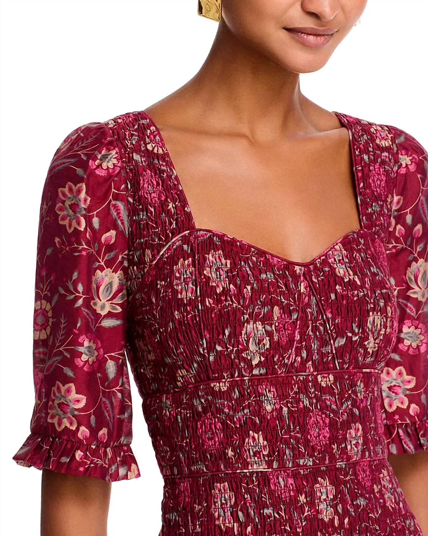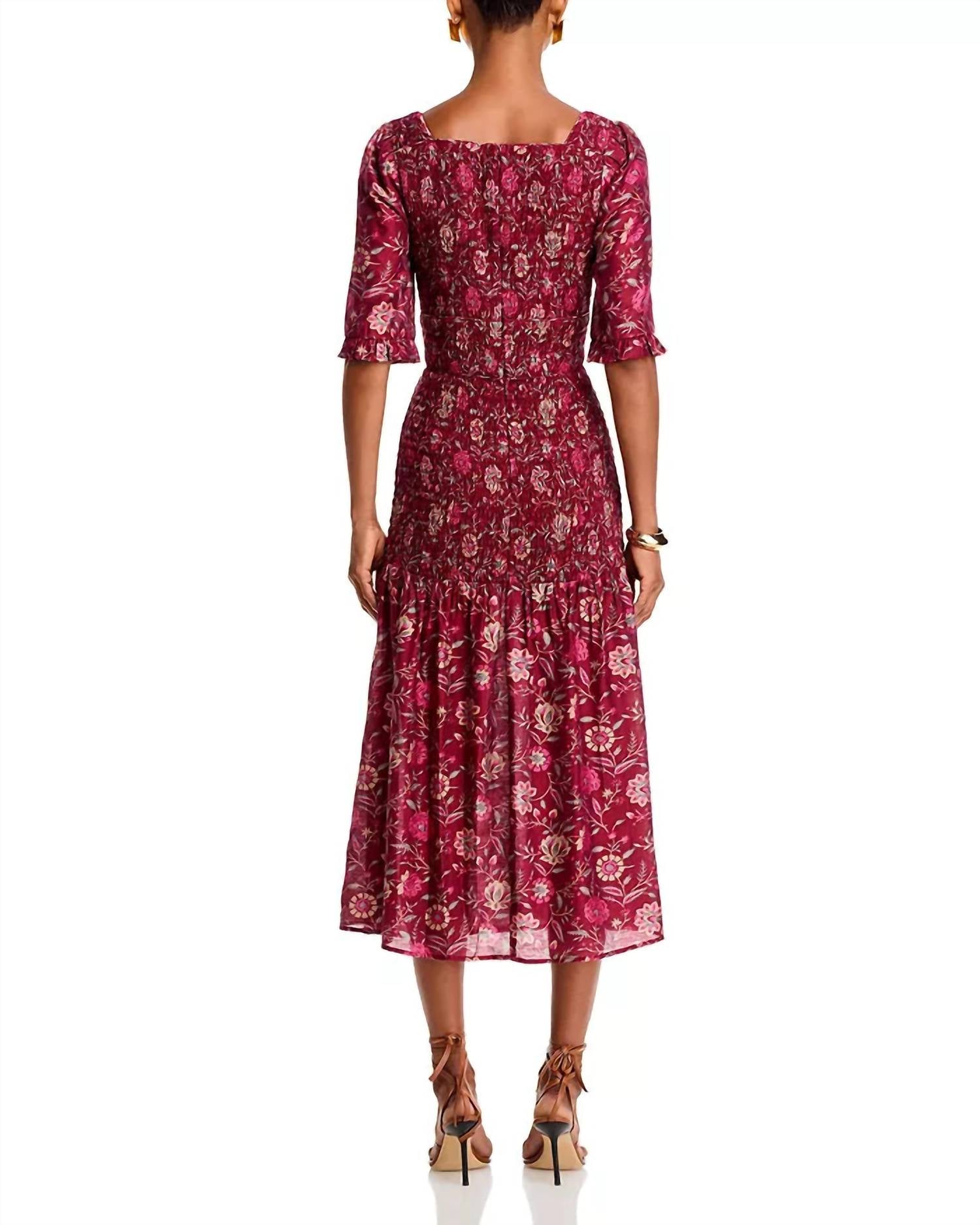 A midi dress so versatile, your options for wearing it are endless. Introducing the Famke Print Heart Neck Dress by SEA, a striking magenta dress adorned with a charming floral pattern. This elegant A-line silhouette features a sweetheart neckline and elbow-length sleeves, with a shirred bodice that extends to the hips. The dress is crafted from a luxurious viscose blend, with a cotton lining for added comfort, and features an invisible back zip closure. Care for this exquisite garment by dry cleaning only, ensuring it remains a timeless addition to your wardrobe.