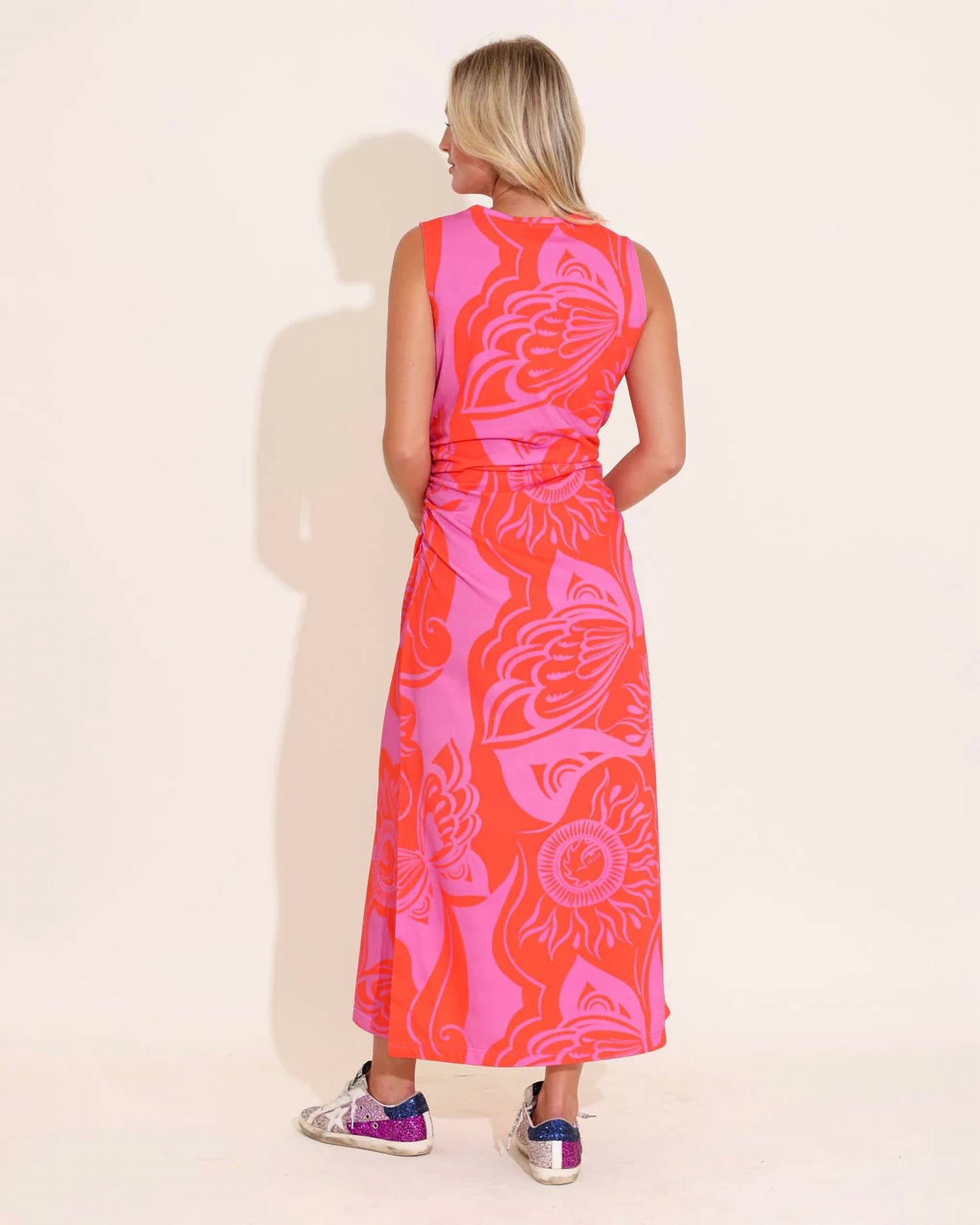 A maxi dress that is just as cute as it is comfortable. The Georgia Dress by Alden Adair is a sleeveless maxi dress crafted from a cotton blend, making it an ideal choice for warm weather. Adorned with a vibrant floral pattern in pink and orange/red hues, this dress effortlessly transitions from sprightly spring days to lively summer gatherings. Featuring a comfortable pull-on closure and a classic crewneck, it embodies effortless elegance. Care instructions include machine washing and tumble drying for easy maintenance.