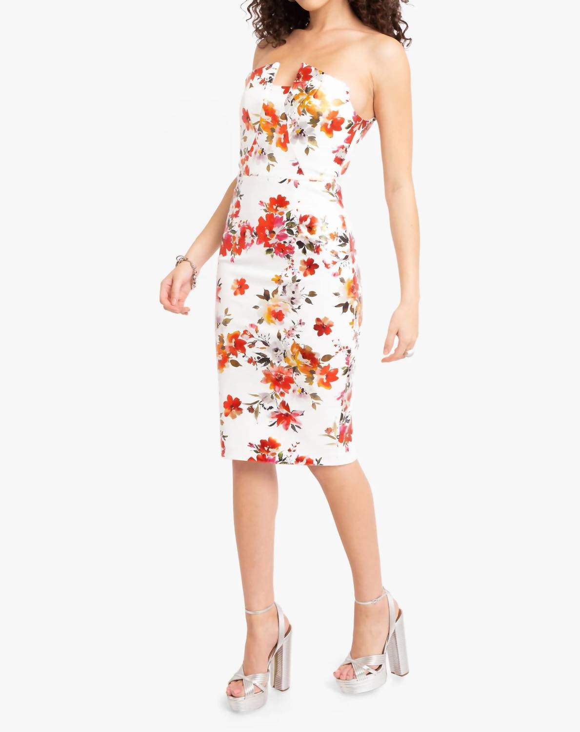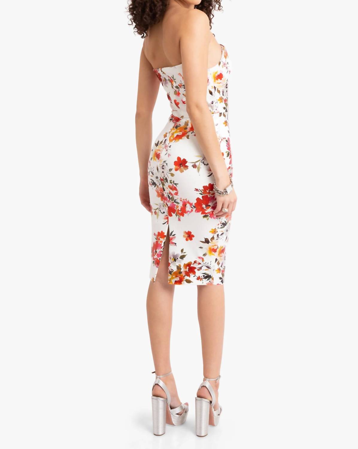 The perfect length dress does exist. Presenting the Lena Sheath Midi Dress by Black Halo, a stunning strapless piece perfect for special occasions like bridal showers and summer weddings. Crafted from 95% Polyamide and 5% Spandex, with a 96% Polyamide and 4% Elastane lining, its lightweight fabric and floral design ensure a flattering fit. Originating from the USA with imported materials, this dress features a discreet zip closure. For care, dry clean with care to maintain its pristine condition. Available in sizes 0 through 22 with bust measurements ranging from 32.5" to 49", waist 25" to 41.5", and low hip 35.5" to 52".