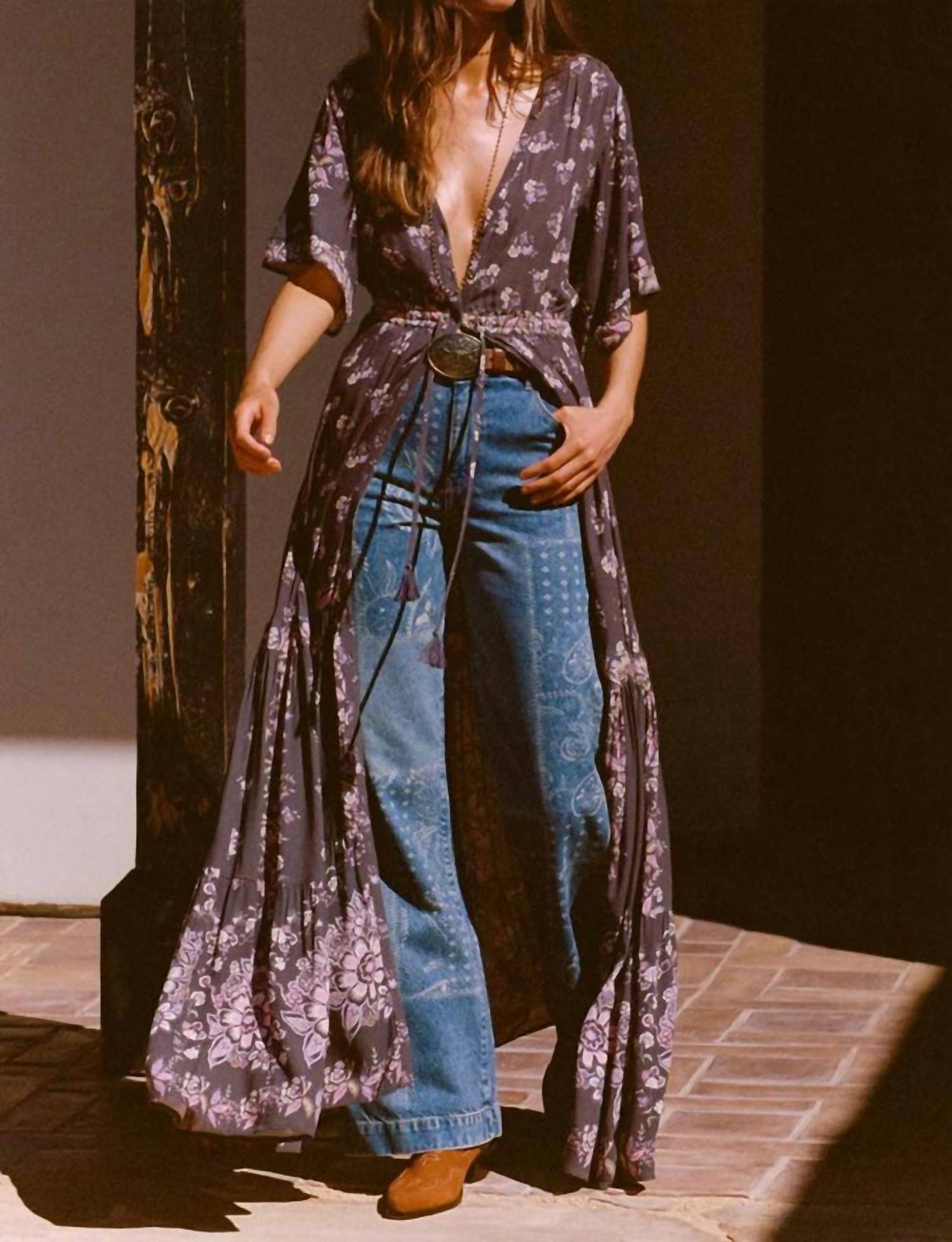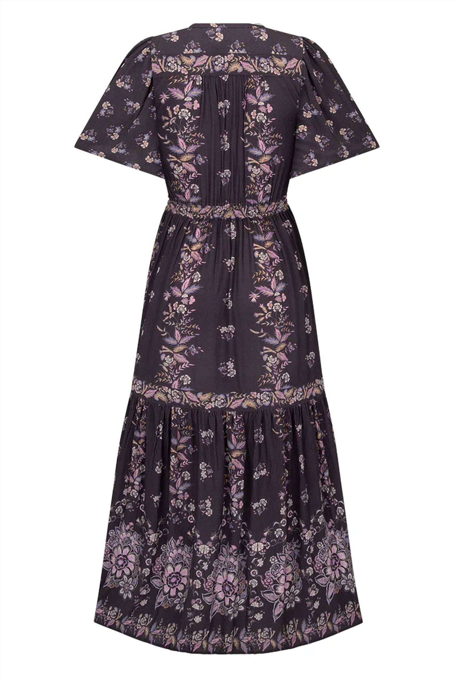 A maxi dress that is just as cute as it is comfortable. Introducing the Spell Rebel Spirit Gown, a stunning women's maxi dress that captures the essence of boho chic. This hyacinth floral gown features short sleeves and a flowy v-neck, with a flattering cinched waist and adjustable tie waist for a perfect fit. Crafted from 100% Lenzing Ecovero Viscose, it offers both comfort and style. Closure is secured with buttons. Care instructions include machine wash cold on a gentle cycle with mild detergent, hang dry in the shade, and avoid wringing or twisting.