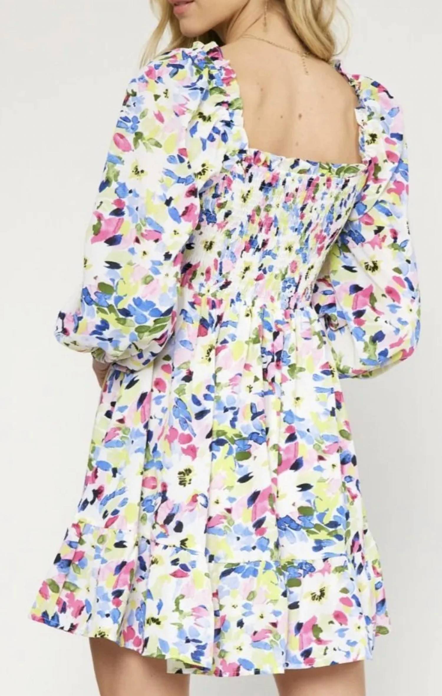 The kind of easy and flattering dress you'll be reaching for all season long. Embrace the essence of summer with the Long Sleeved Print Dress by Entro, featuring a charming floral pattern. This mini, A-line dress boasts a elegant square neckline and long sleeves, exuding boho chic vibes. With a pull-on closure and side pockets, it's both practical and stylish for your vacation wardrobe. Care: Hand wash and line dry for best results. Ideal for women who love to showcase effortless style in a white multi-color palette.