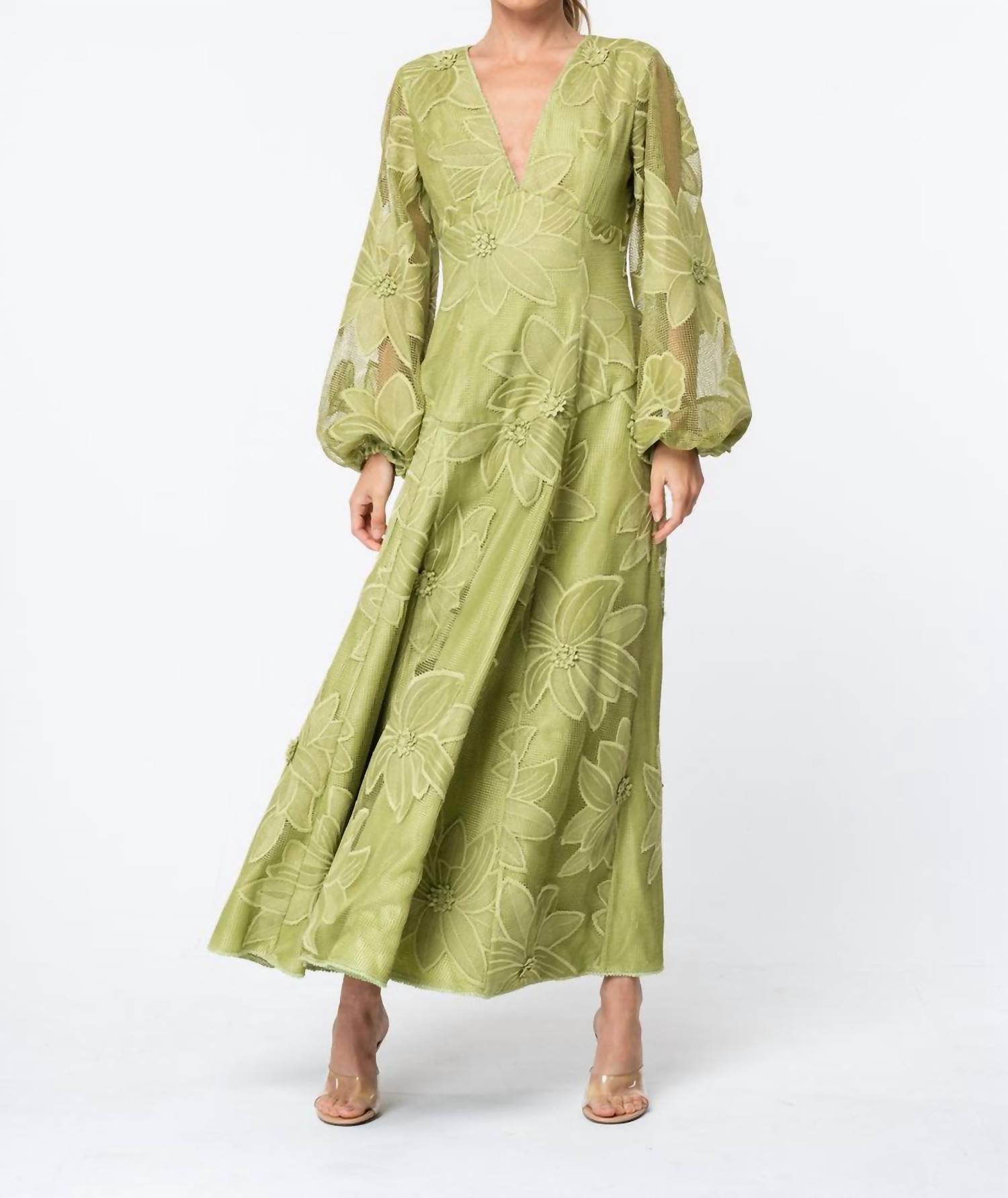 A maxi dress that is just as cute as it is comfortable. The Sarilla Long Sleeve Lace Maxi Dress exudes elegance with its flowing A-line silhouette in a refined green hue. Designed with long sleeves and a delicate floral lace pattern, it features a sophisticated V-neckline that enhances its feminine appeal. Perfect for a variety of occasions, this maxi dress offers timeless grace in a streamlined design without pockets.